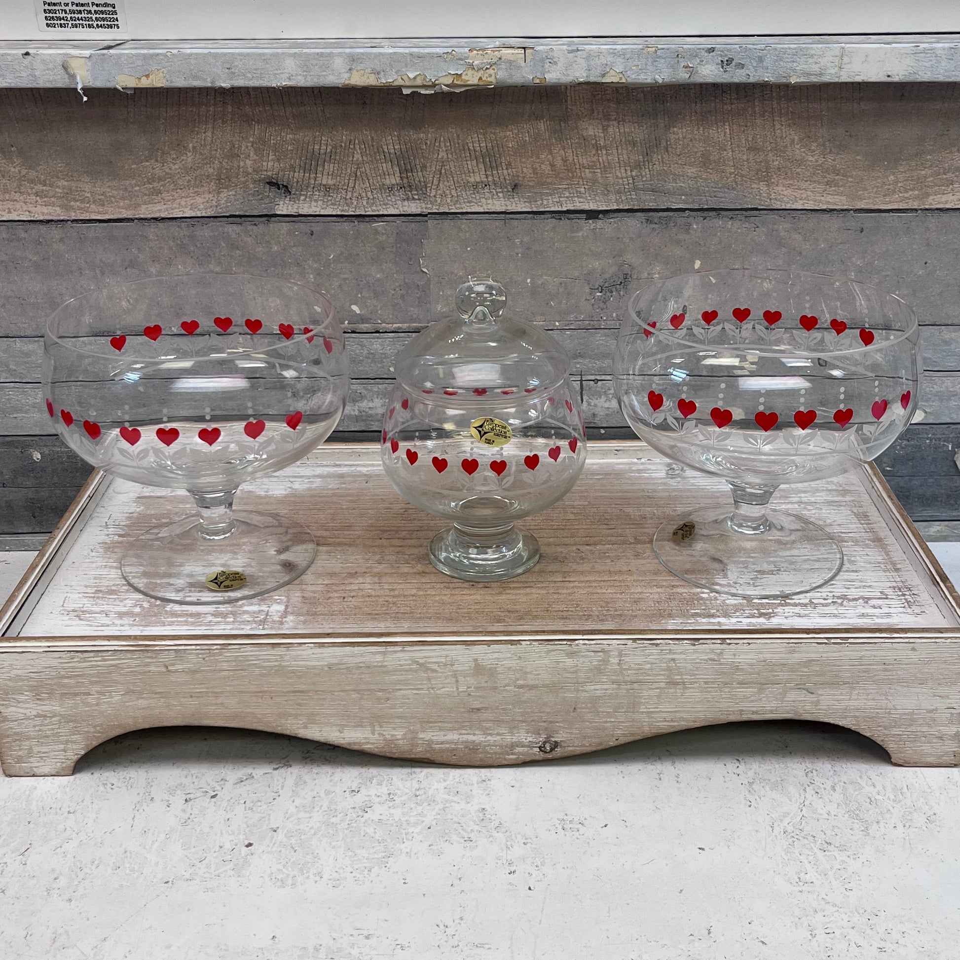 Add elegant vintage appeal to your table or display with this set of three heart pattern crystal compotes from Action Industries’ European Collection. Featuring a delicate Heart and Leaf design, each piece bears the maker’s mark on a sticker and is proudly made in Turkey. All three compotes are in great vintage condition. Perfect for collectors of vintage glassware or anyone looking to add timeless sophistication to their home décor.