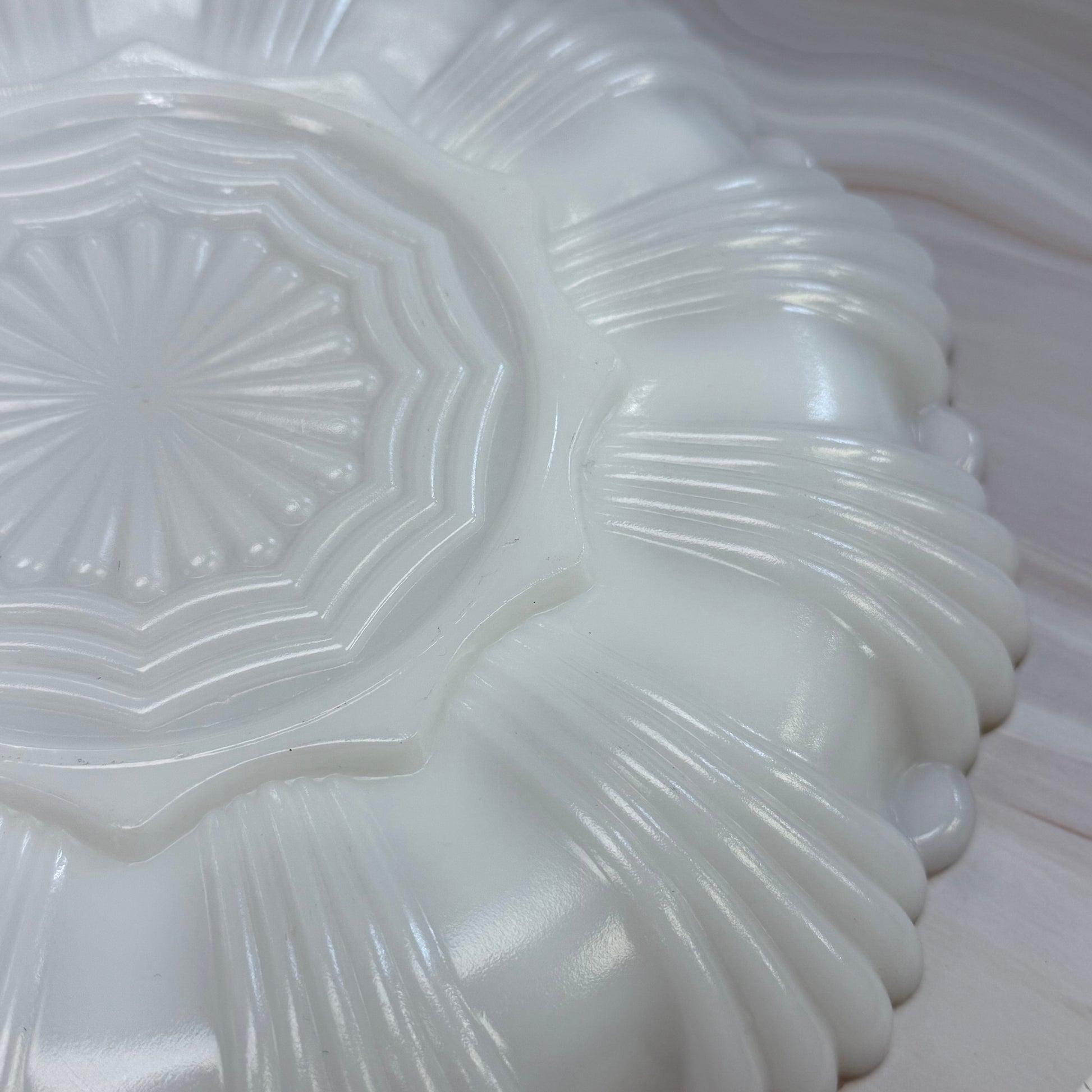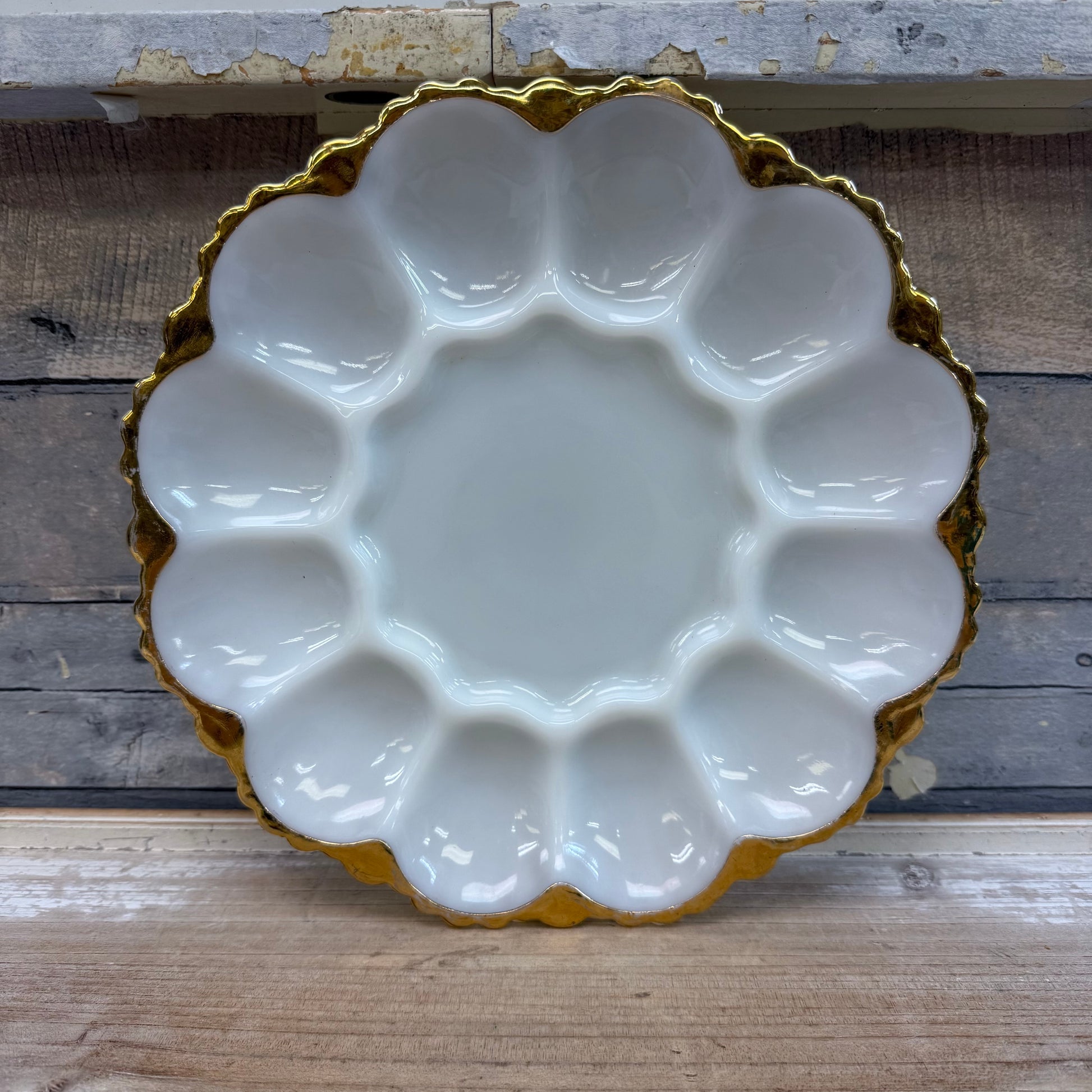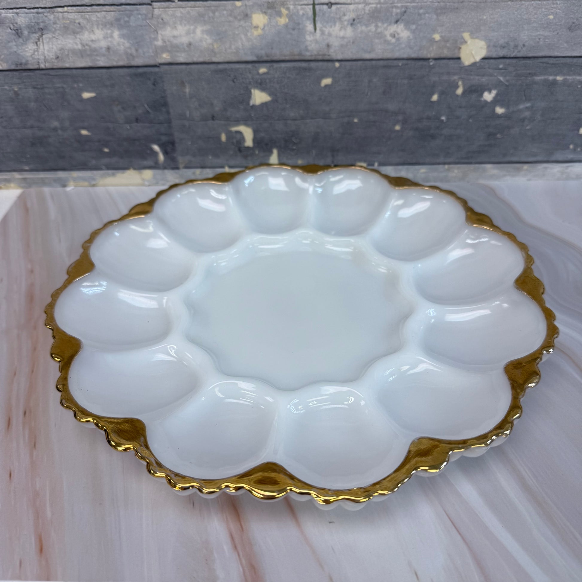 keywords: Anchor Hocking, milk glass, gilded serving tray, deviled egg tray, vintage tableware, collectible glassware, antique kitchenware, party serving dish, elegant milk glass, retro serving piece