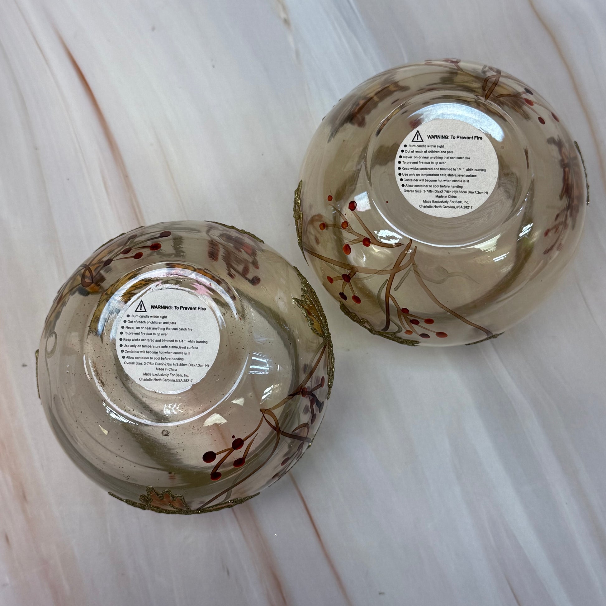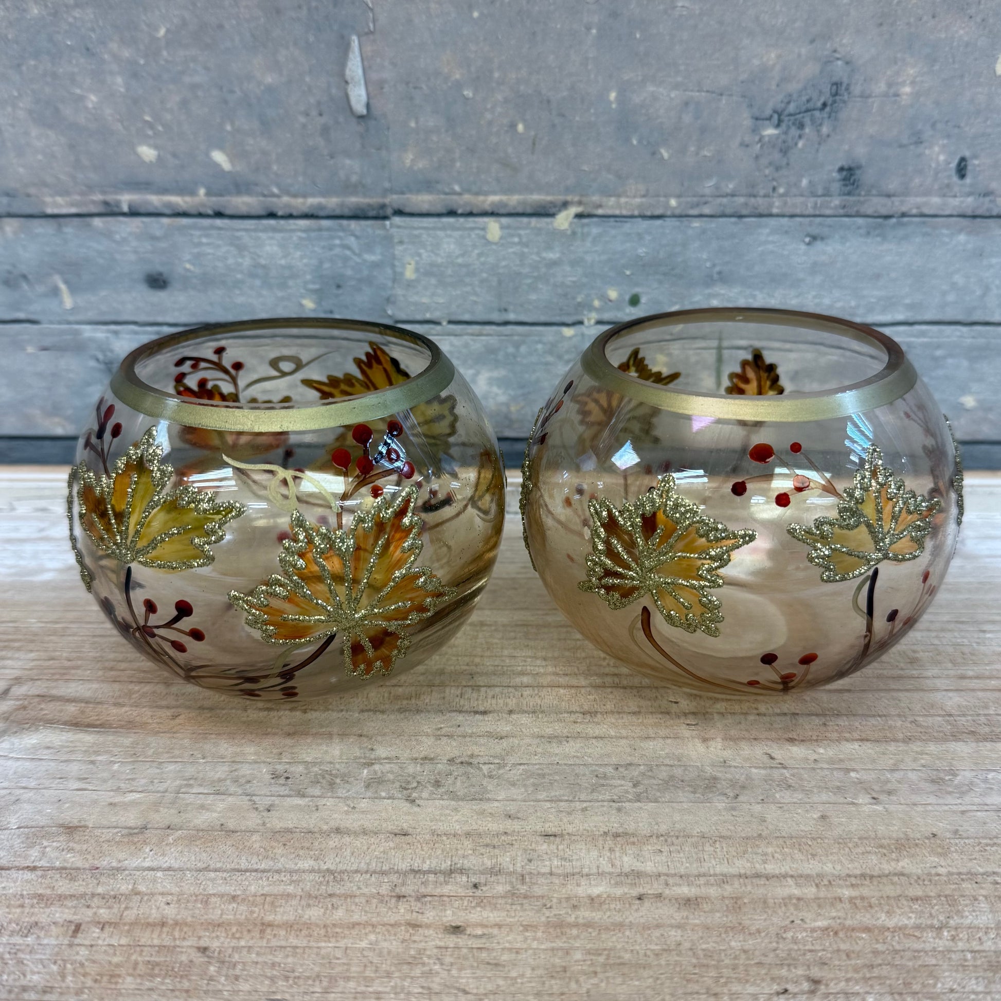 Add a touch of seasonal charm with this Autumn Leaves Glass Votive Holders, Set of 2. These festive votives feature 3-D glittered leaf details, capturing the warm colors and textures of fall. In great vintage condition, they are perfect for creating cozy ambiance, holiday décor, or a charming tabletop centerpiece.