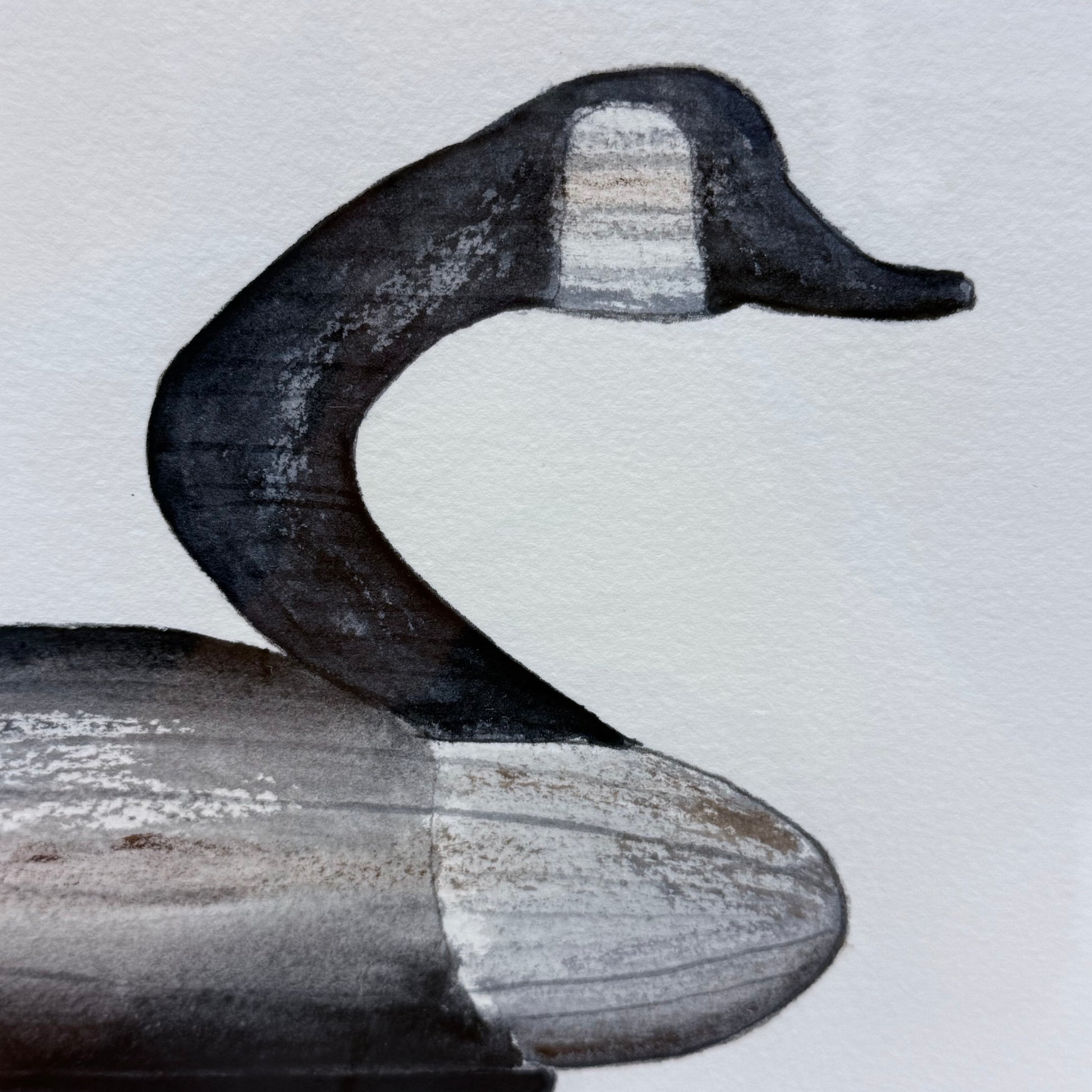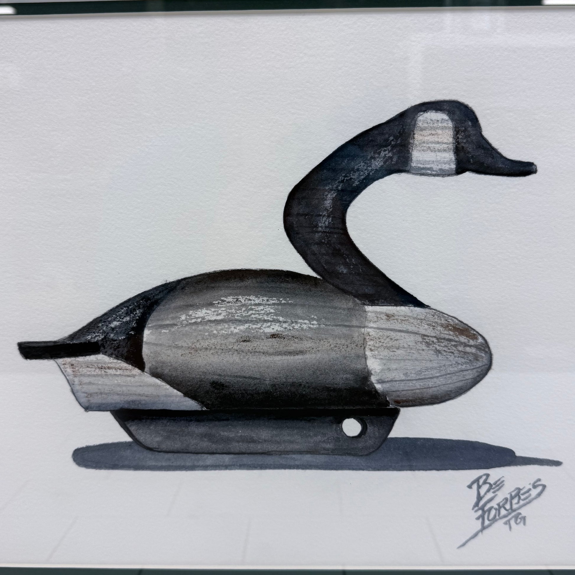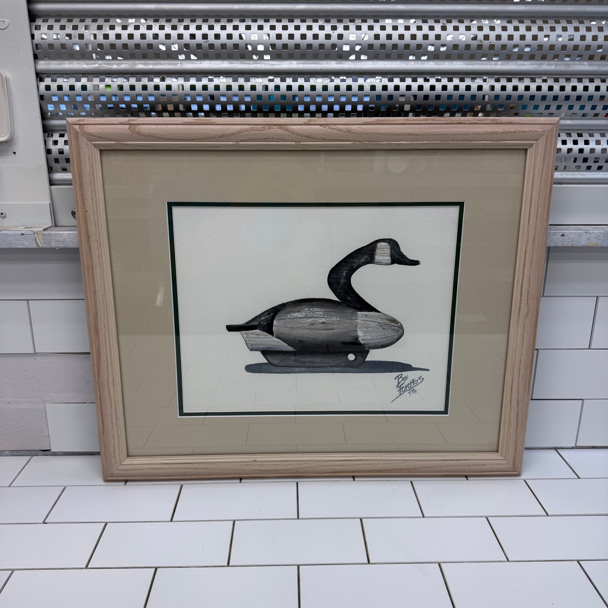 This original wildlife artwork by B. Forbes, signed and dated 1991, features a finely rendered Canada goose hunting decoy presented in a minimalist composition that highlights the craftsmanship and heritage of traditional carved waterfowl decoys. Executed with subtle shading and tonal depth, the piece emphasizes the decoy’s carved form, weighted keel, and classic silhouette, celebrating North American sporting traditions and decoy carving artistry. Bearing a live artist signature reading “By Forbes ’91,” this is an original hand-created work, professionally matted and framed for display. Ideal for hunting lodges, coastal homes, cabins, or collectors of wildlife and sporting art, this vintage piece offers both decorative appeal and cultural significance. Offered in good vintage condition with minor wear consistent with age and use.