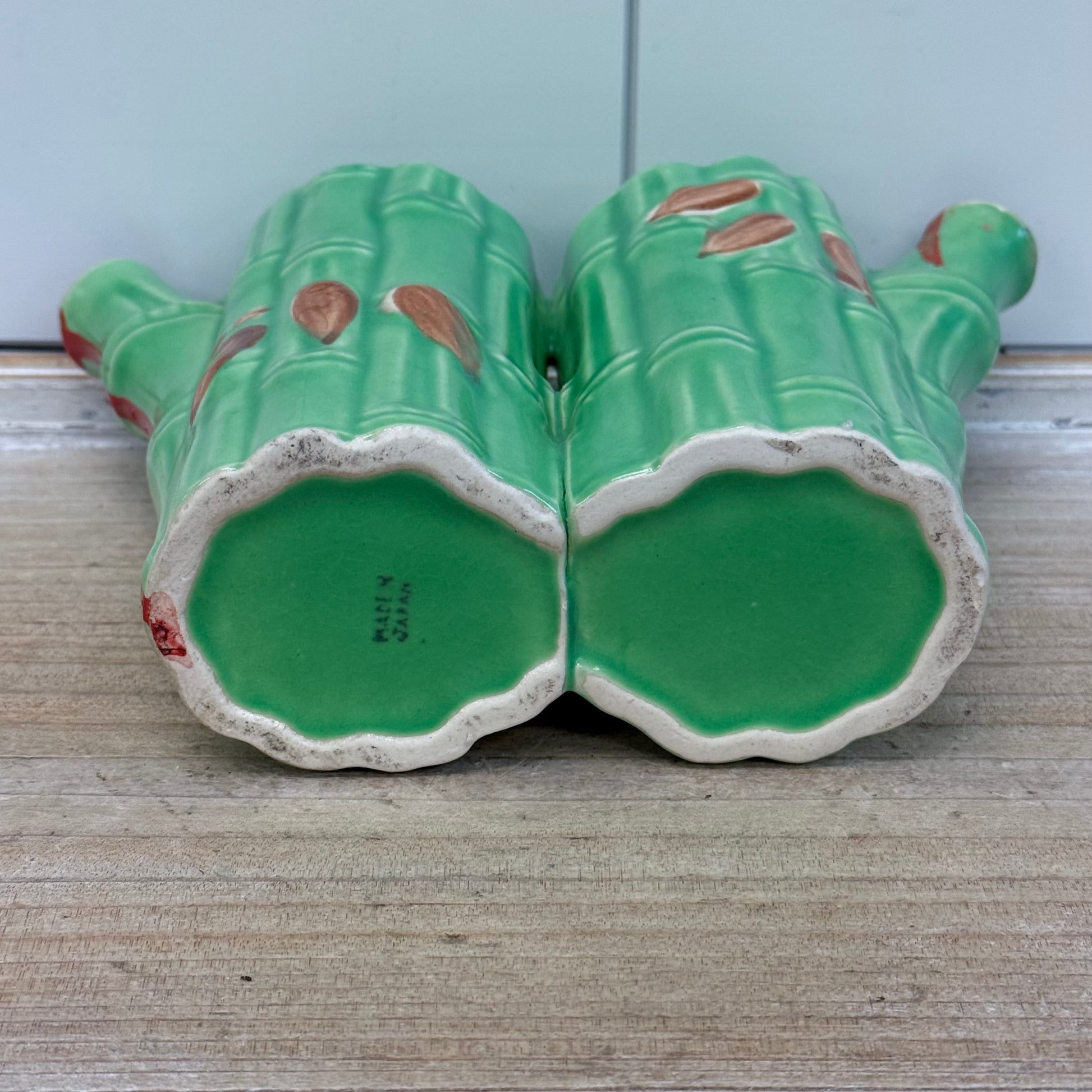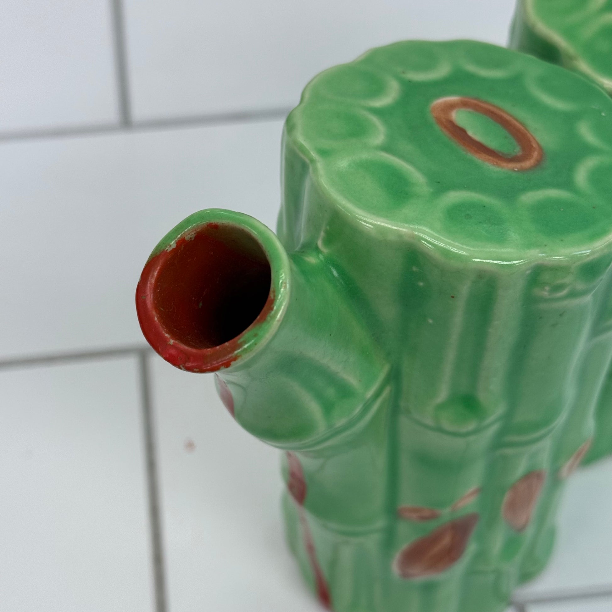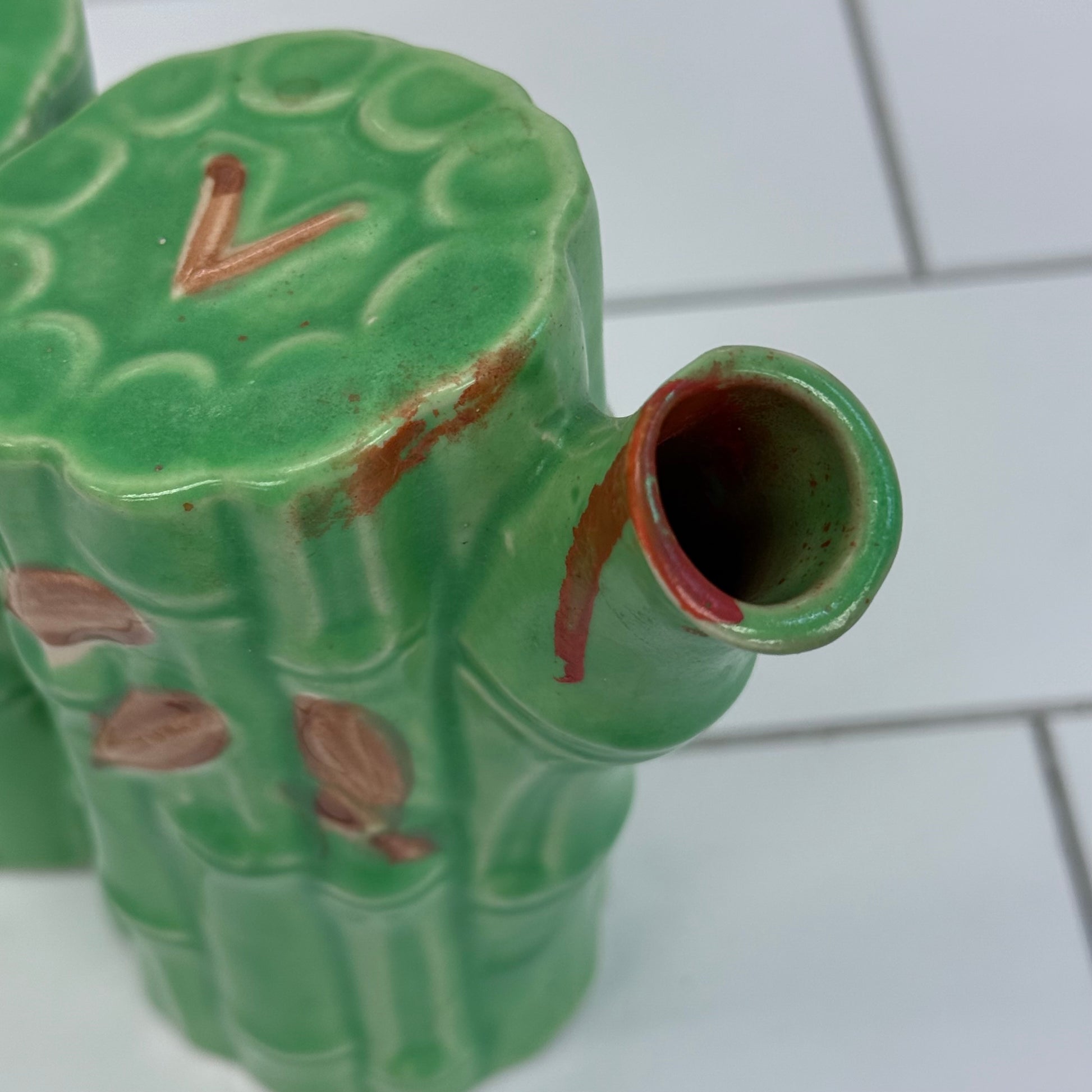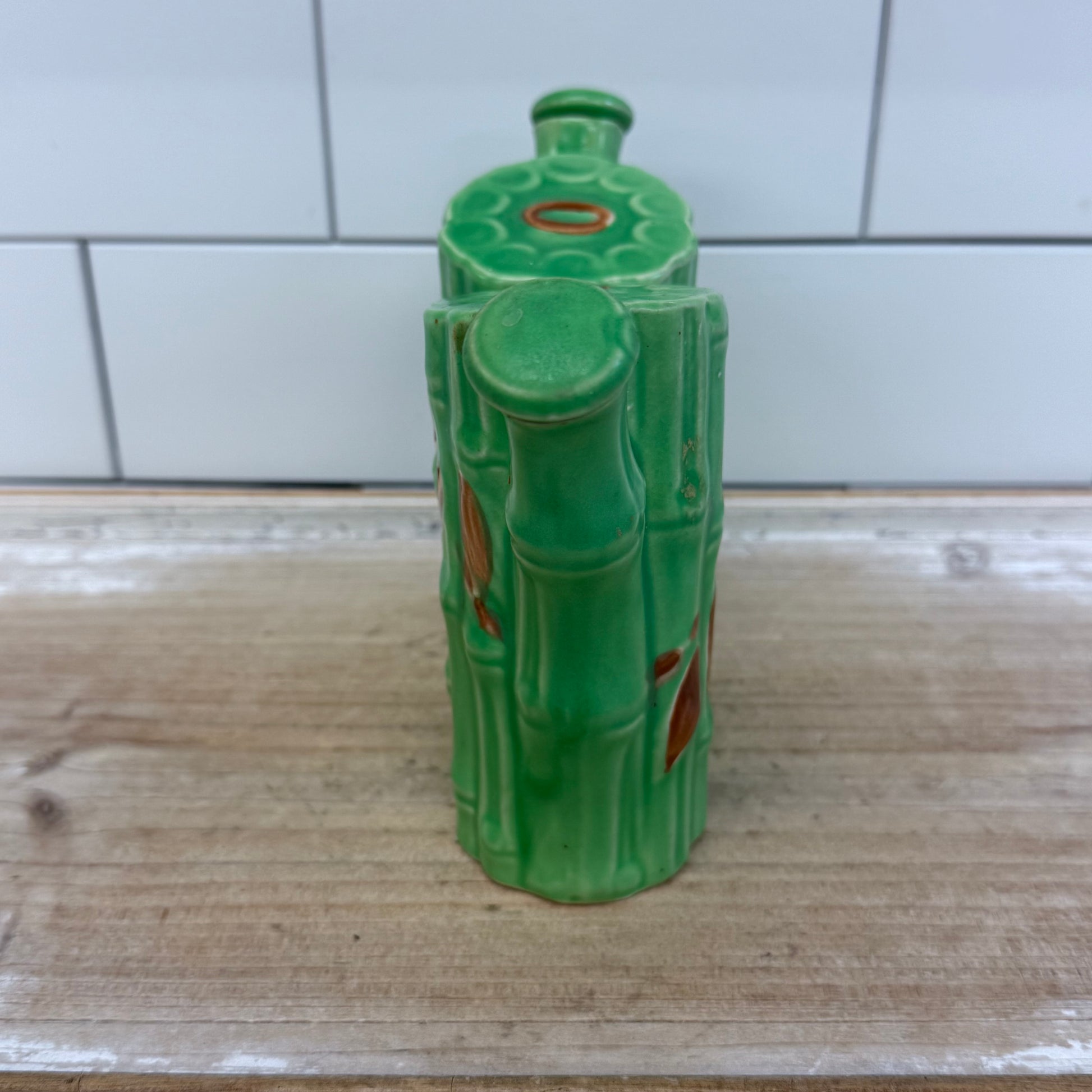 Bring natural elegance to your table with this Bamboo Shaped Ceramic Oil & Vinegar Cruet. Handcrafted with a charming bamboo-inspired design, this vintage ceramic piece beautifully captures the organic look of bamboo stalks while serving a practical purpose. Marked “Made in Japan” on the underside, it reflects classic mid-century Japanese craftsmanship. Measuring 8″×3″×6″, it’s in good vintage condition with minor wear consistent with age and use—perfect for adding a touch of vintage Asian-inspired style to your kitchen or dining collection.