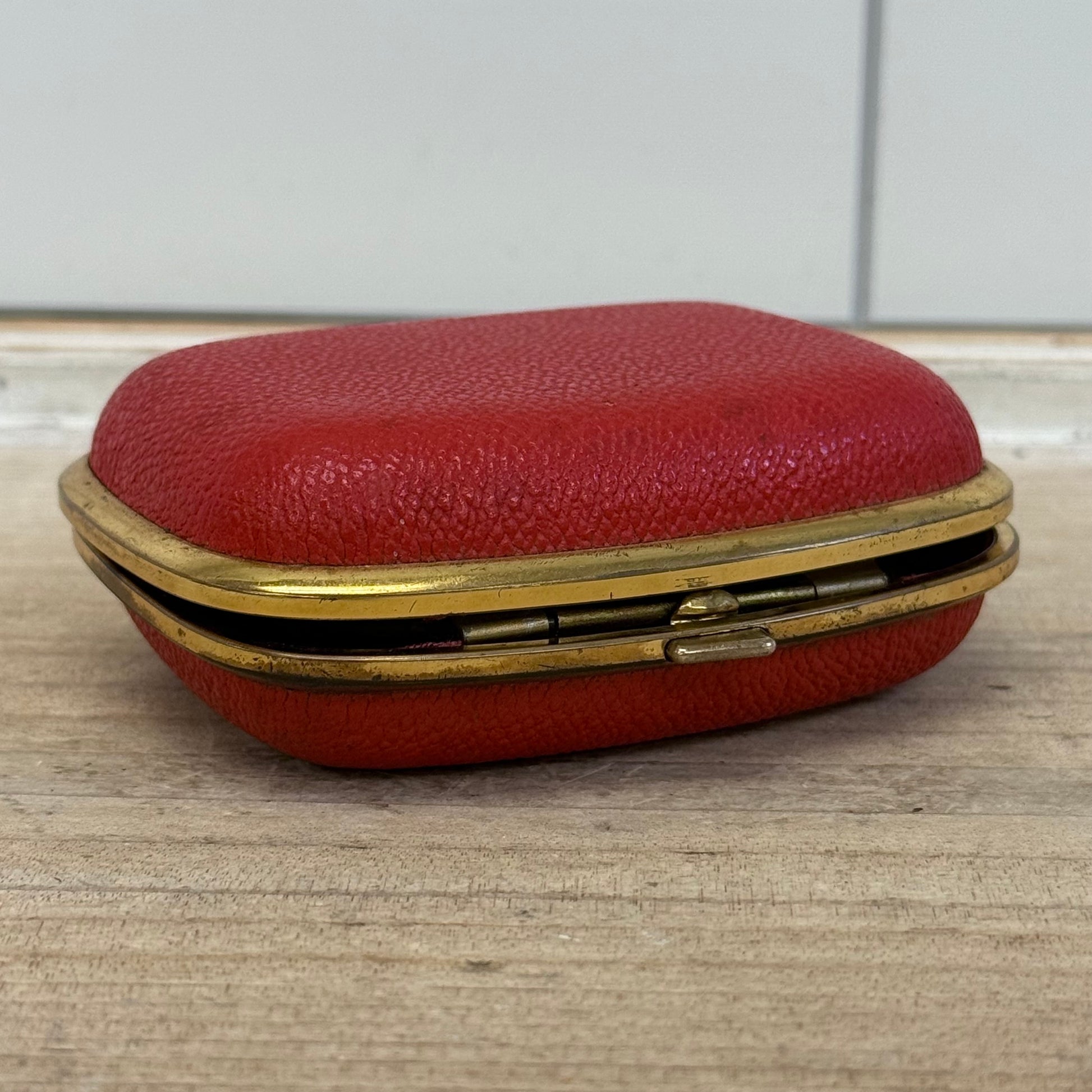 Stylish and compact, this Bradley Mechanical Travel Alarm Clock in its striking red leather case captures the elegance of vintage travel accessories. Made in Germany, it features the maker’s mark on both the clock face and backside, reflecting precision craftsmanship and timeless design. The clock folds neatly into its red leather case for easy portability—measuring 4”x3”x2” when closed and 3”x4”x3” when open—and has been tested and works perfectly. In good vintage condition with minor wear consistent with age and use, this piece is both a functional timepiece and a charming collectible.