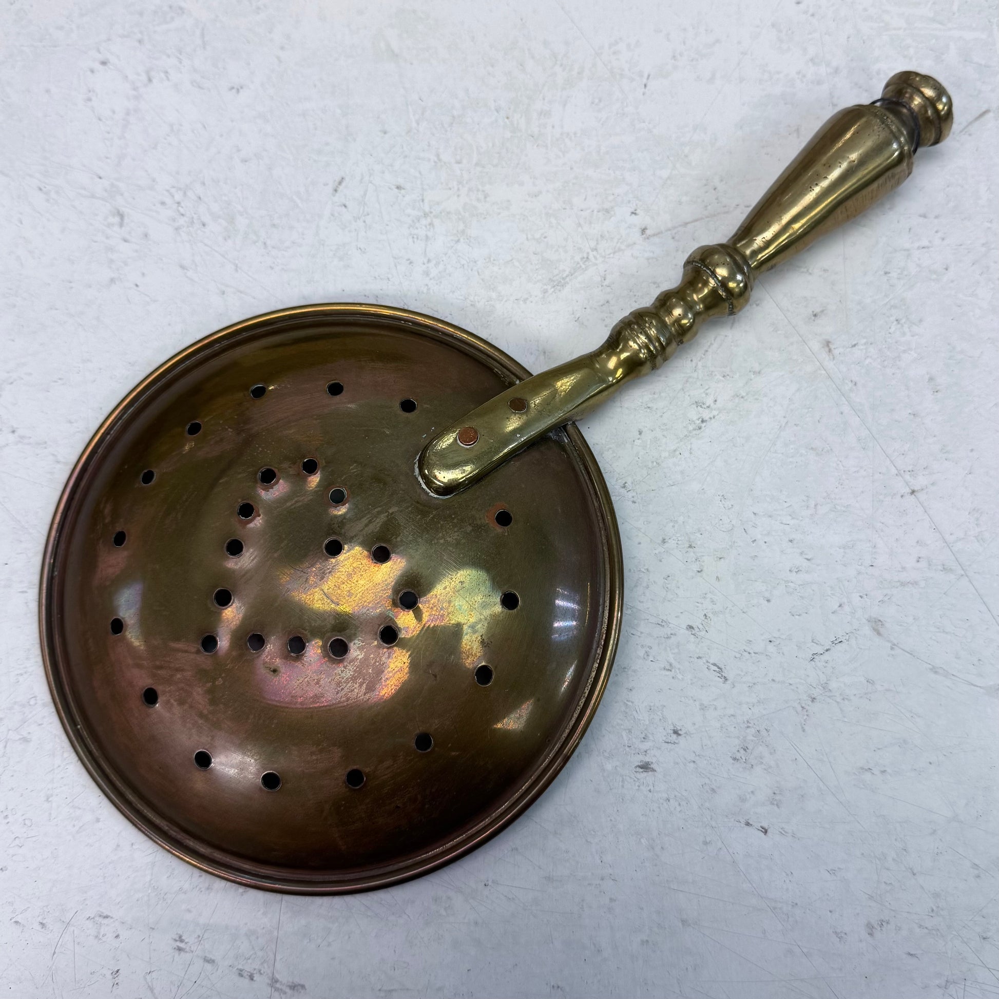 keywords: brass cream skimmer, vintage kitchenware, heart-shaped design, farmhouse décor, collectible kitchen tool, antique skimmer, brass utensil, rustic kitchen, decorative skimmer, mid-century kitchenware