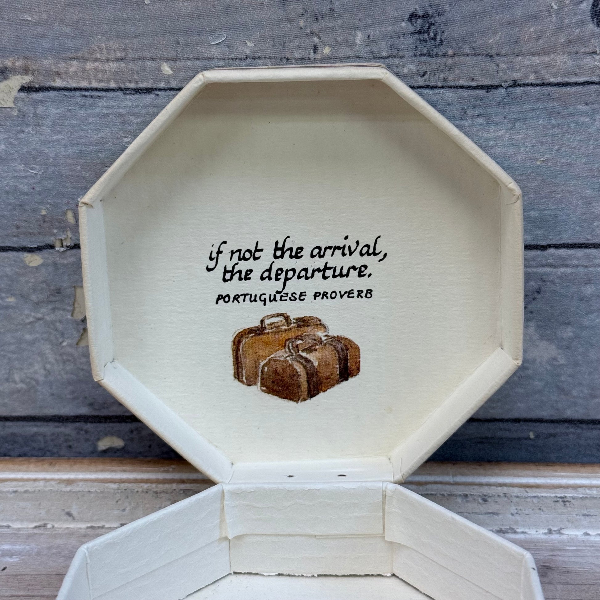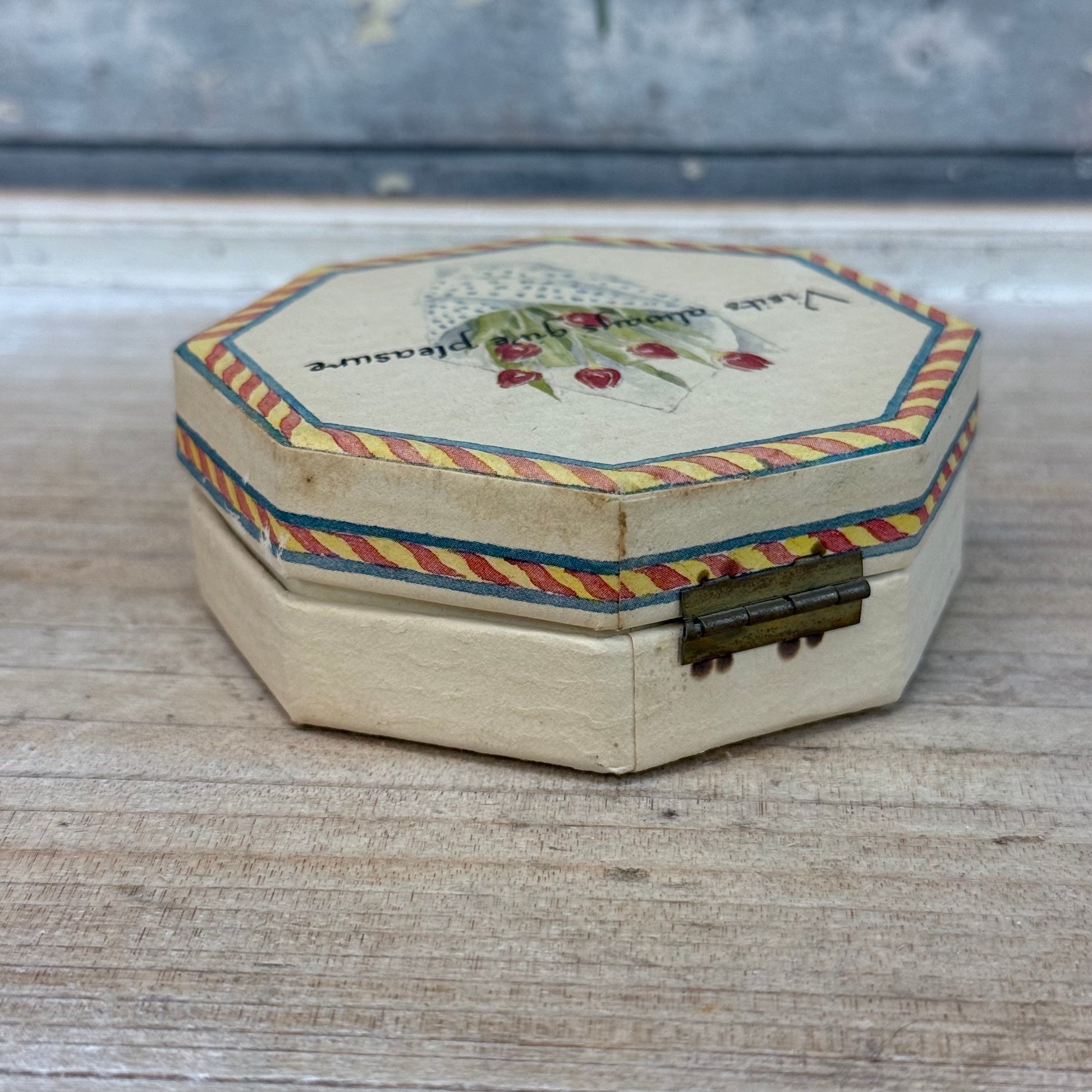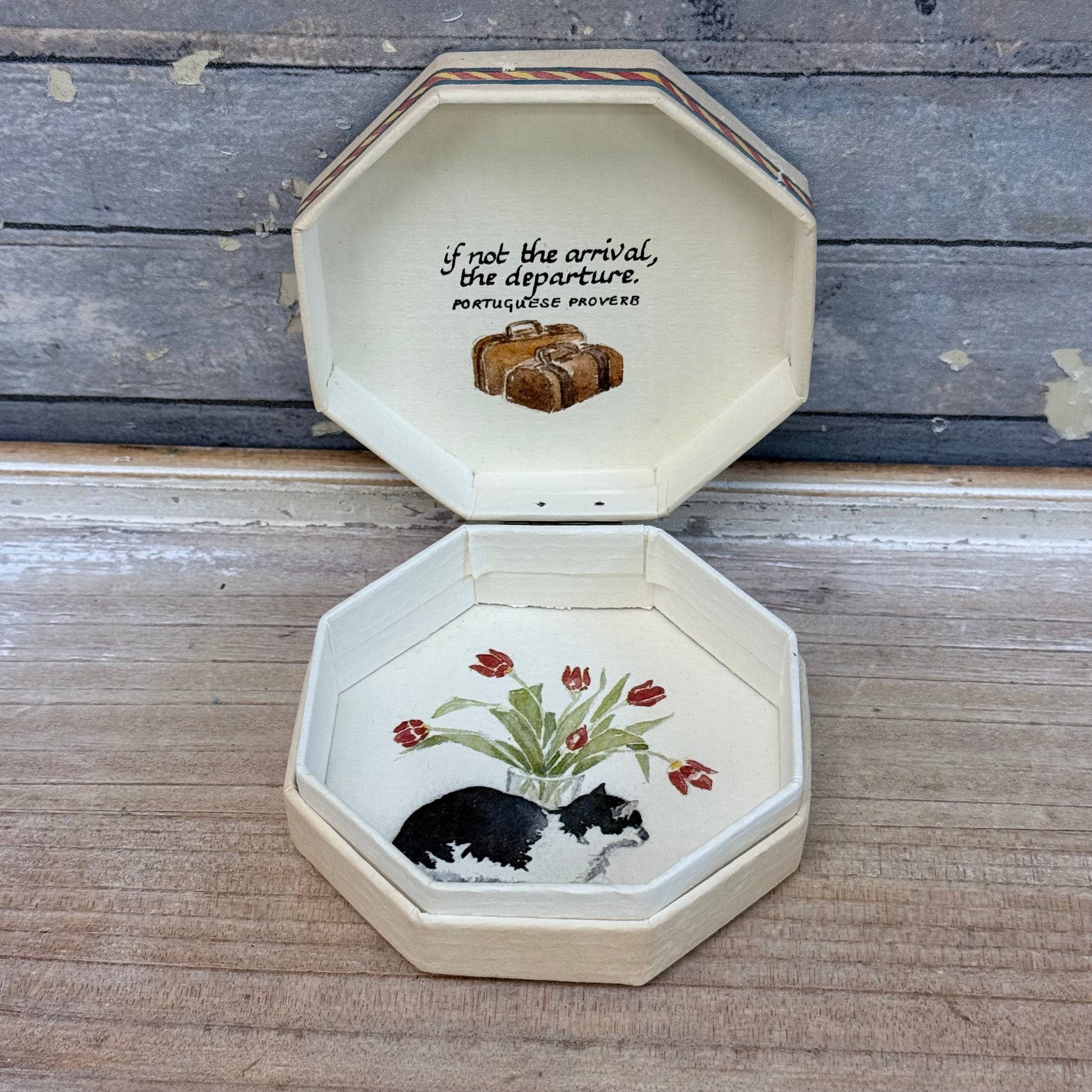 Keywords: Catriona Stewart, hand painted trinket box, 1988 vintage box, collectible box, decorative storage, vintage jewelry box, keepsake holder, artist signed box, painted cardboard box, metal hinge box
