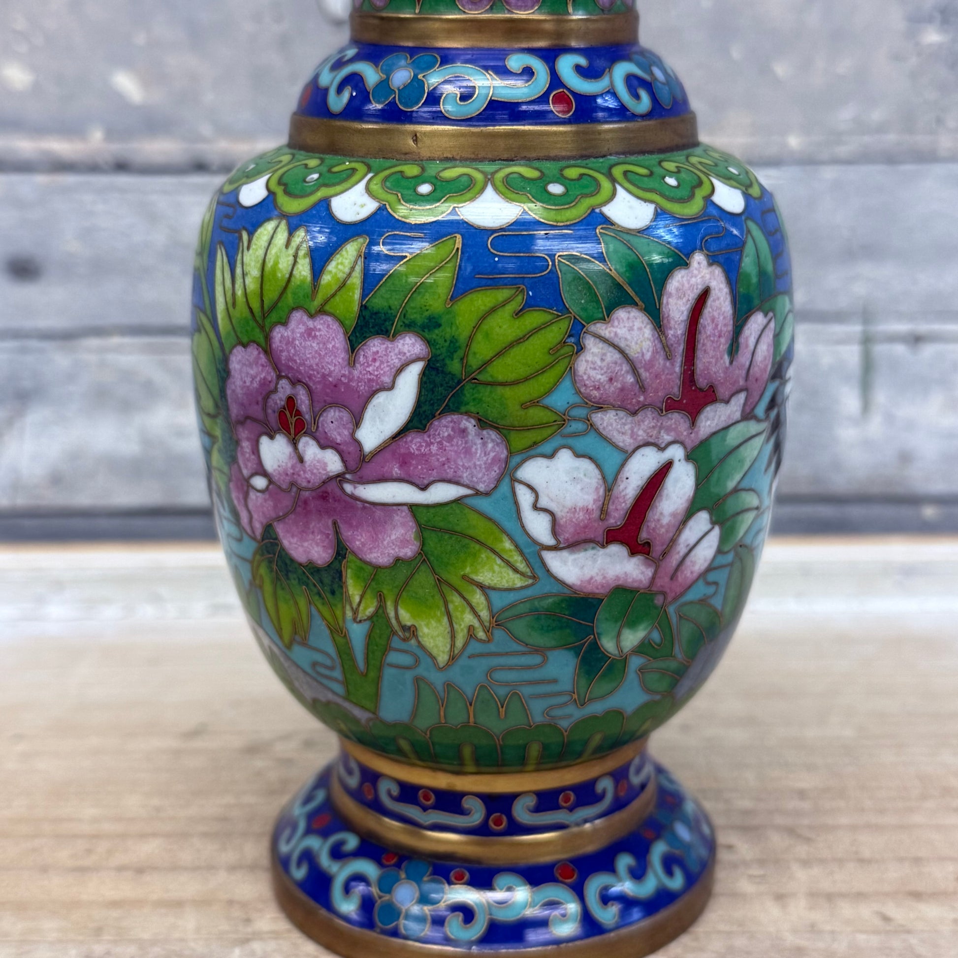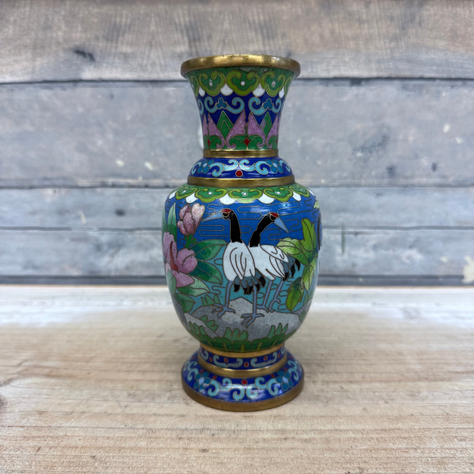 Keywords: cloisonné vase, Chinese decor, lotus flower, crane motif, vintage enamel, Asian art, symbolic design, collectible vase, traditional craftsmanship, decorative piece