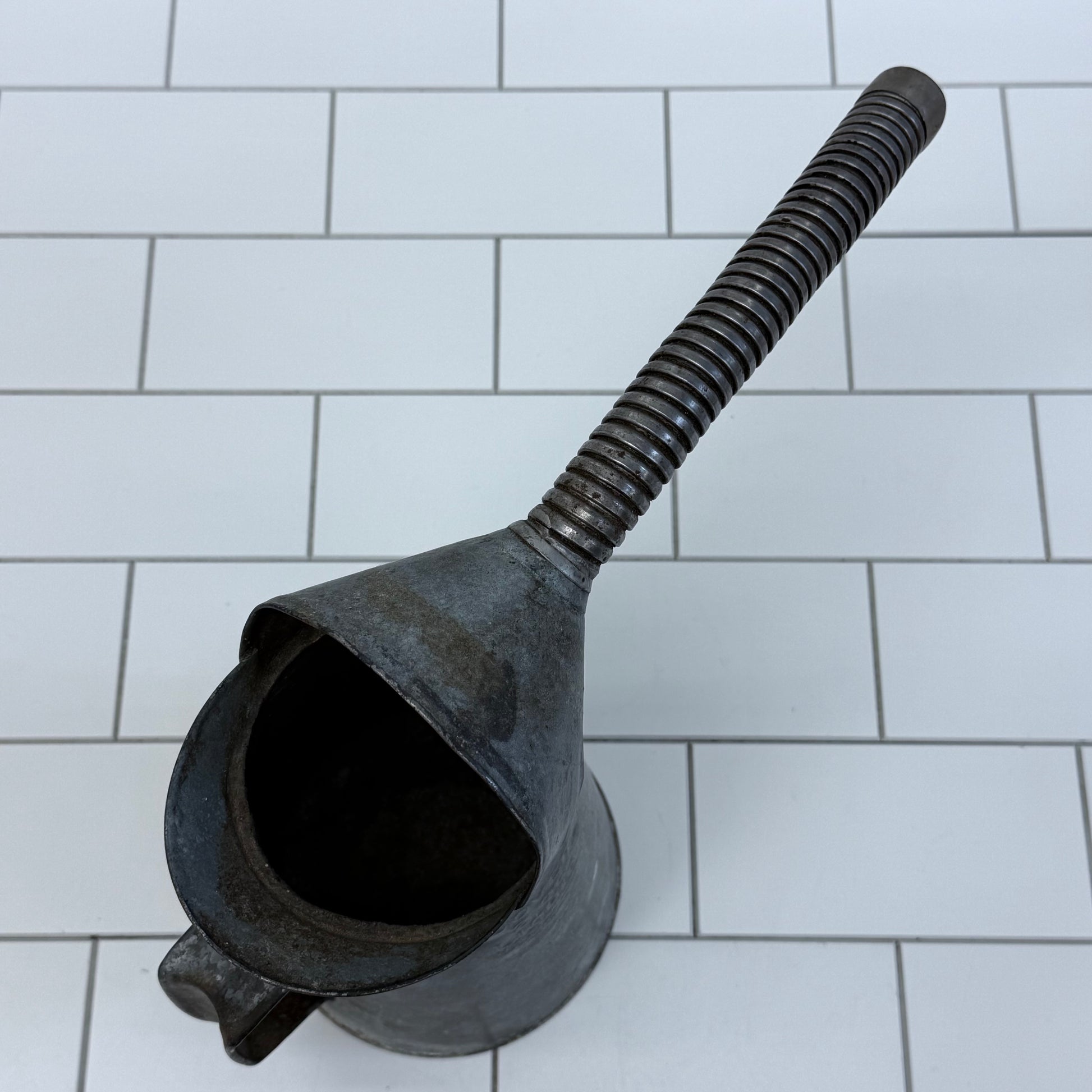 Add a touch of industrial charm to your collection with this Dover Galvanized Oil Can with Flexible Spout, 2 Quarts. Measuring 14”x6”x10”, this vintage oil can features a practical flexible spout and sturdy galvanized construction, perfect for display or functional use. In good vintage condition with minor wear consistent with age and use, it bears the authentic Dover maker’s mark on the front, making it a collectible piece for enthusiasts of vintage tools and industrial décor.