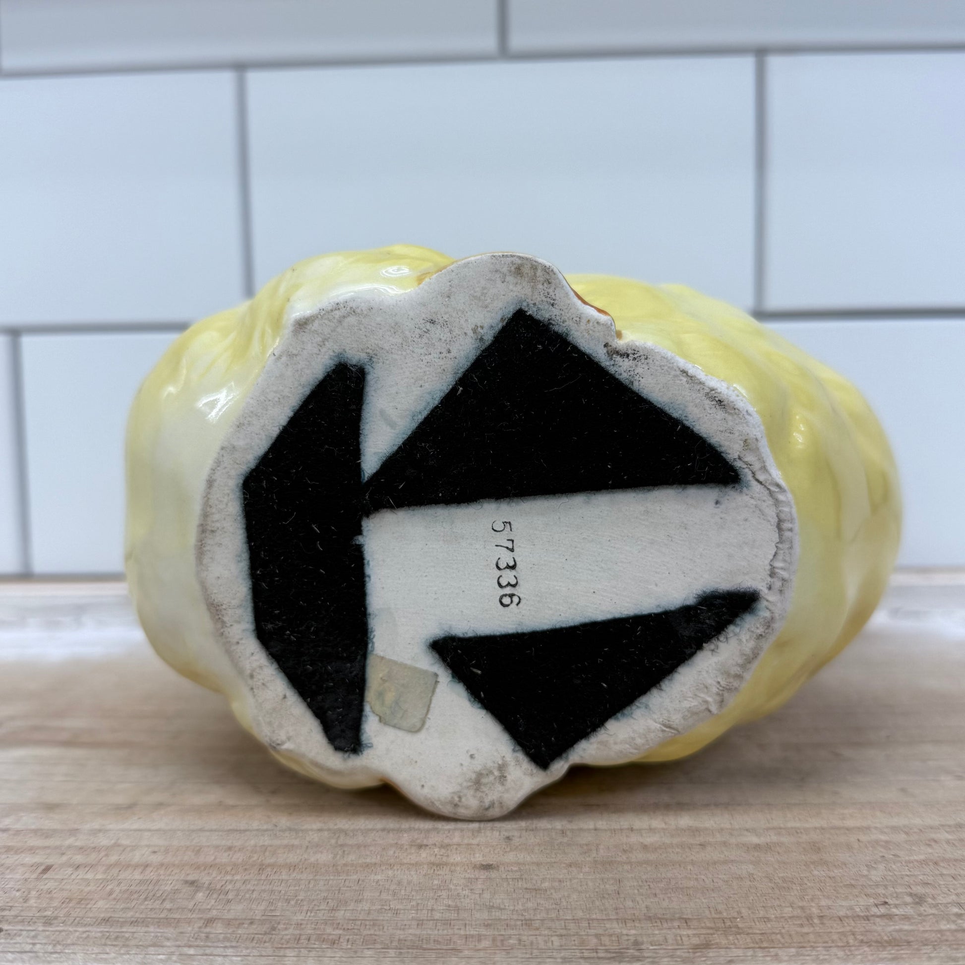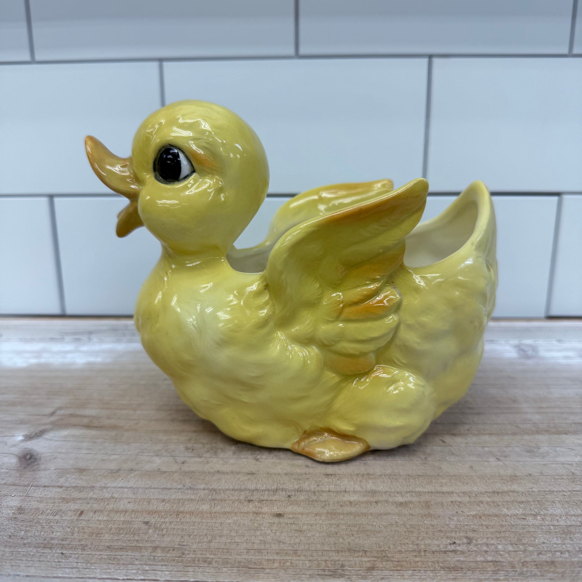 Add a touch of vintage charm to your space with this adorable duckling ceramic planter, perfect for small plants, succulents, or as a whimsical display piece. Measuring 7”x4”x5” and numbered 57336 on the underside, this planter features a sweetly detailed duckling design with soft colors and classic mid-century appeal. In good vintage condition with minor wear consistent with age and use, it’s a delightful addition to any retro decor, nursery, or collectible ceramics shelf.