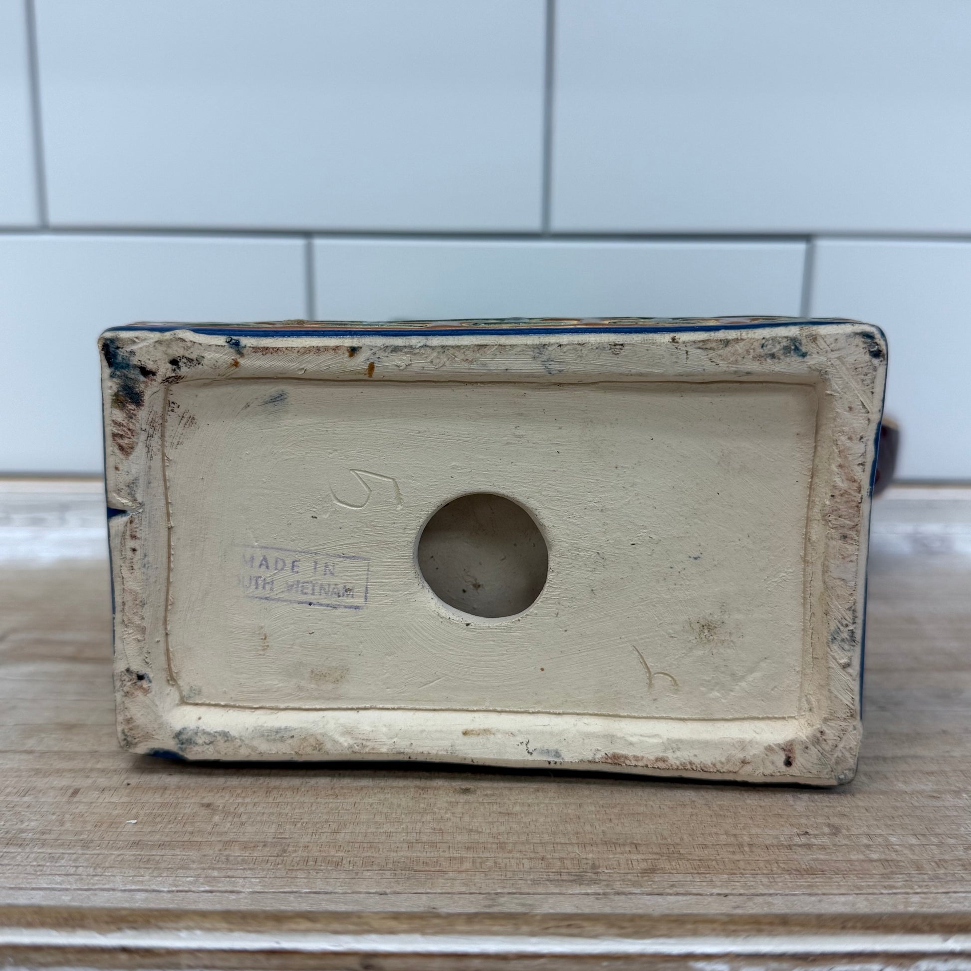 Add a touch of exotic charm to your collection with this Elephant Glazed Ceramic Figurine. Expertly crafted in South Vietnam, this vintage piece features a smooth glazed finish and detailed sculpting, capturing the majesty of the elephant. In good vintage condition with minor wear consistent with age, it measures 7”x3”x7” and carries the maker’s mark on the underside, making it a standout accent for any shelf or tabletop.