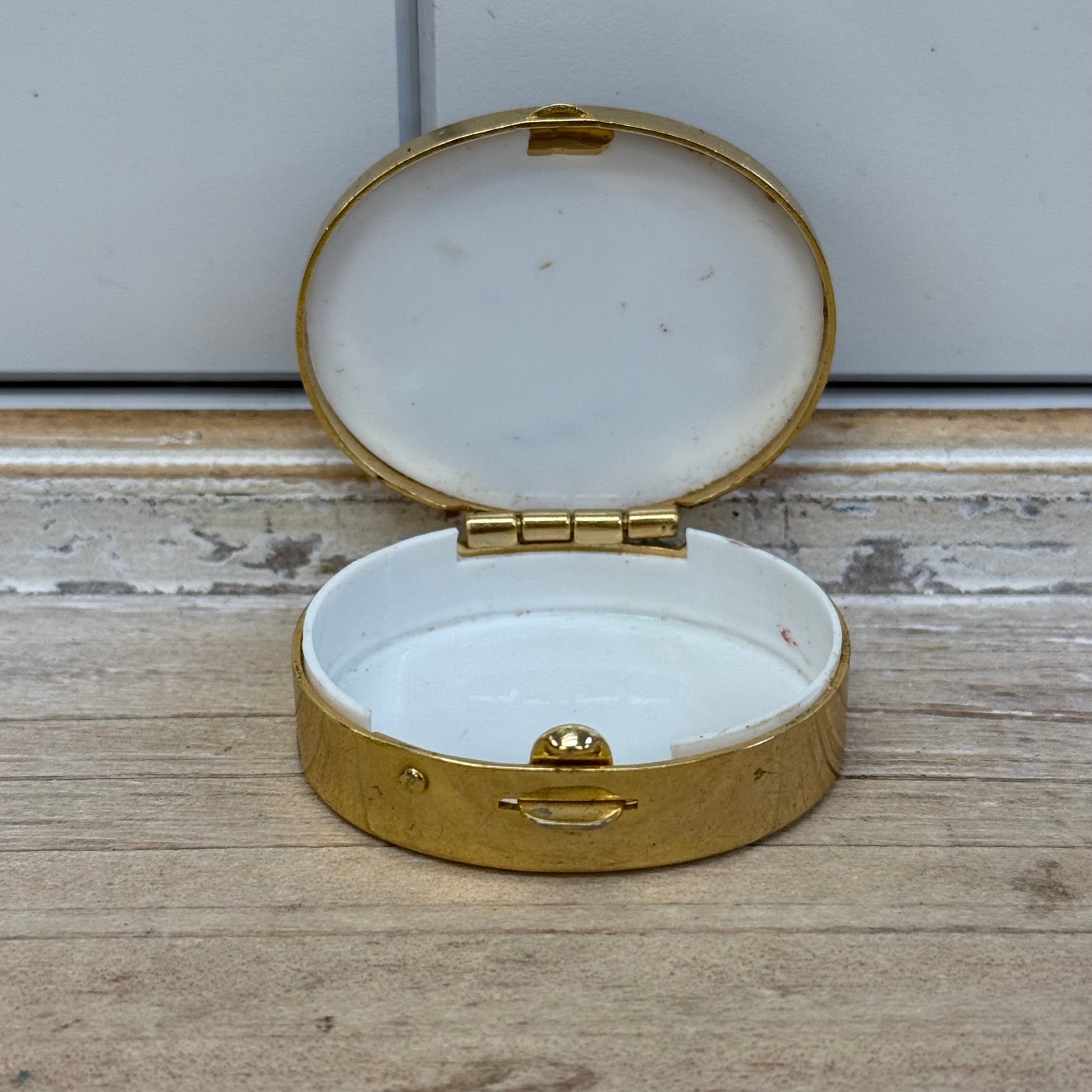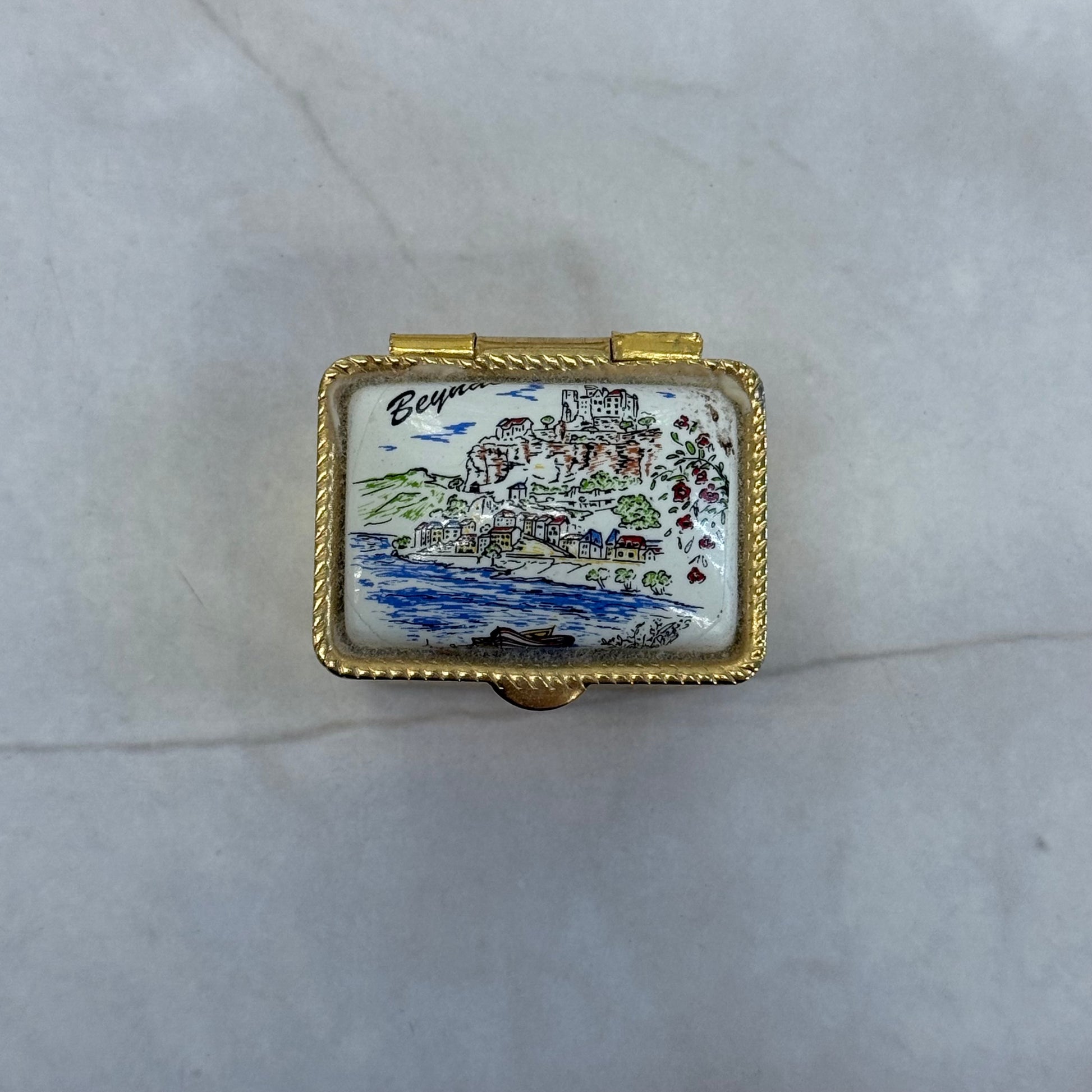 Keywords: enameled trinket box, vintage jewelry box, metal keepsake box, collectible décor, enamelware, vintage vanity box, decorative storage, small gift box, ornate metal box, collectible trinket