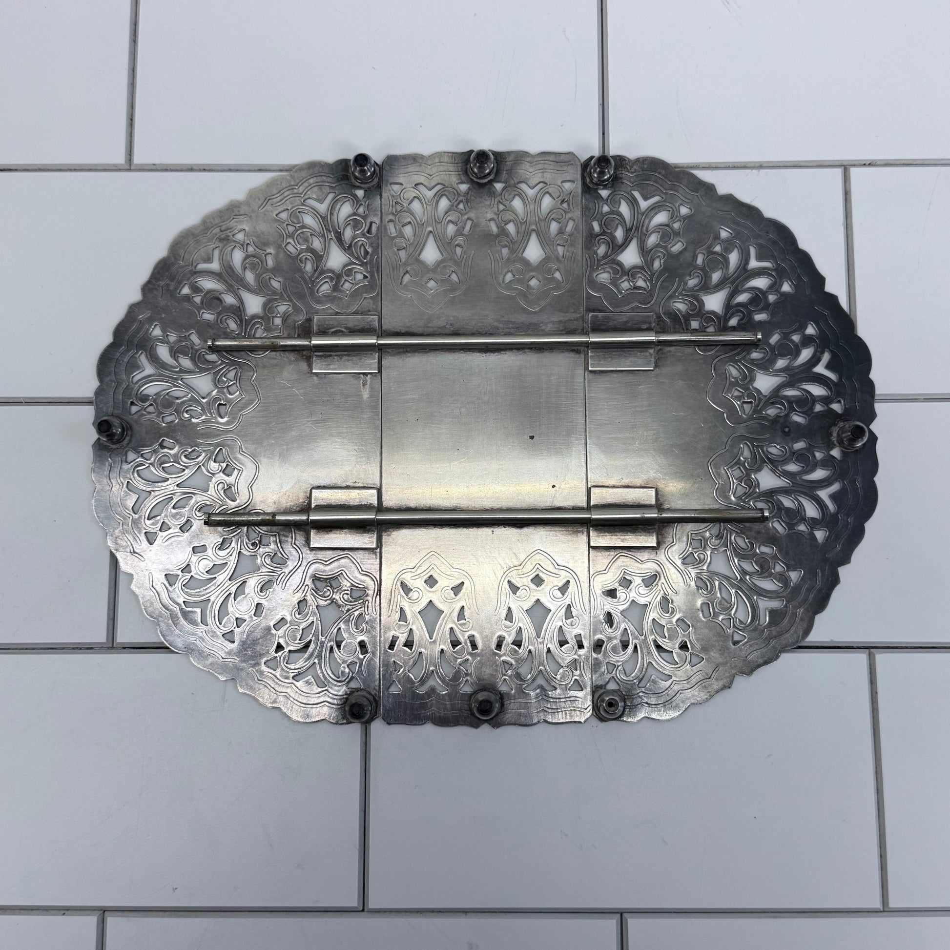 Sleek and functional, this Expandable Pierced Silver-Plated Trivet from Denmark combines mid-century design with timeless practicality. Beautifully crafted with an intricate pierced pattern, it expands from 10”x8” to 12”x8” to accommodate a variety of serving dishes while protecting your tabletop in elegant style. The maker’s mark is stamped on the underside, reflecting quality Danish craftsmanship. In good vintage condition with minor wear consistent with age and use, this trivet is both a stylish accent and a versatile piece for entertaining or display.