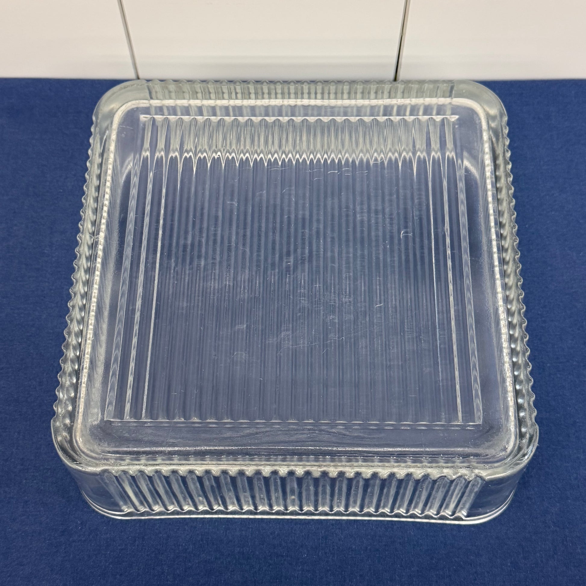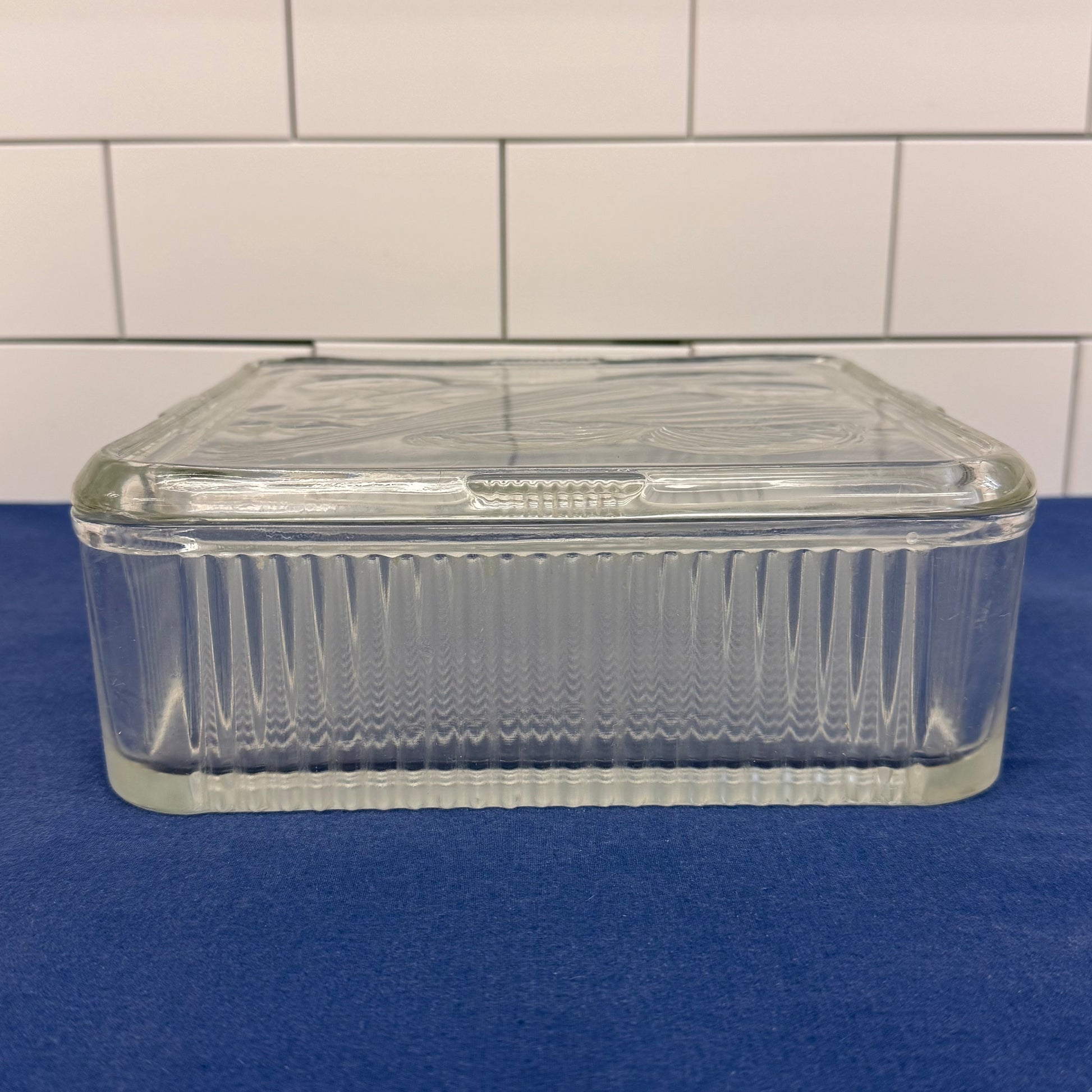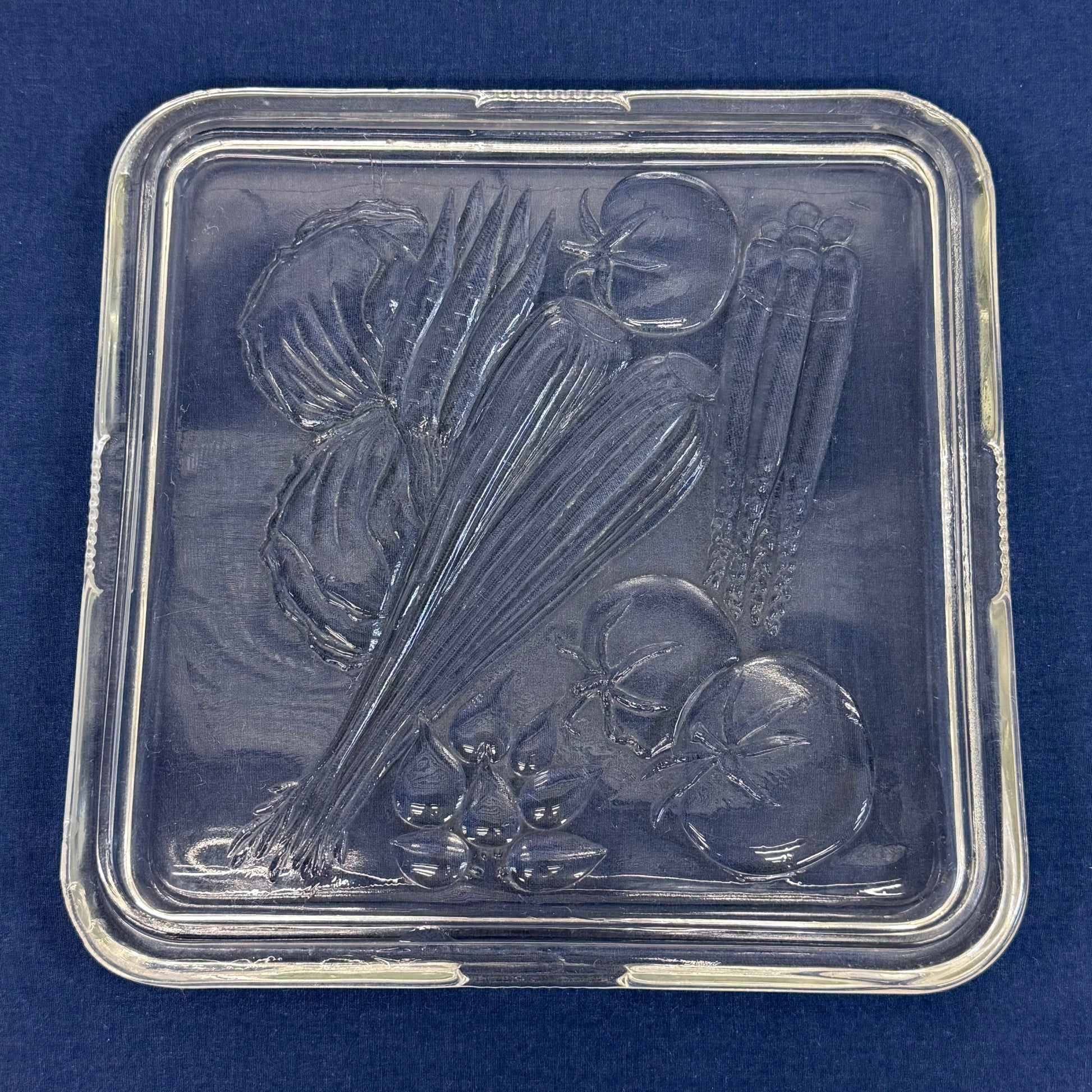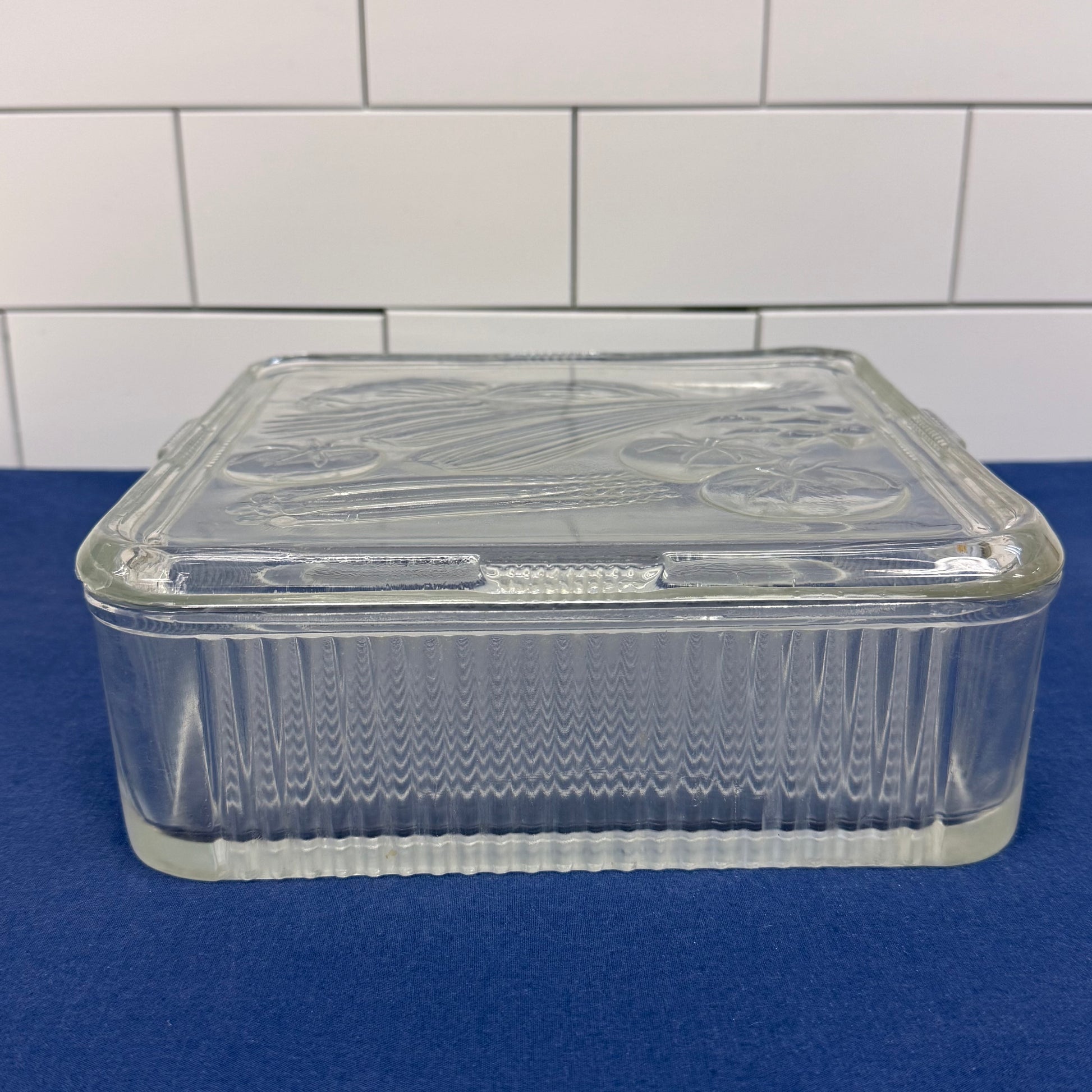 Anchor Hocking “Garden Harvest” pressed glass refrigerator dish with lid, produced in the United States during the 1960s–1970s as part of a popular line of mid-century kitchen storage ware. This square covered dish features a beautifully molded vegetable motif on the lid, including corn, tomatoes, and asparagus, reflecting the era’s farmhouse-inspired design aesthetic. Crafted from clear pressed glass with ribbed sides and a snug-fitting lid, it was originally intended for refrigerator storage but works equally well today for serving, organizing, or display in vintage-inspired kitchens. Its durable construction and nostalgic charm make it a versatile and collectible piece of classic American glassware. Good vintage condition, minor wear consistent with age and use.