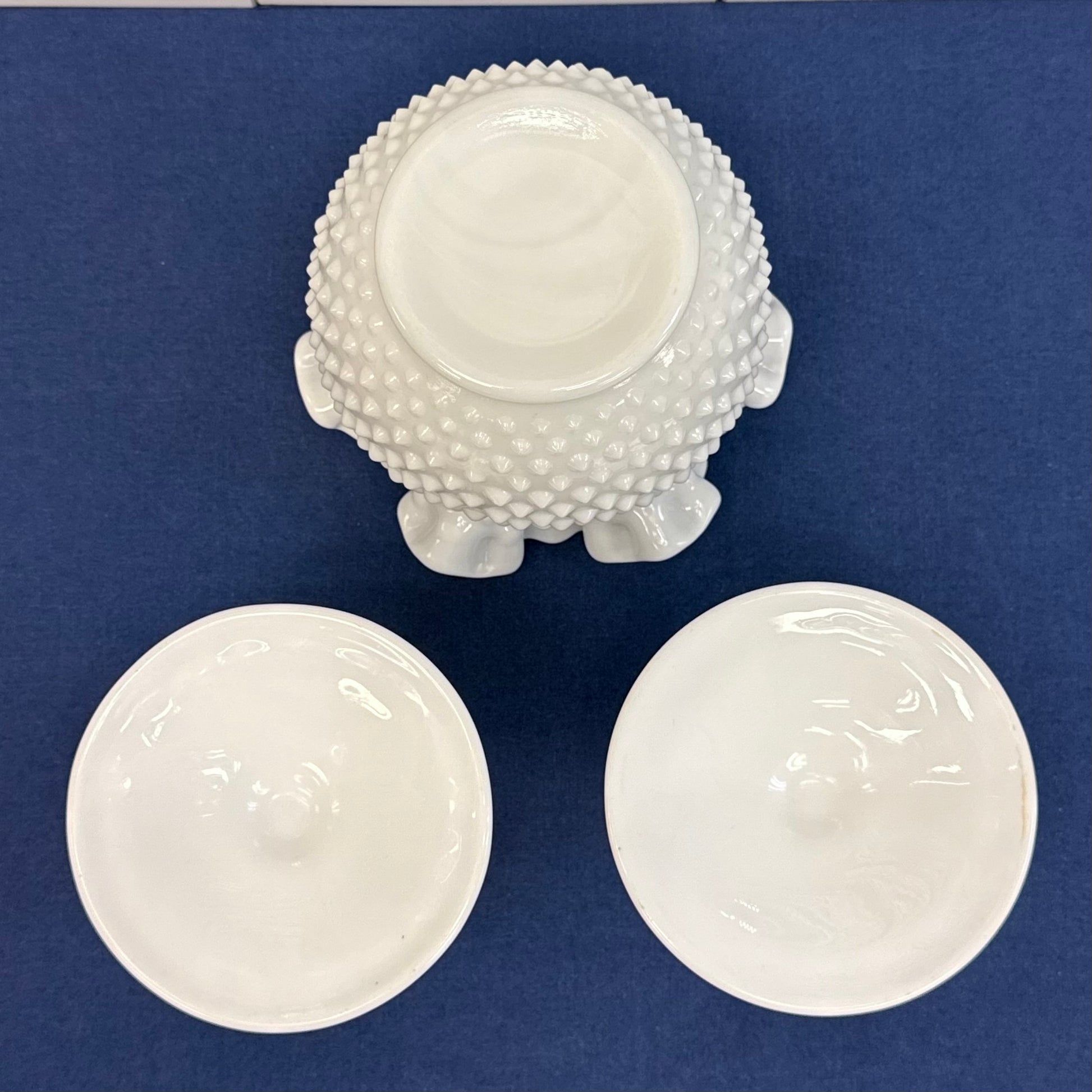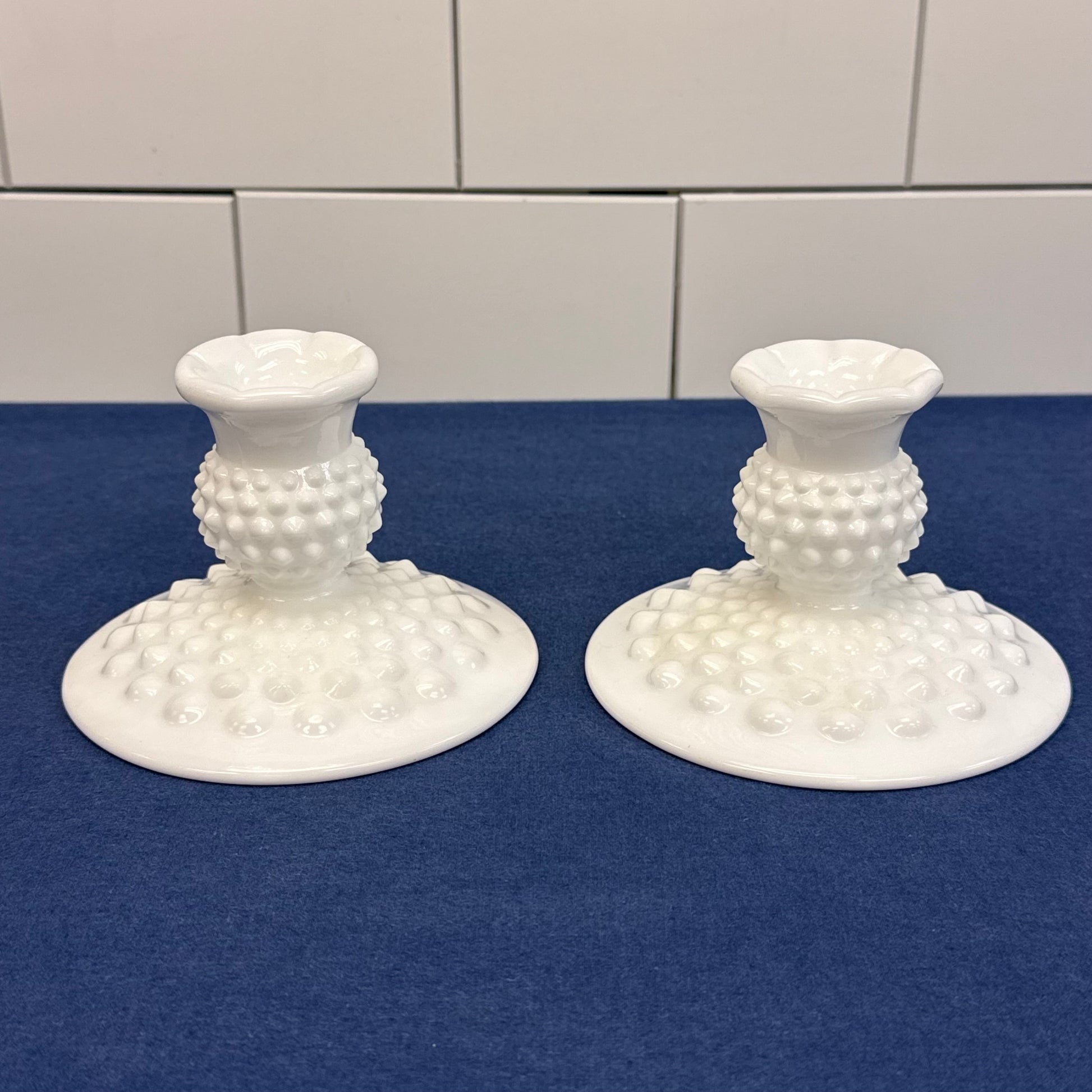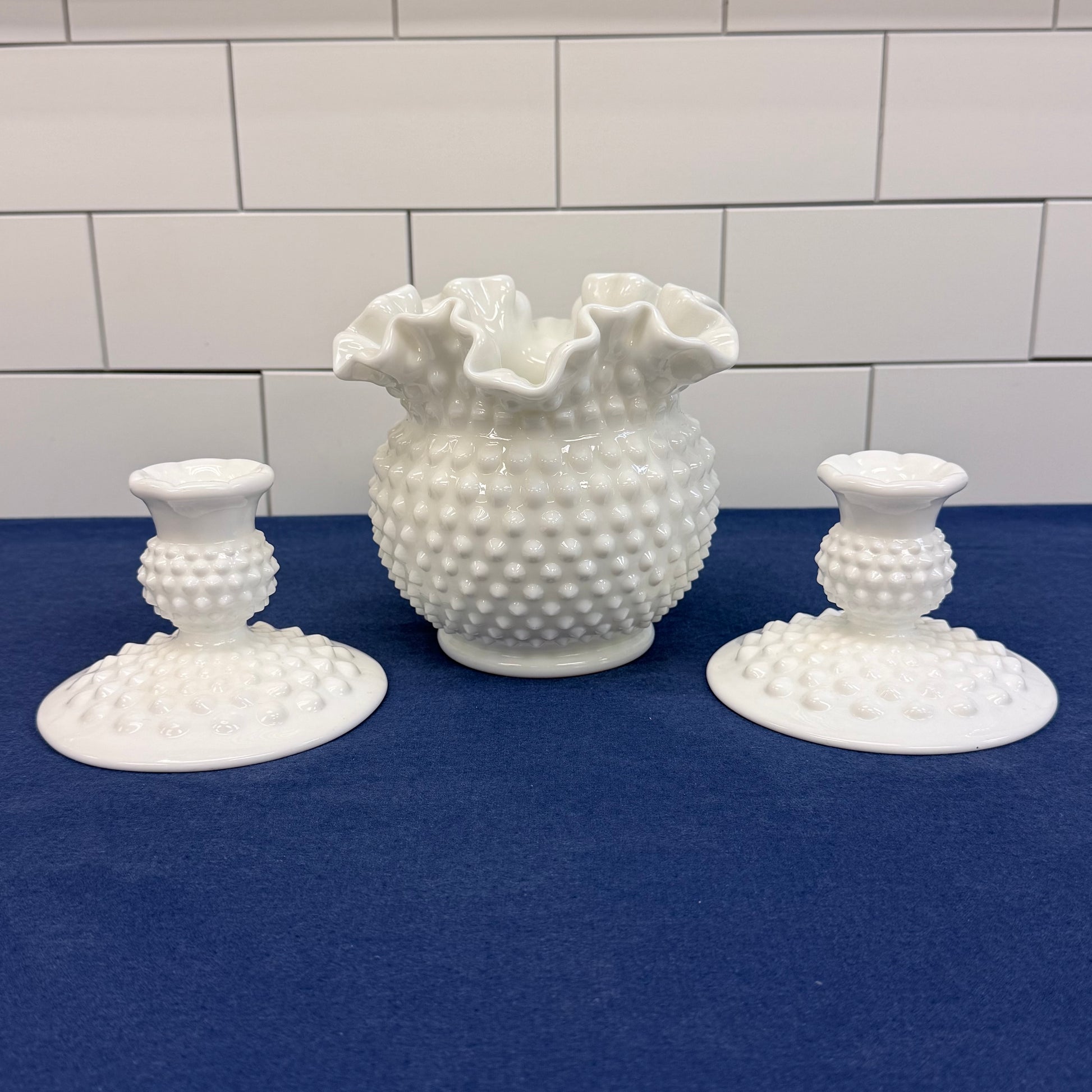 Fenton Hobnail Milk Glass Vase & Candlestick Set of 3 1950-70