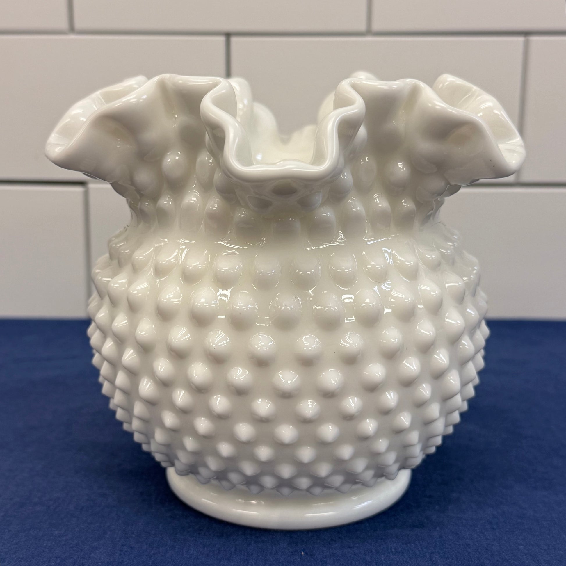 Classic mid-century charm meets timeless farmhouse elegance in this Fenton Hobnail Milk Glass décor set, featuring a beautifully ruffled vase and two matching candlestick holders crafted in Fenton’s iconic hobnail pattern. Produced prior to 1970 and consistent with earlier unmarked Fenton pieces, this set showcases the richly textured raised hobnails and glossy opaque white finish that made Fenton Art Glass a household name in American decorative glassware. The vase’s softly crimped rim adds graceful movement and vintage romance, while the coordinating candlesticks offer balanced symmetry perfect for mantels, dining tables, wedding décor, or cottage-inspired interiors. Offered in good vintage condition with minor wear consistent with age and use, this three-piece grouping is ideal for collectors of mid-century milk glass or anyone seeking classic white glass accents that transition effortlessly through every season.
