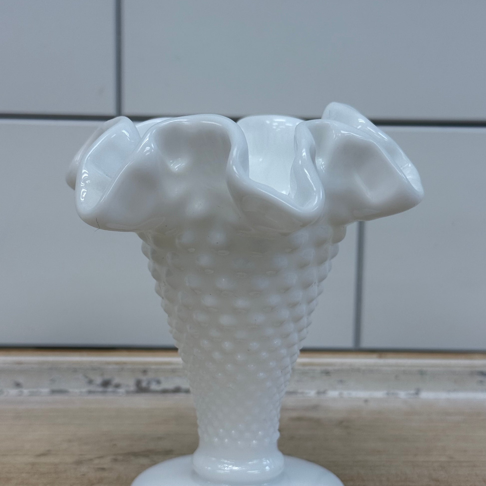 Fenton, milk glass, hobnail vase, ruffled vase, vintage glass, collectible decor, white glass, trumpet vase, classic home decor, cottage style