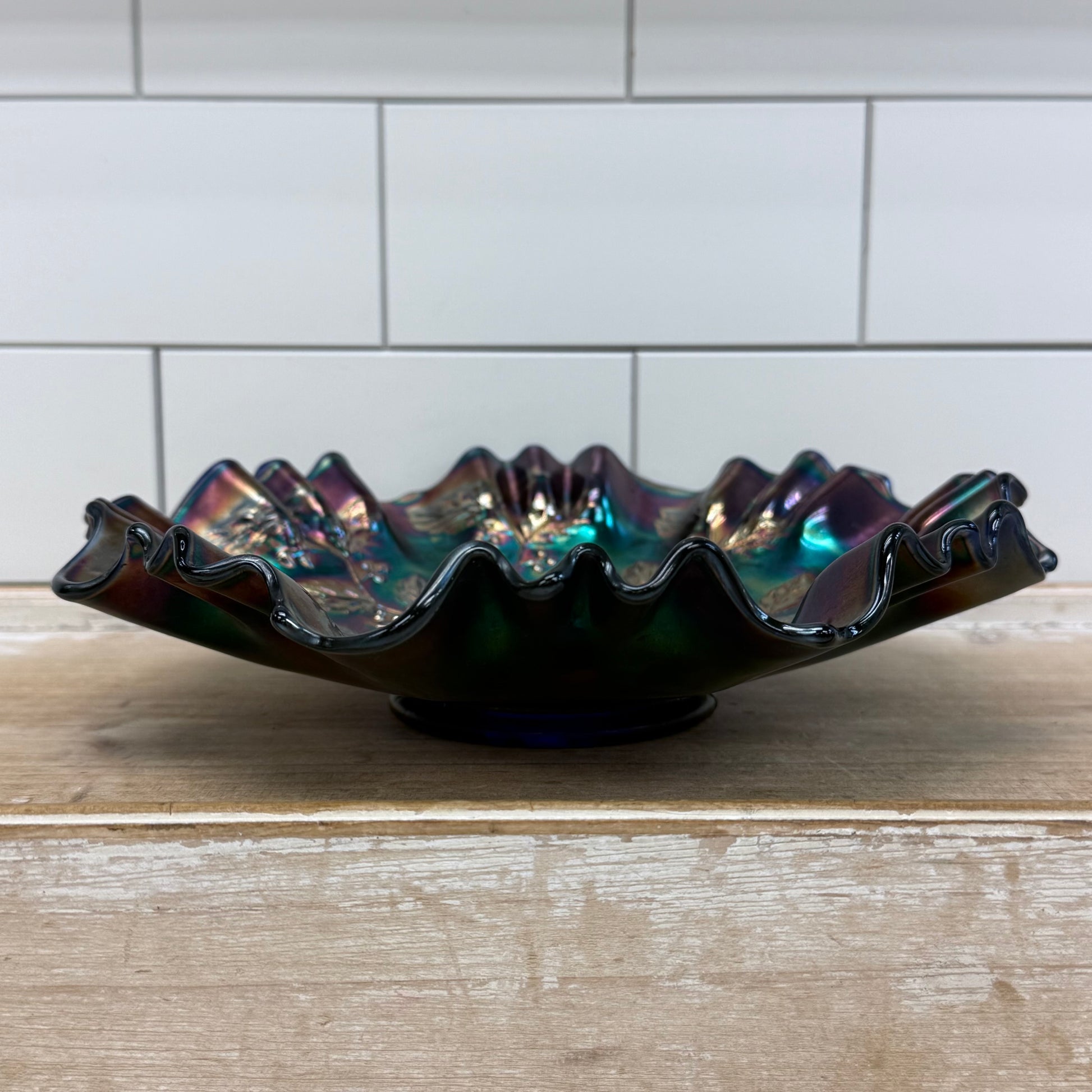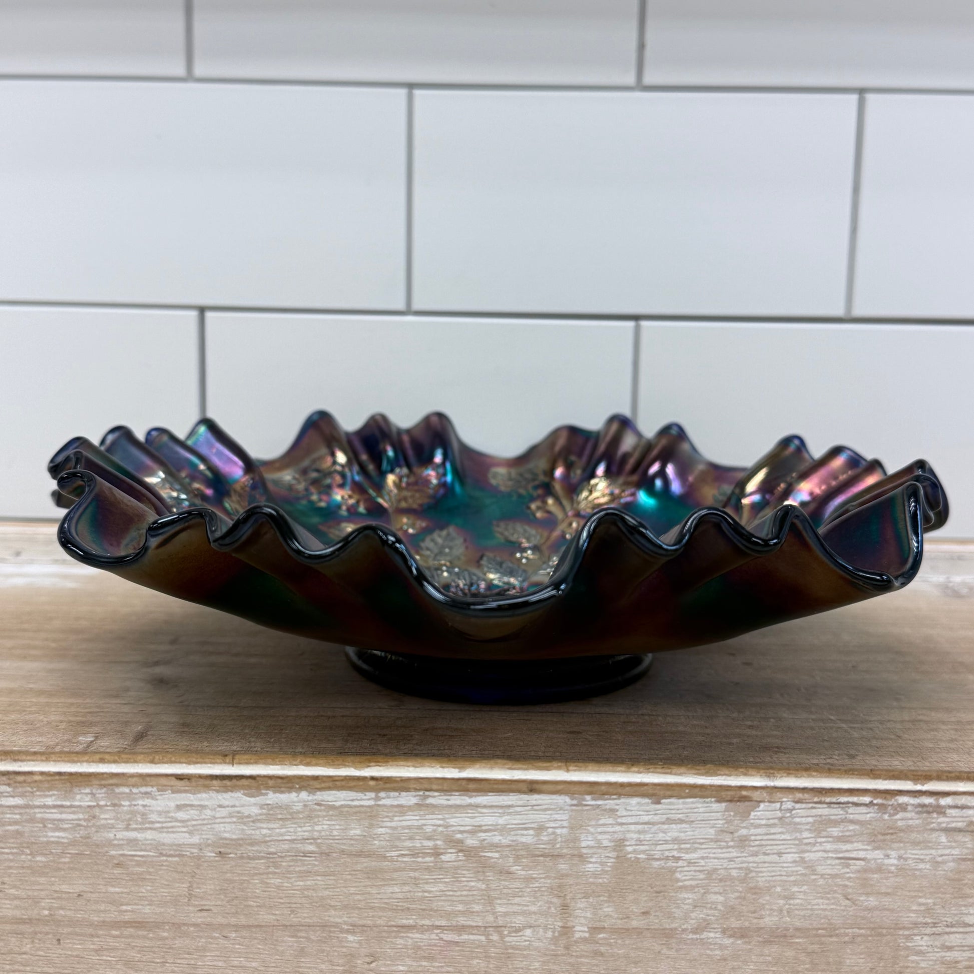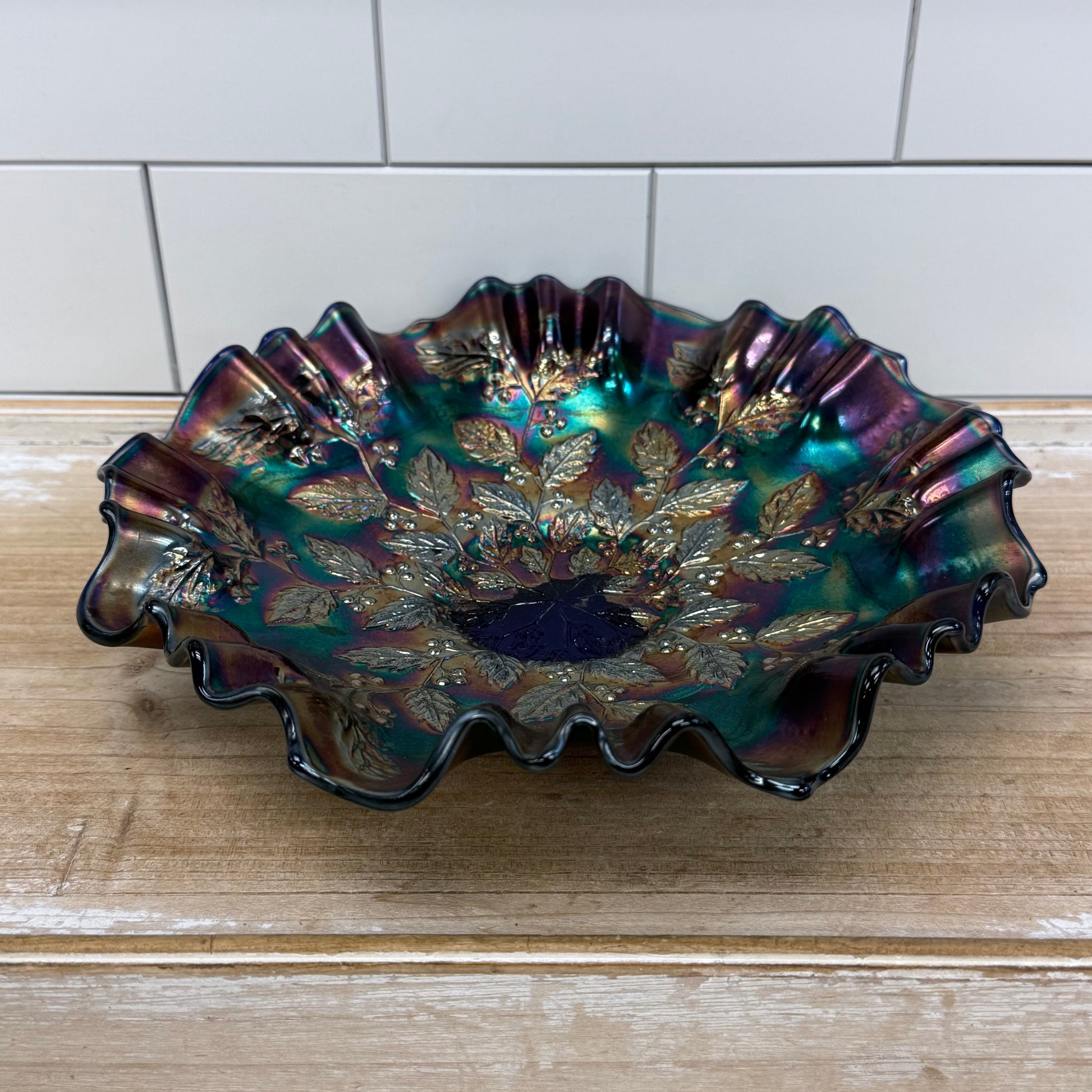 Vintage Fenton Holly carnival glass ruffled bowl, an eye-catching example of American art glass produced by the Fenton Art Glass Company in West Virginia during the mid-20th century. This striking pressed glass bowl features the classic Holly pattern with detailed holly leaves and berries radiating from a deep cobalt blue center, finished with brilliant iridescent carnival glass tones of emerald, violet, and gold. The wide ruffled edge enhances the dramatic color play that carnival glass is known for, making this piece equally suited as a decorative centerpiece, fruit bowl, or display piece for collectors of vintage American art glass. Fenton’s holly motif is especially sought after for its seasonal appeal and richly textured design, and the vibrant iridescence gives the bowl exceptional visual depth under light. Offered in good vintage condition with minor wear consistent with age and use.