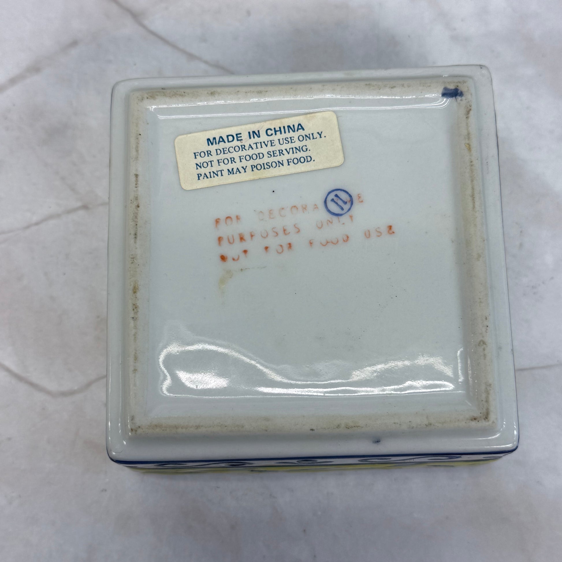 Playful and richly decorative, this charming chinoiserie-inspired trinket box lot brings together glossy blue-and-white ceramics with a sunny yellow accent, perfect for shelf styling or tabletop display. The set includes three egg-shaped trinket boxes, marked “FF” and attributed to Fitz and Floyd, each finished in hand-painted cobalt geometric and floral patterns typical of late-20th-century decorative ceramics. Also included is a square yellow floral trinket box, decorated with scrolling blue vines and blossoms in a classic export-style palette. All pieces were made for decorative use and reflect the popular revival of blue-and-white and chinoiserie motifs during the 1980s–1990s. Offered in good vintage condition, with minor wear consistent with age and display. Measures: egg boxes approximately 2.5” x 1.5” x 1.5” each; yellow floral box approximately 4” x 4” x 2.5”.