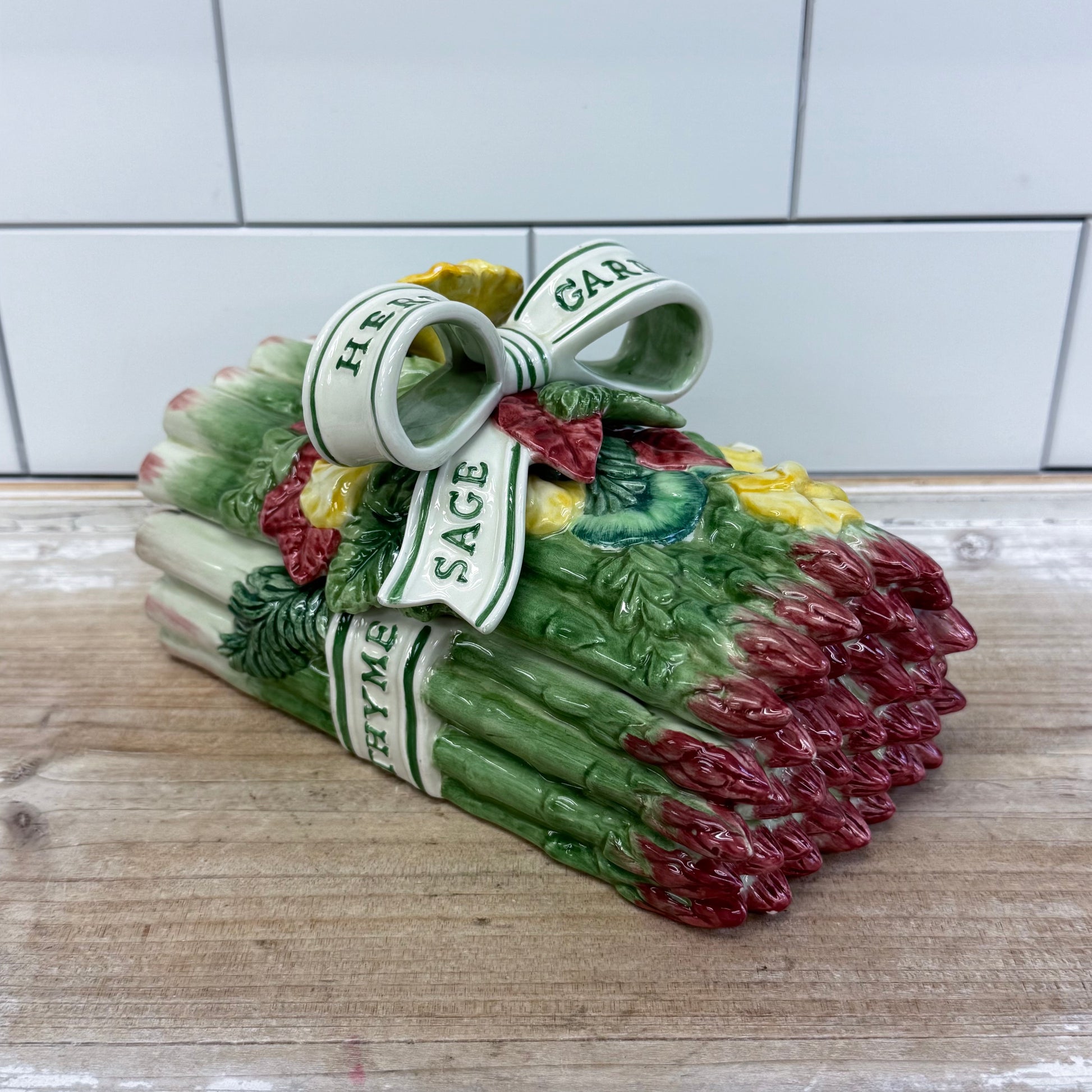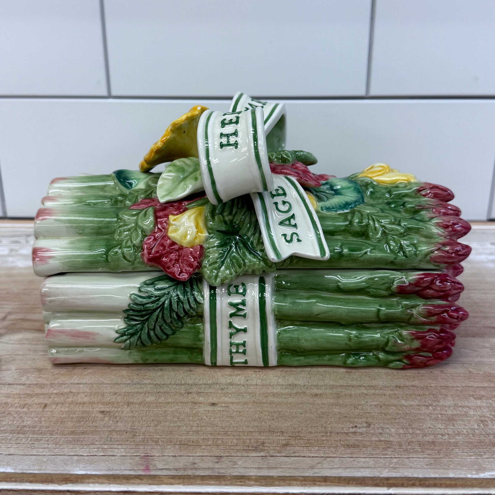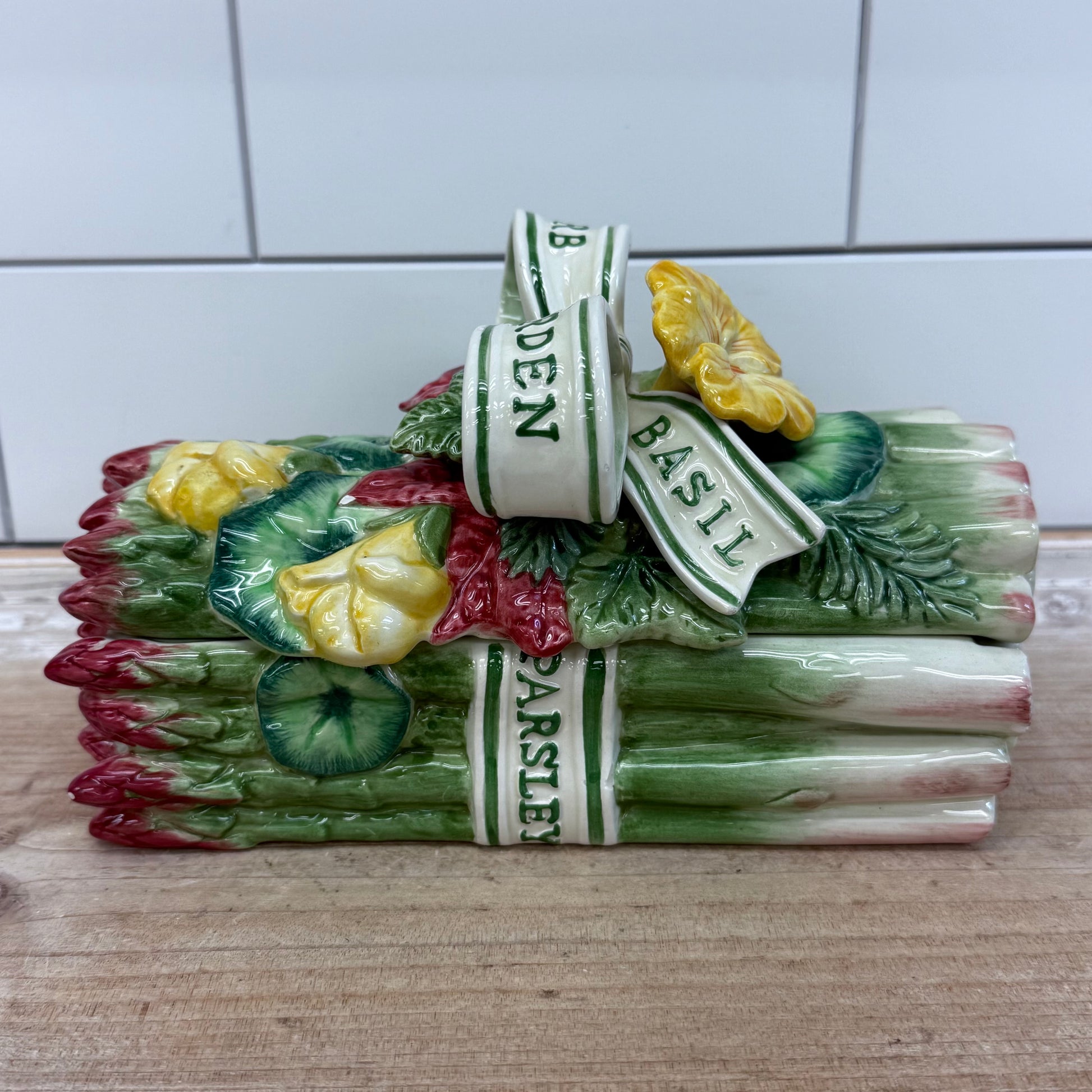 Fitz & Floyd, Herb Garden, asparagus box, ceramic lidded box, vintage kitchenware, collectible ceramics, hand-painted, whimsical décor, tabletop accent, mid-century serveware