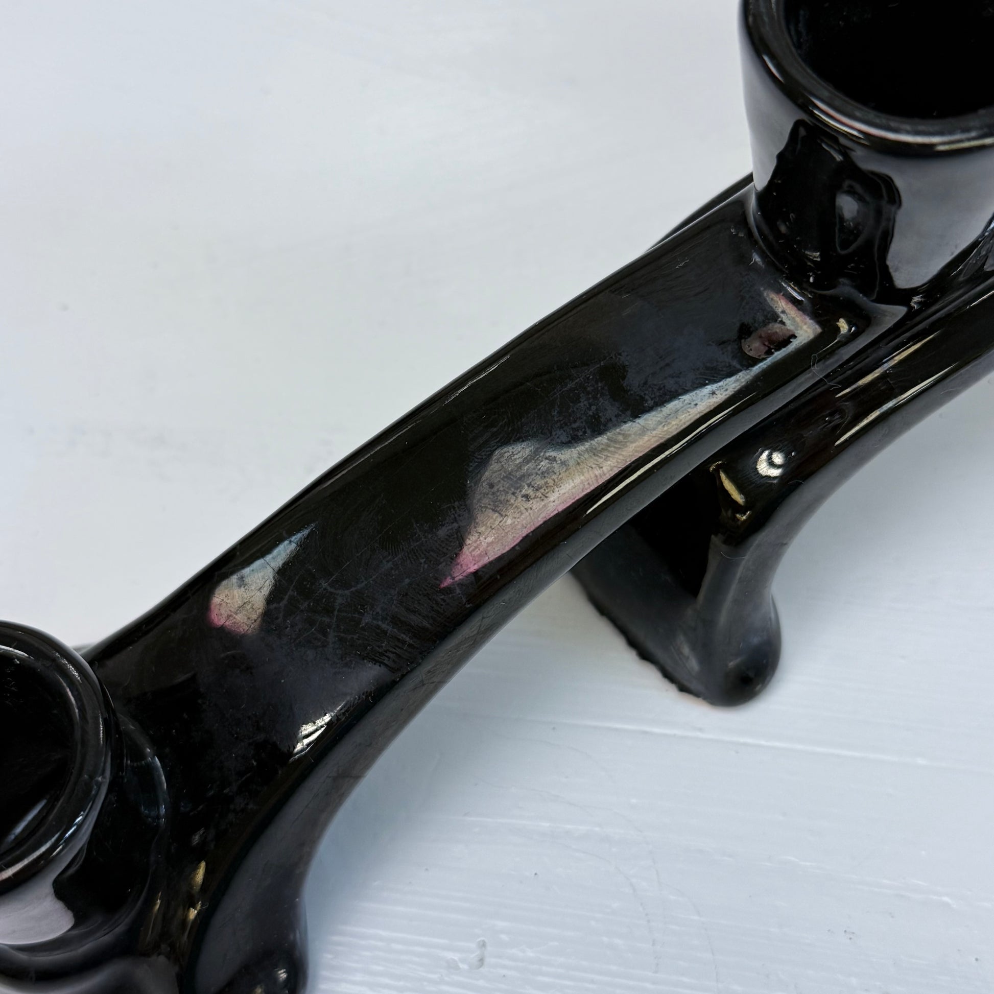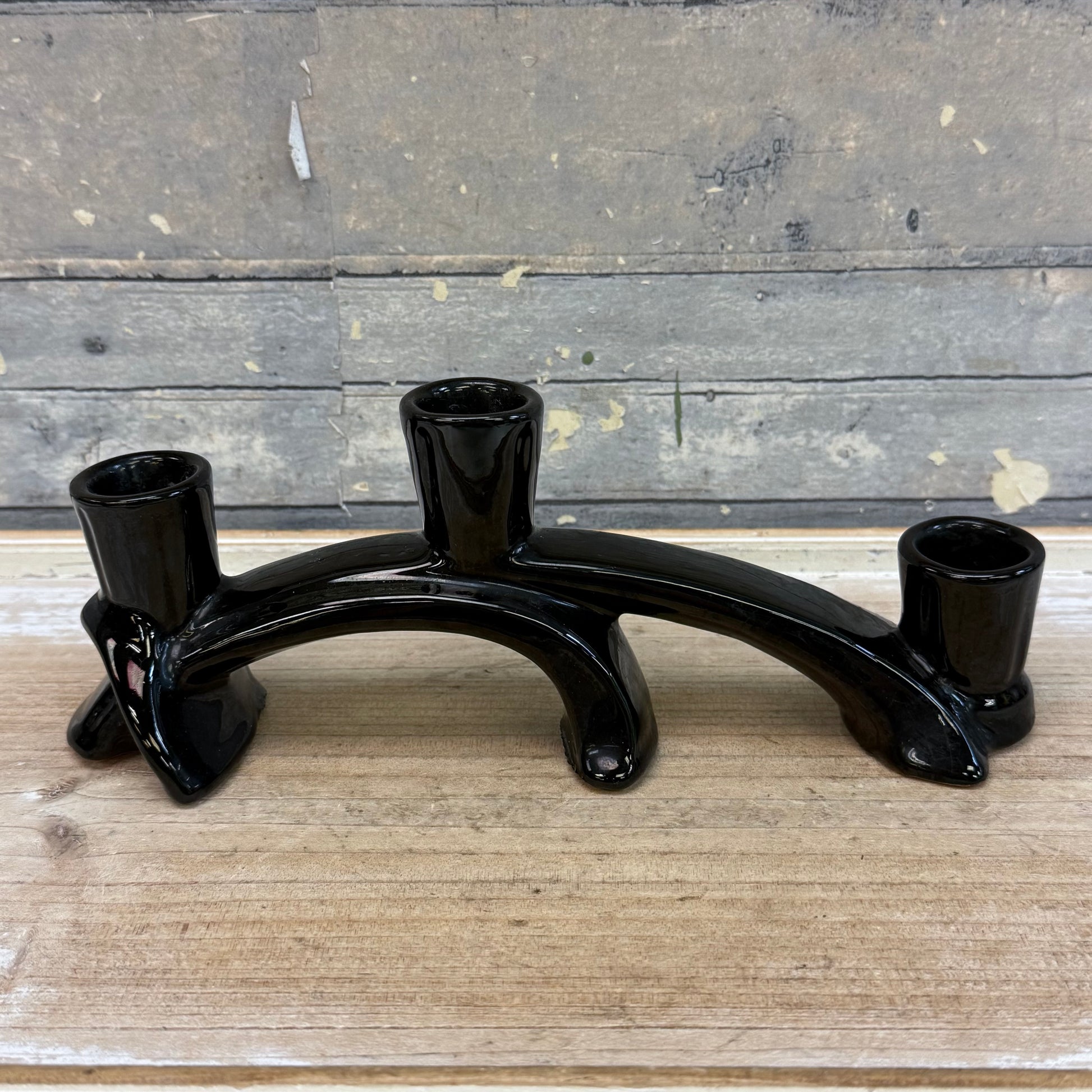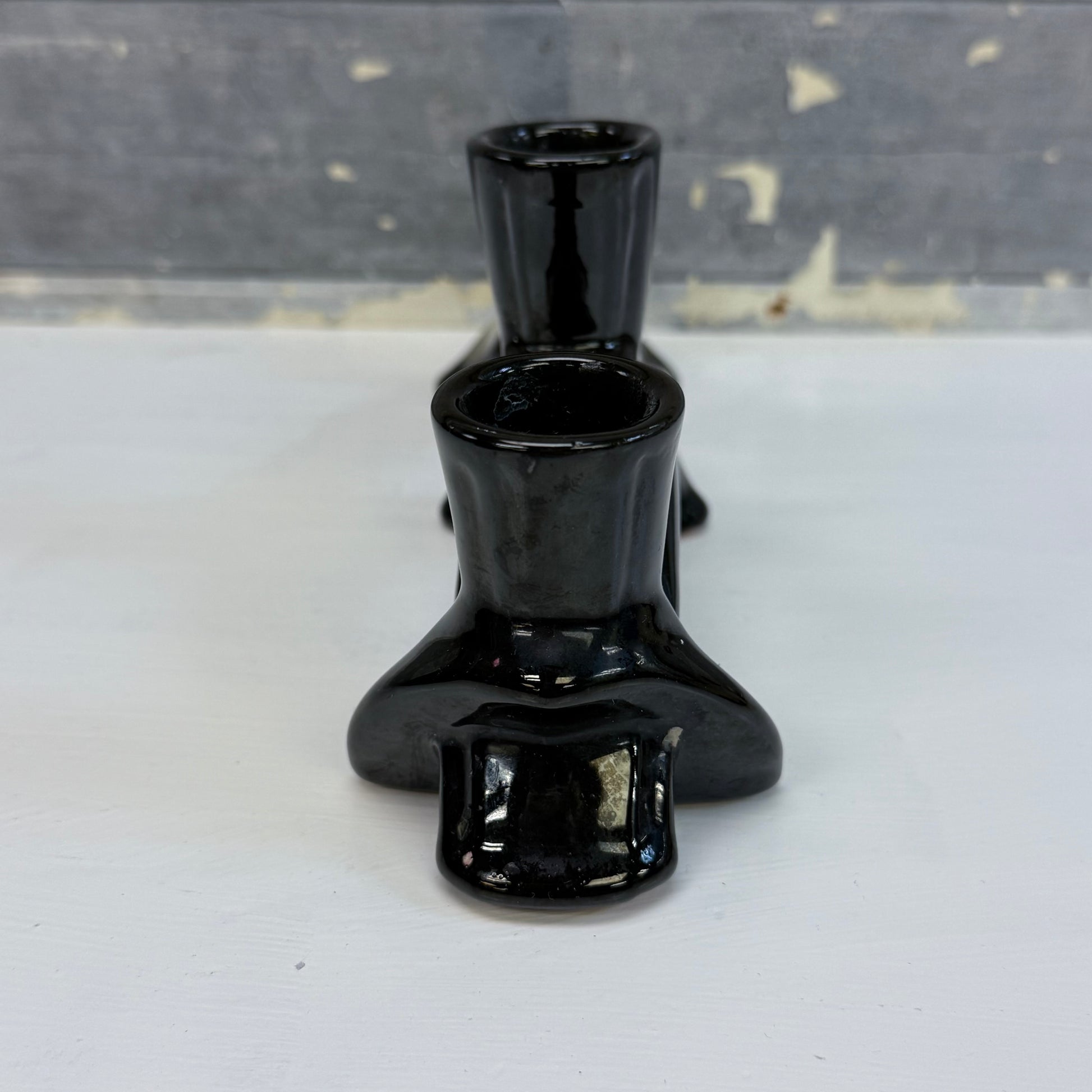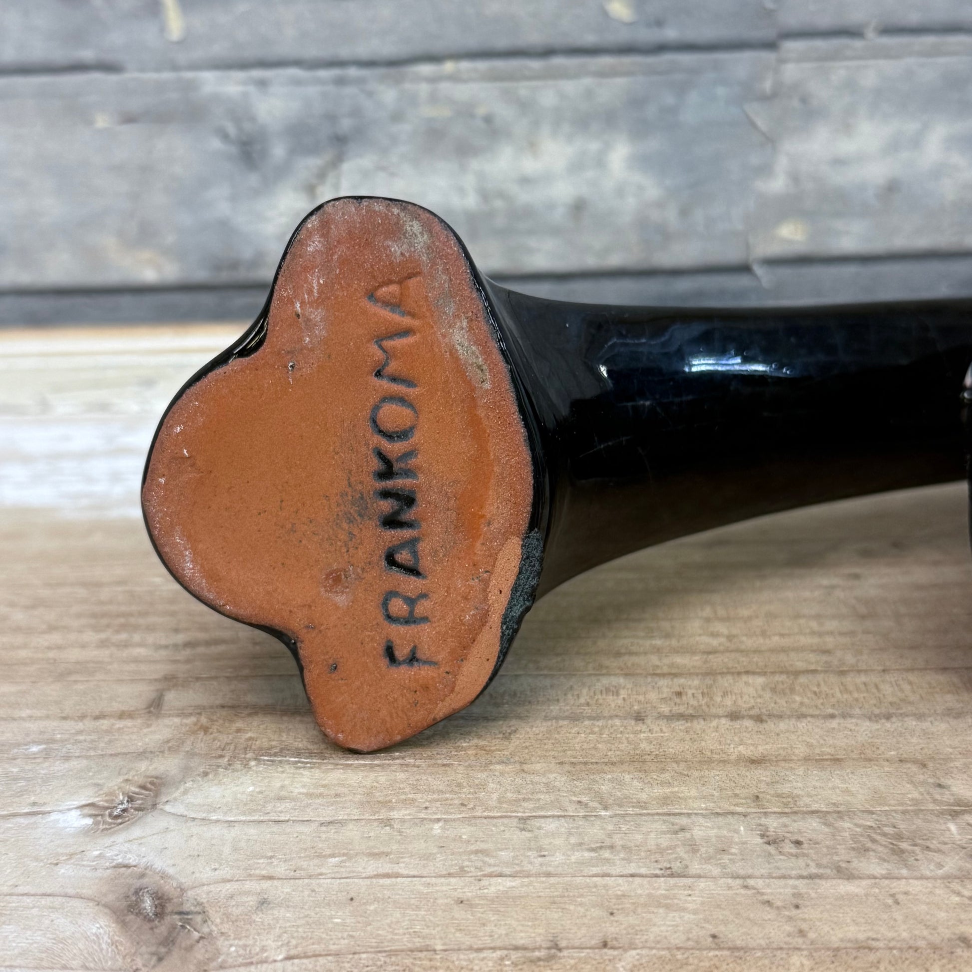 Add bold elegance to your décor with this Frankoma Black Painted Terracotta Candlestick Holder (#306), a striking example of mid-century American pottery. Crafted from warm terracotta and finished in a sleek black glaze, this piece is marked with the Frankoma maker’s mark and number on the underside, highlighting its authenticity and collectible appeal. In good vintage condition with minor wear consistent with age and use, it’s perfect for adding a handcrafted, artistic touch to any tabletop or display.