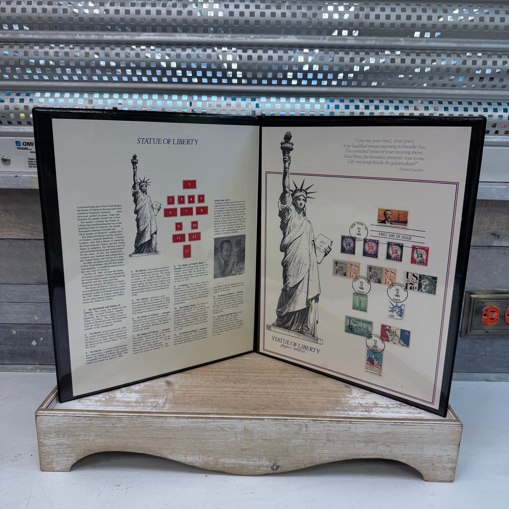 keywords: Gene Jarvis signed portfolio, Statue of Liberty art, limited edition 2988/3000, vintage stamp portfolio, collectible art print, signed American art, patriotic artwork, limited edition collectible, 14x11 portfolio, Gene Jarvis collectible