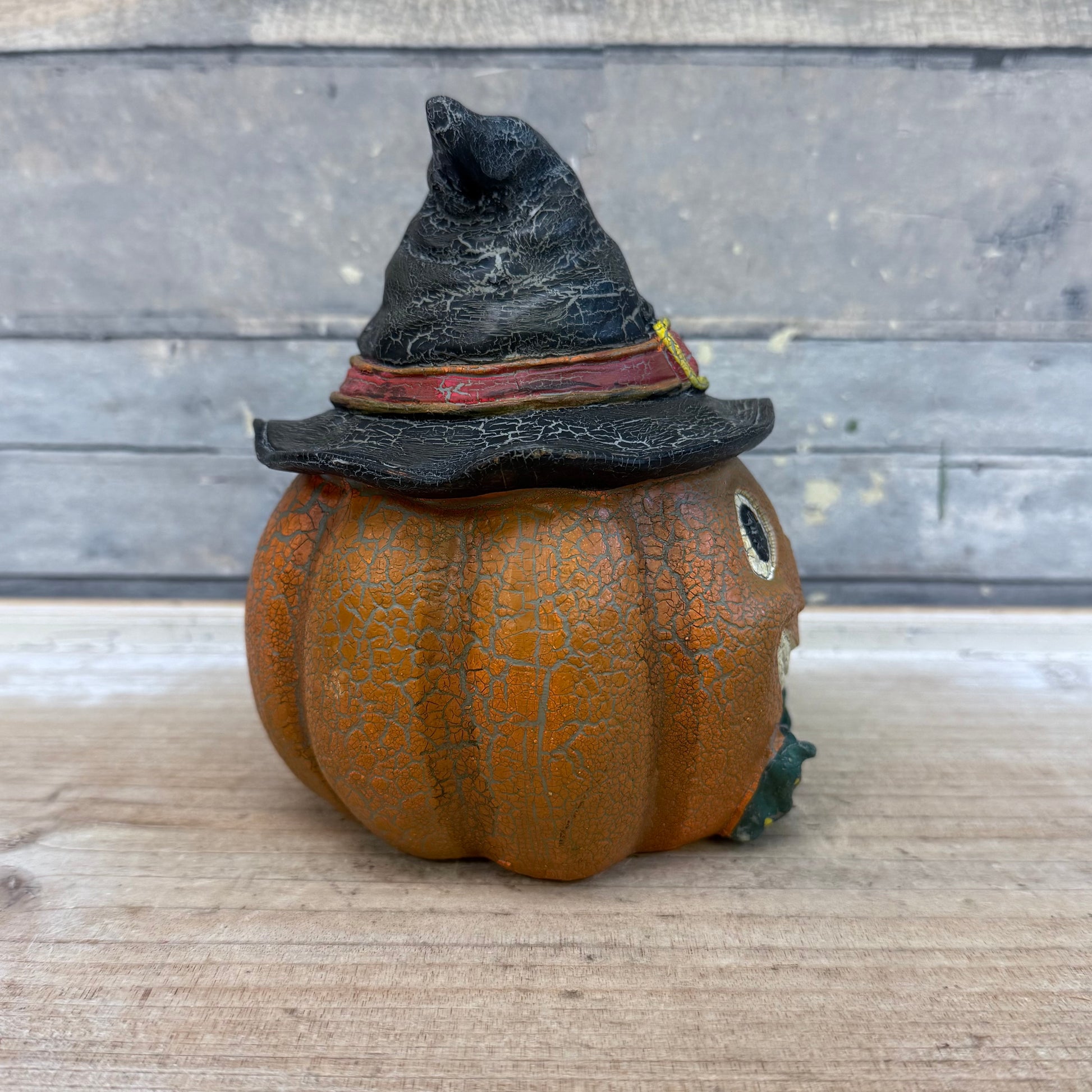 keywords: Halloween décor, jack-o-lantern figurine, resin pumpkin, carved face, fall decoration, spooky home décor, autumn accent, vintage Halloween, tabletop décor, festive pumpkin