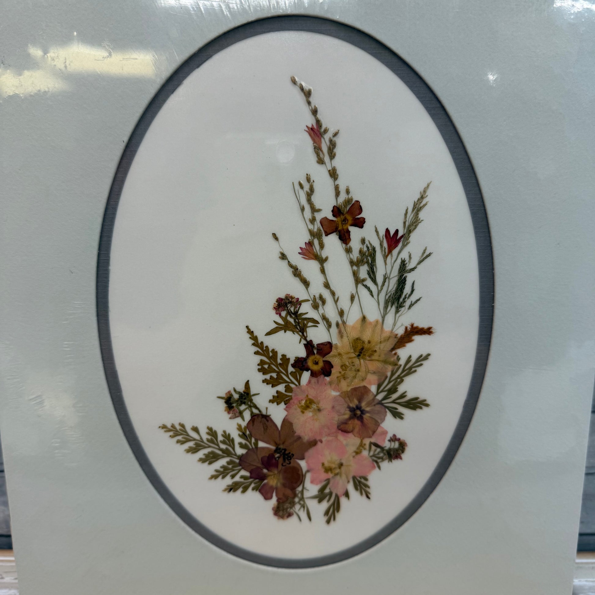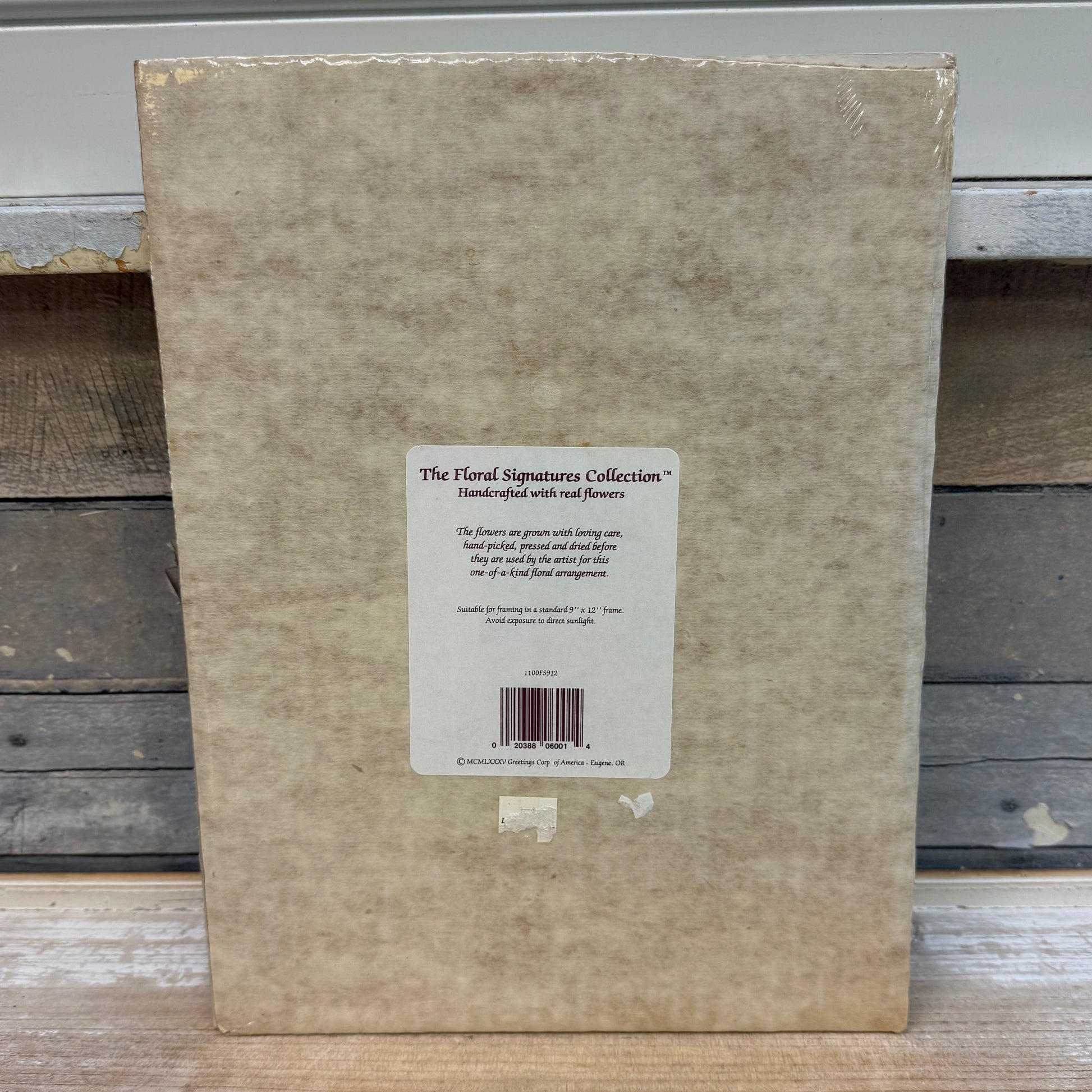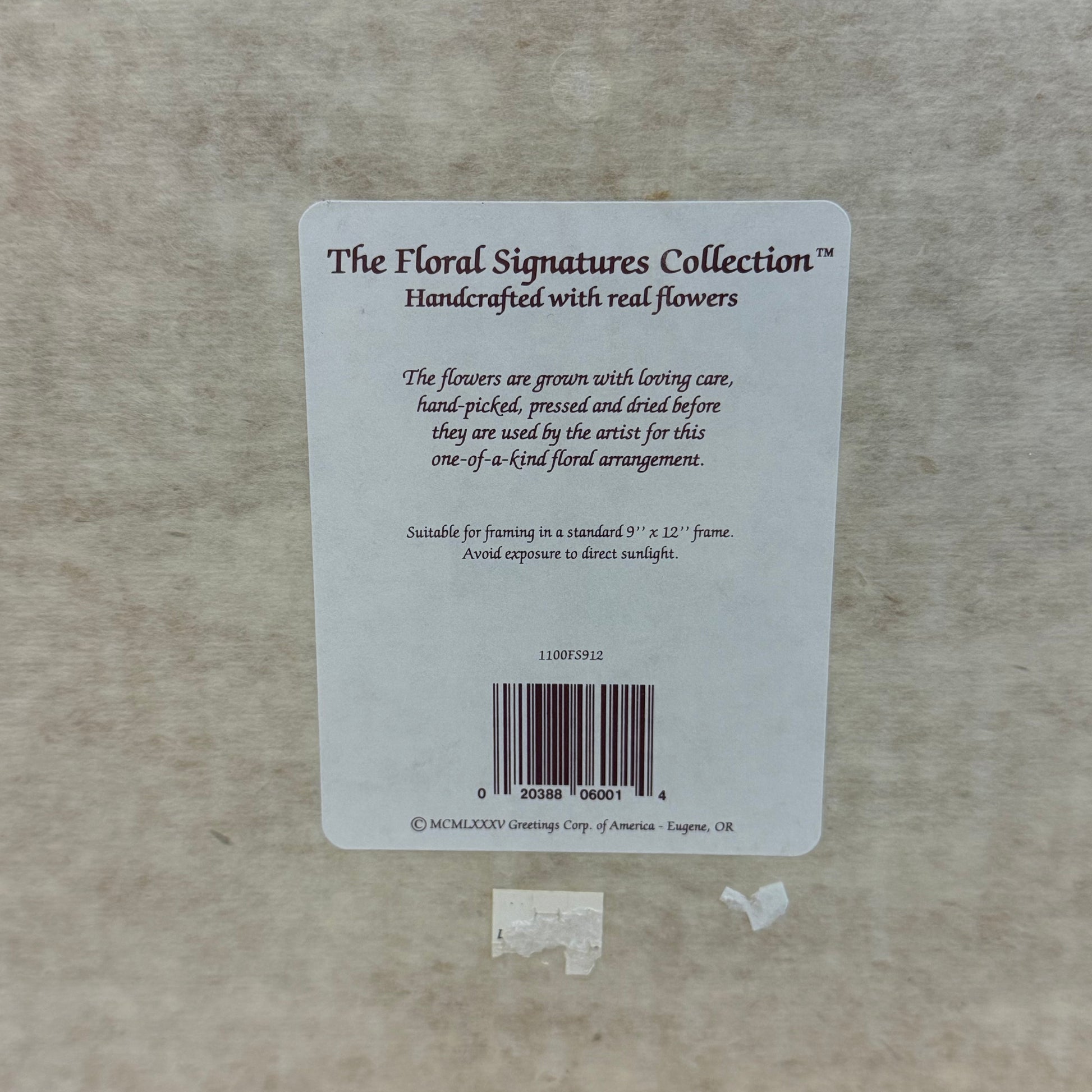 keywords: pressed floral art, vintage 1985 wall décor, Greeting Corp. of America, Eugene Oregon artwork, sealed vintage art, botanical wall art, collectible 1980s home décor, floral arrangement artwork, vintage pressed flowers, nature-inspired wall décor