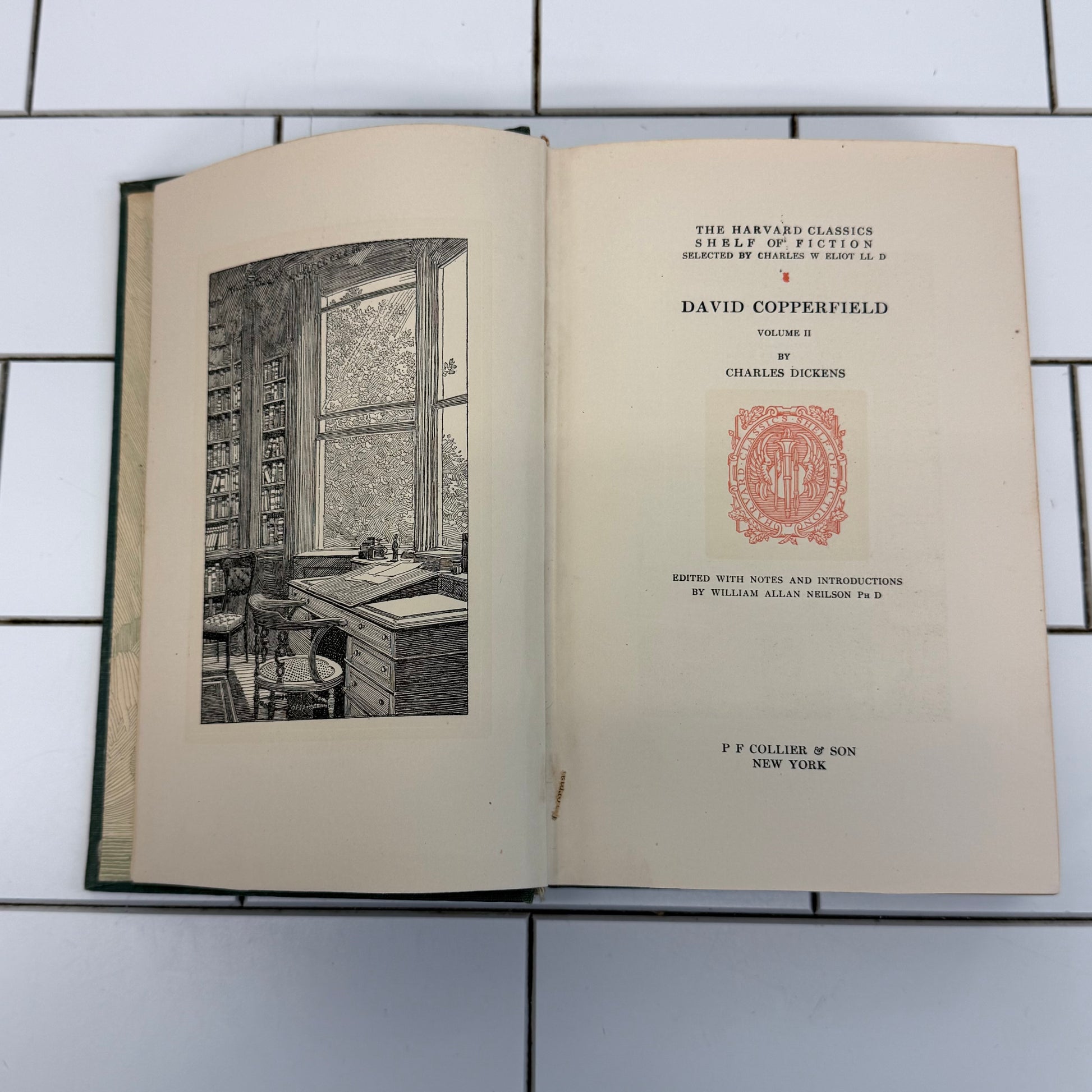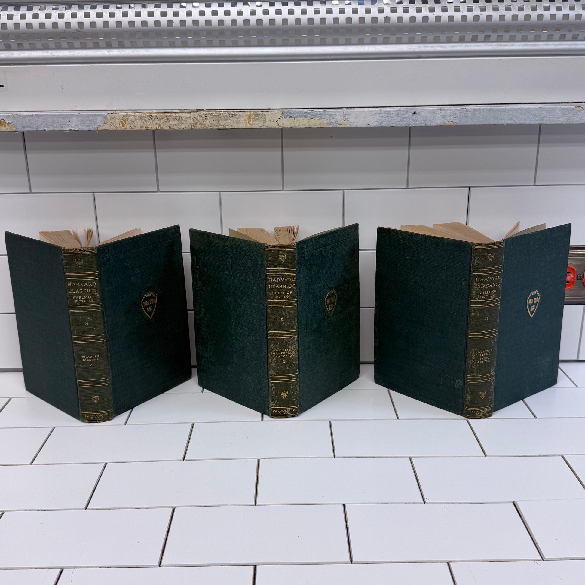 Harvard Classics 1917, Shelf of Fiction books, vintage Dickens volume, Vanity Fair Thackeray 1917, Jane Austen Pride and Prejudice 1917, Laurence Sterne Sentimental Journey, early 20th century book set, antique clothbound classics, collectible literary set, Harvard Classics fiction