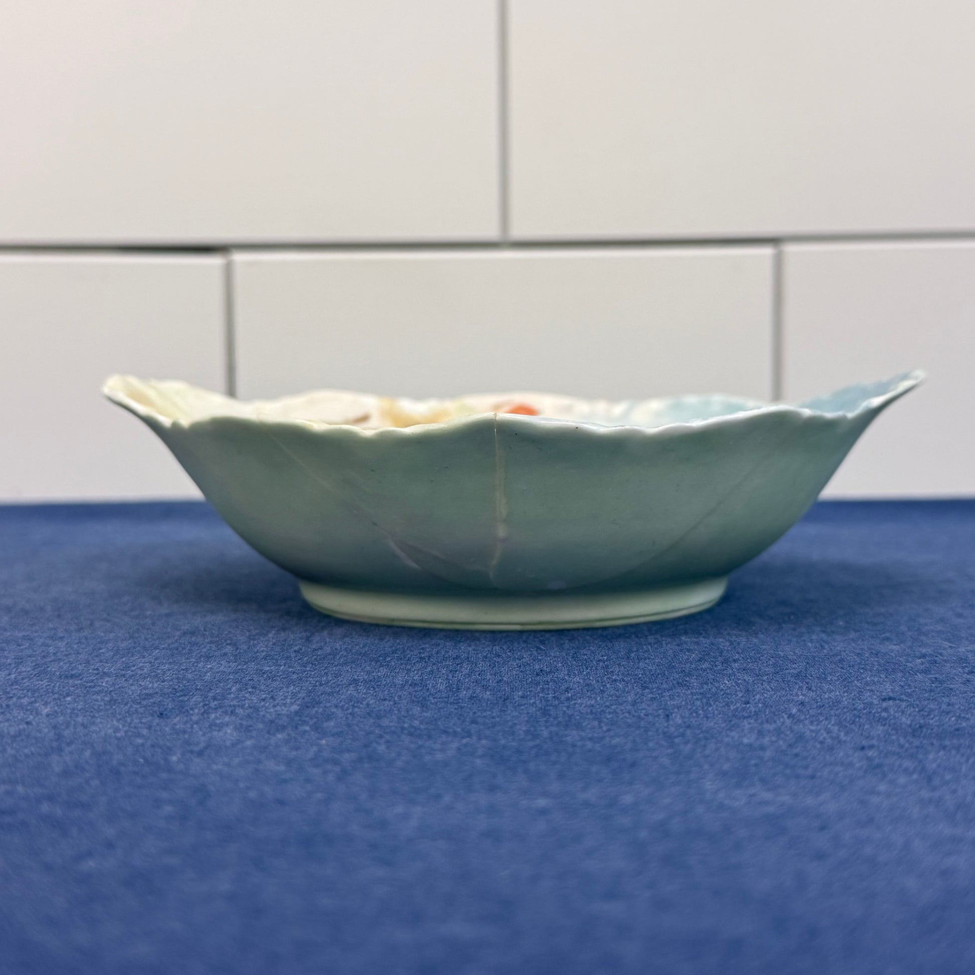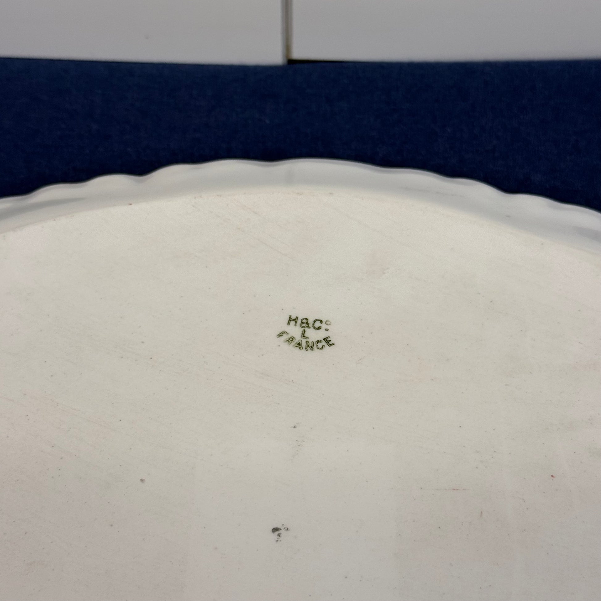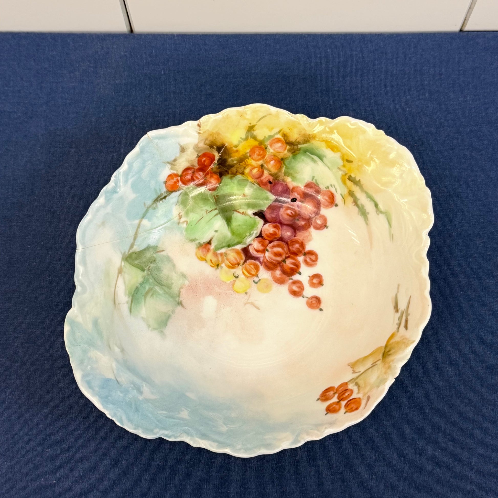 Delicate artistry and classic French craftsmanship come together in this Haviland & Co. Limoges Serving Tray & Bowl set, beautifully decorated with soft pastel washes and hand-painted floral motifs. The tray features elegant open handles and a gently scalloped rim framing vibrant poppies against a dreamy blend of celadon green, blush, and sky blue—hallmarks of early 20th-century Limoges porcelain design. The coordinating bowl echoes the romantic palette with fruit and floral accents, creating a cohesive display perfect for serving confections, berries, or afternoon tea accompaniments. Crafted in Limoges, France, this porcelain set reflects Haviland’s reputation for refined glazing and painterly detail. The tray is in good vintage condition with minor wear consistent with age and use. The bowl is in fair vintage condition with moderate wear and repaired cracks, which are reflected in its condition but do not diminish its decorative charm. An elegant addition to a Limoges collection or a beautifully styled vintage tablescape.