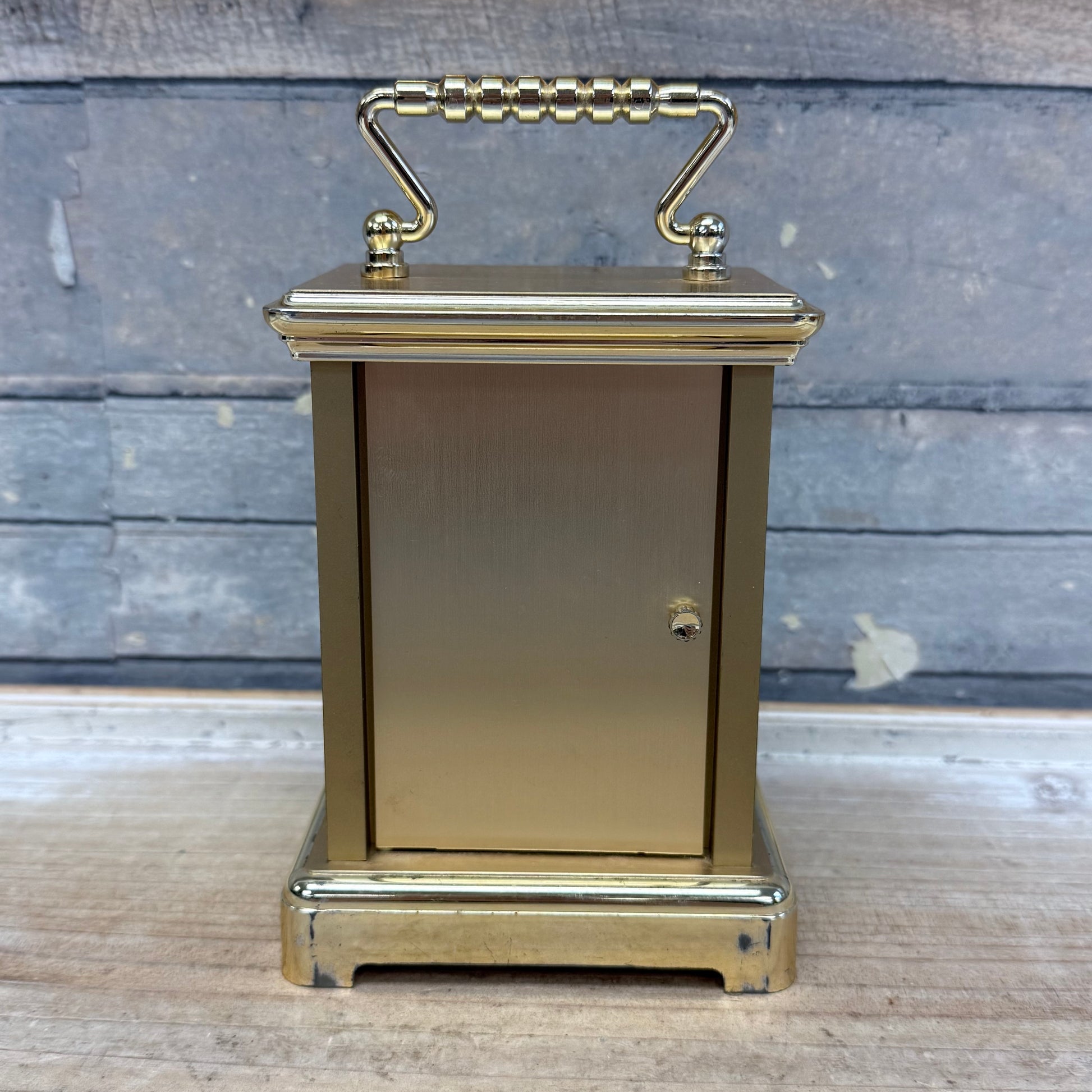 Keywords: Hermle clock, West Germany, quartz table clock, vintage timepiece, brass finish, floral design, collectible clock, Fremont model, black and gold decor, working vintage clock