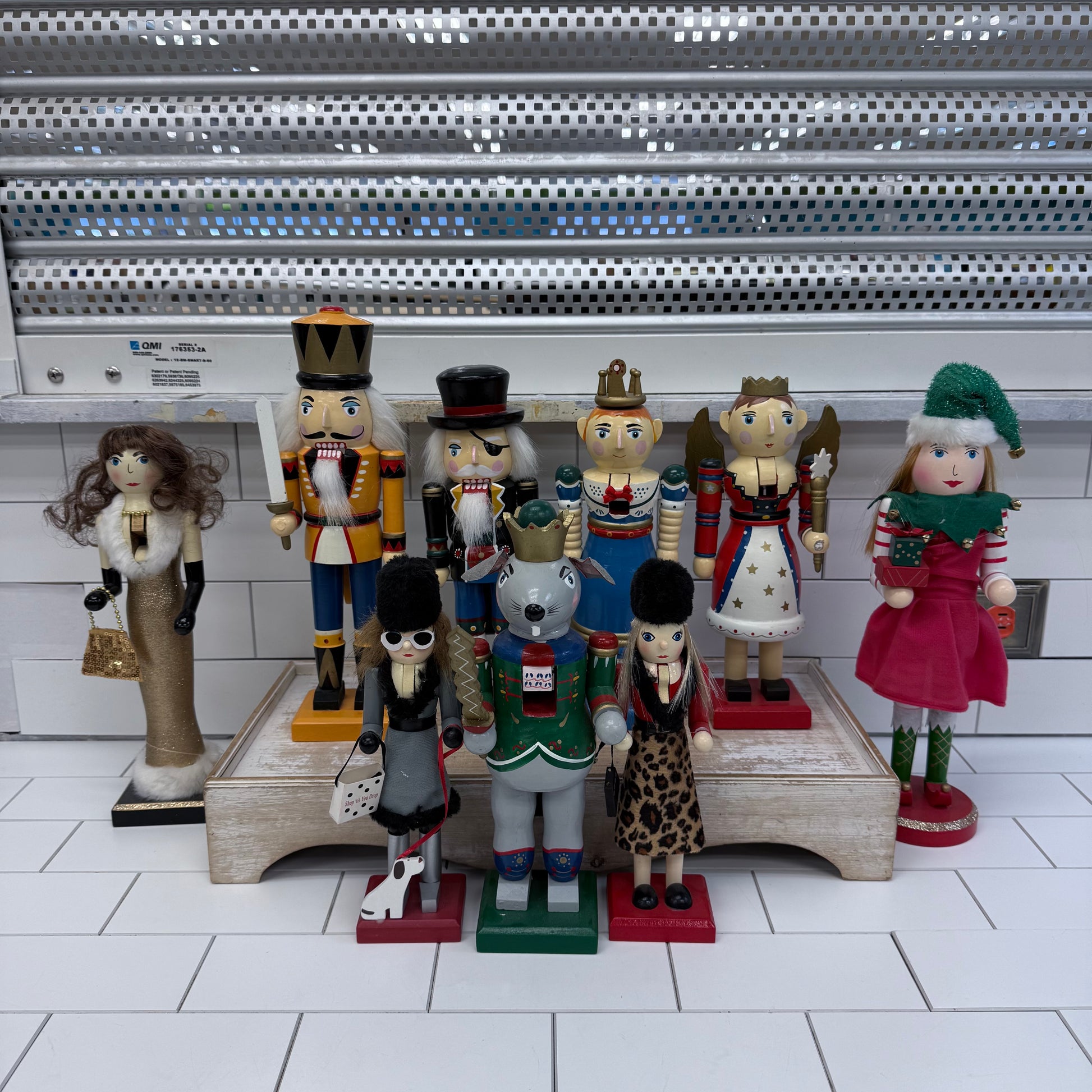 Add festive flair to your holiday décor with this Holiday Wooden Nutcracker Figurine Selection, featuring a variety of designs from classic soldiers to stylish divas. Each piece is crafted from wood and brings a whimsical, collectible touch to mantels, shelves, or tables. All are in good vintage condition with minor wear consistent with age and use, making them a charming addition for collectors or anyone looking to brighten their seasonal displays.