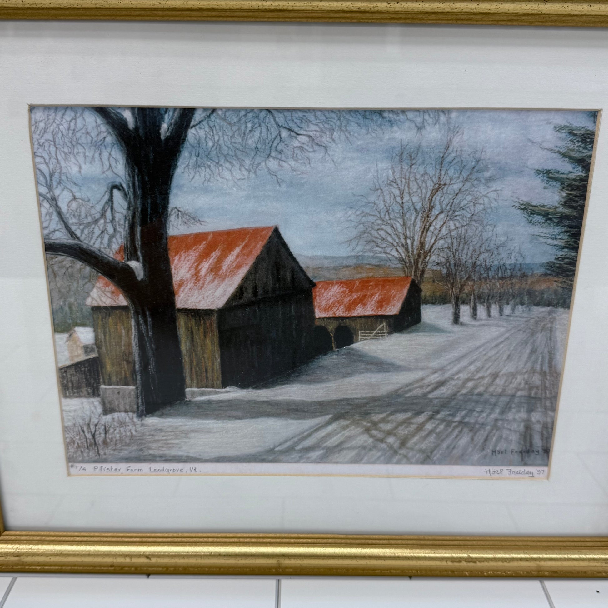 Keywords: Hörl Freiday, Pfister Farm, signed print, numbered edition, 1997, Landgrove VT, framed art, vintage artwork, limited edition, Americana, farm art