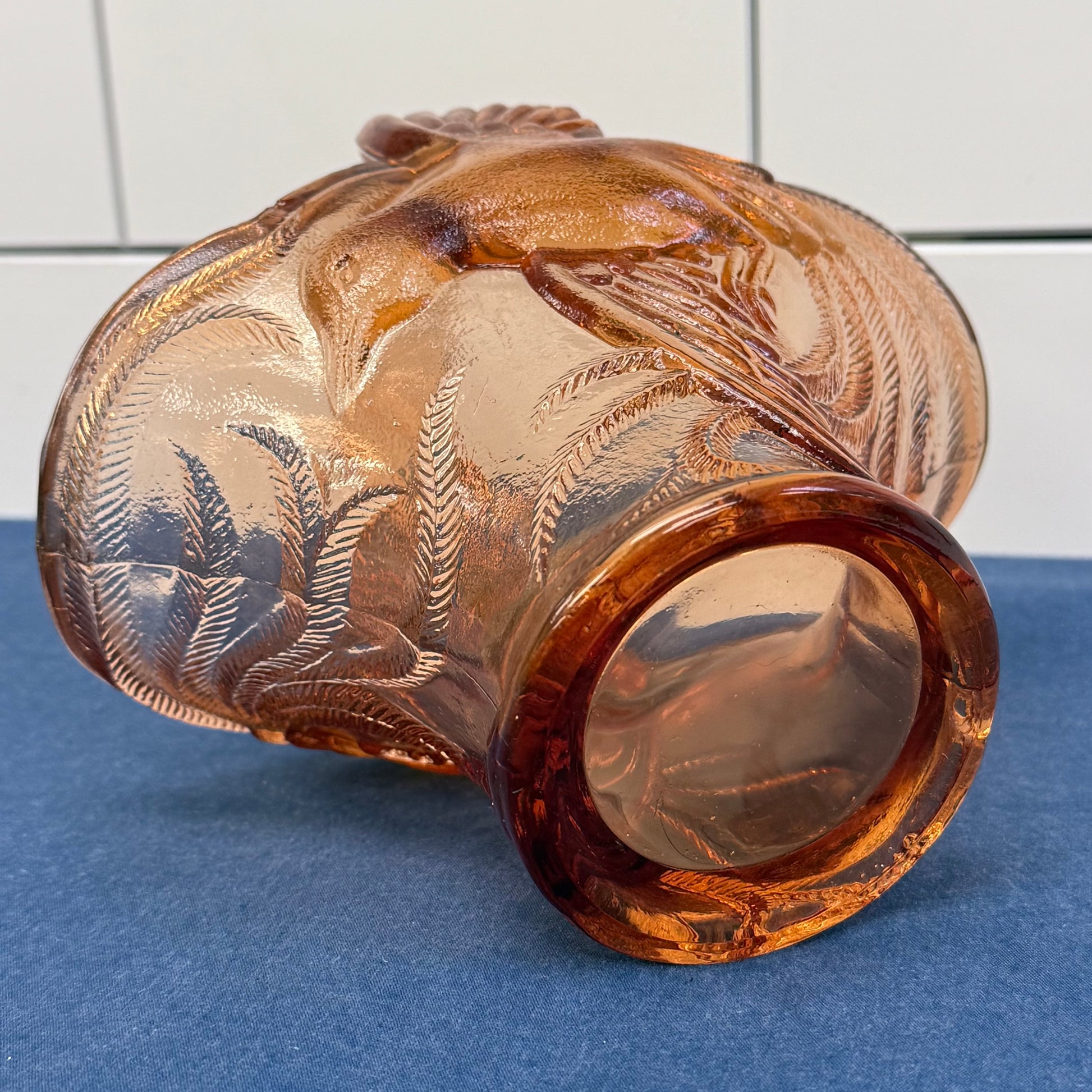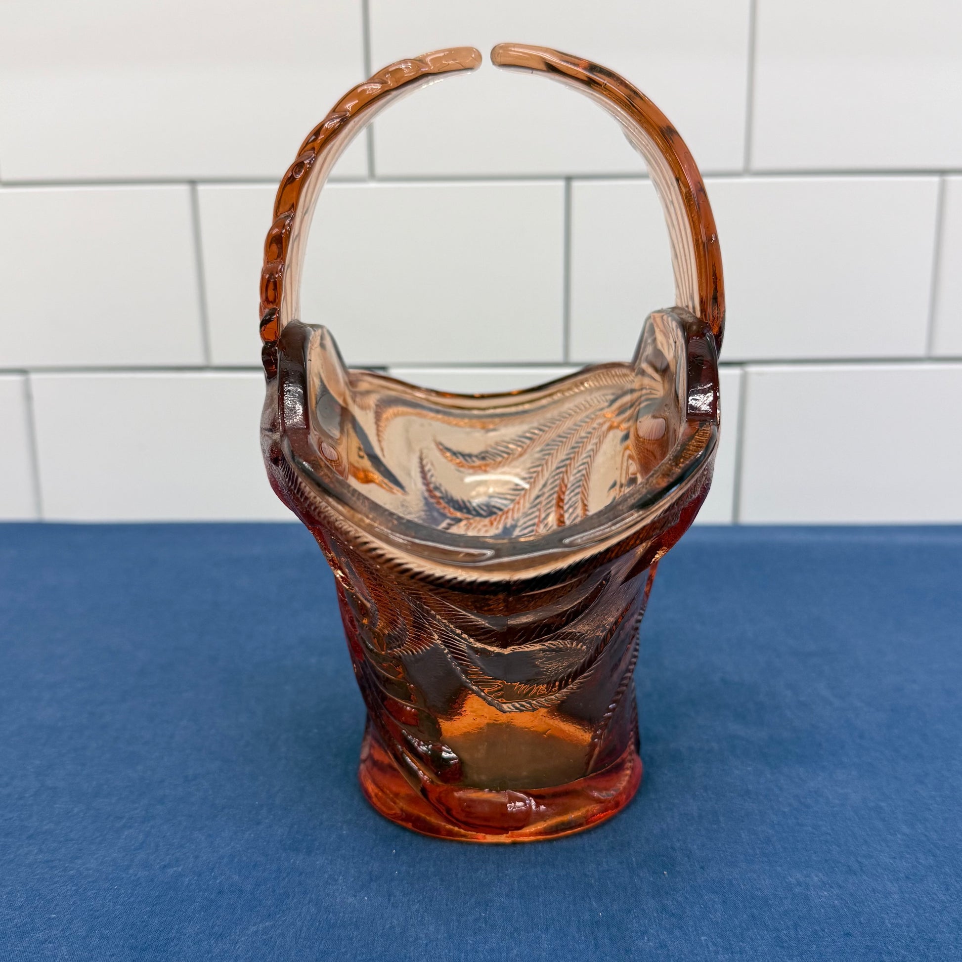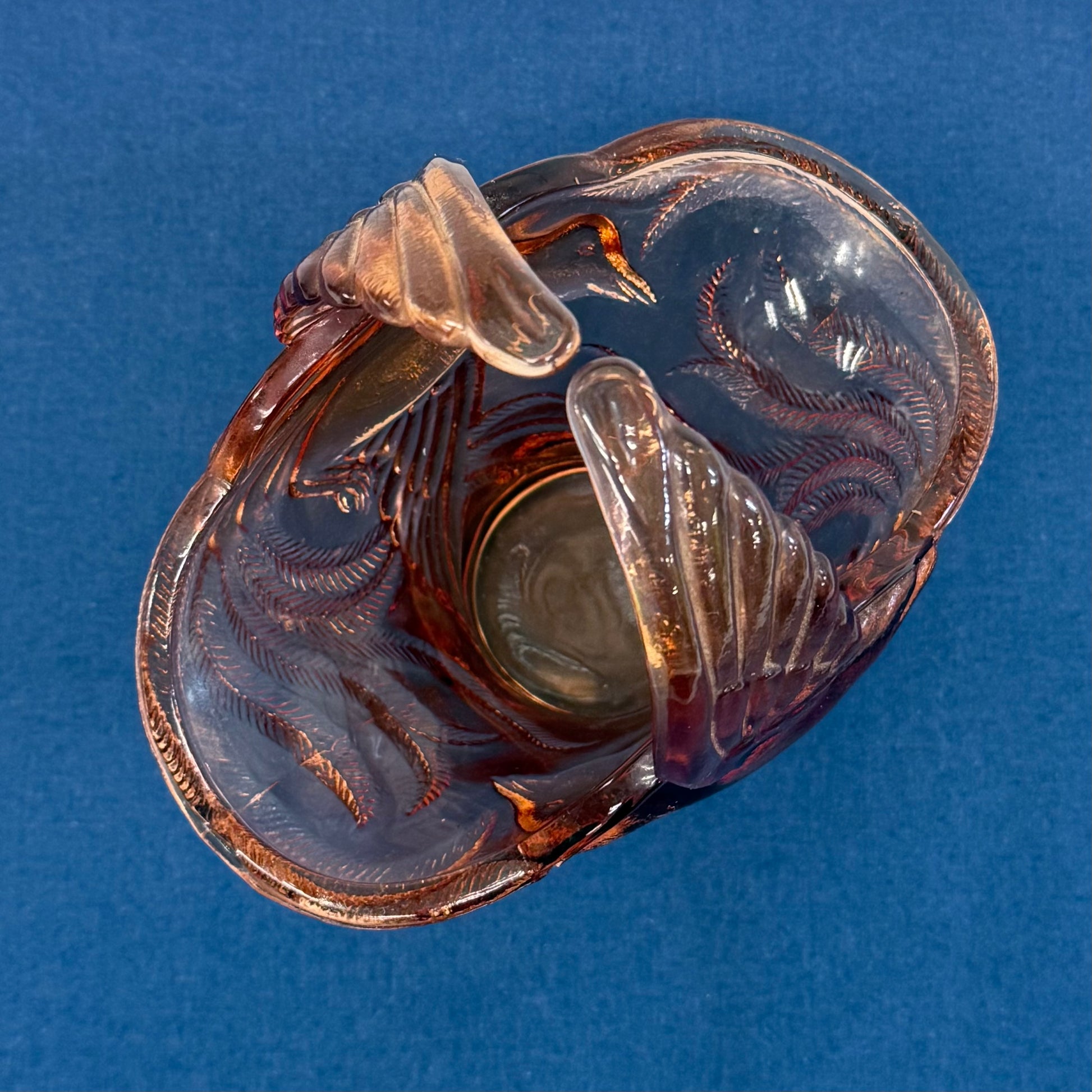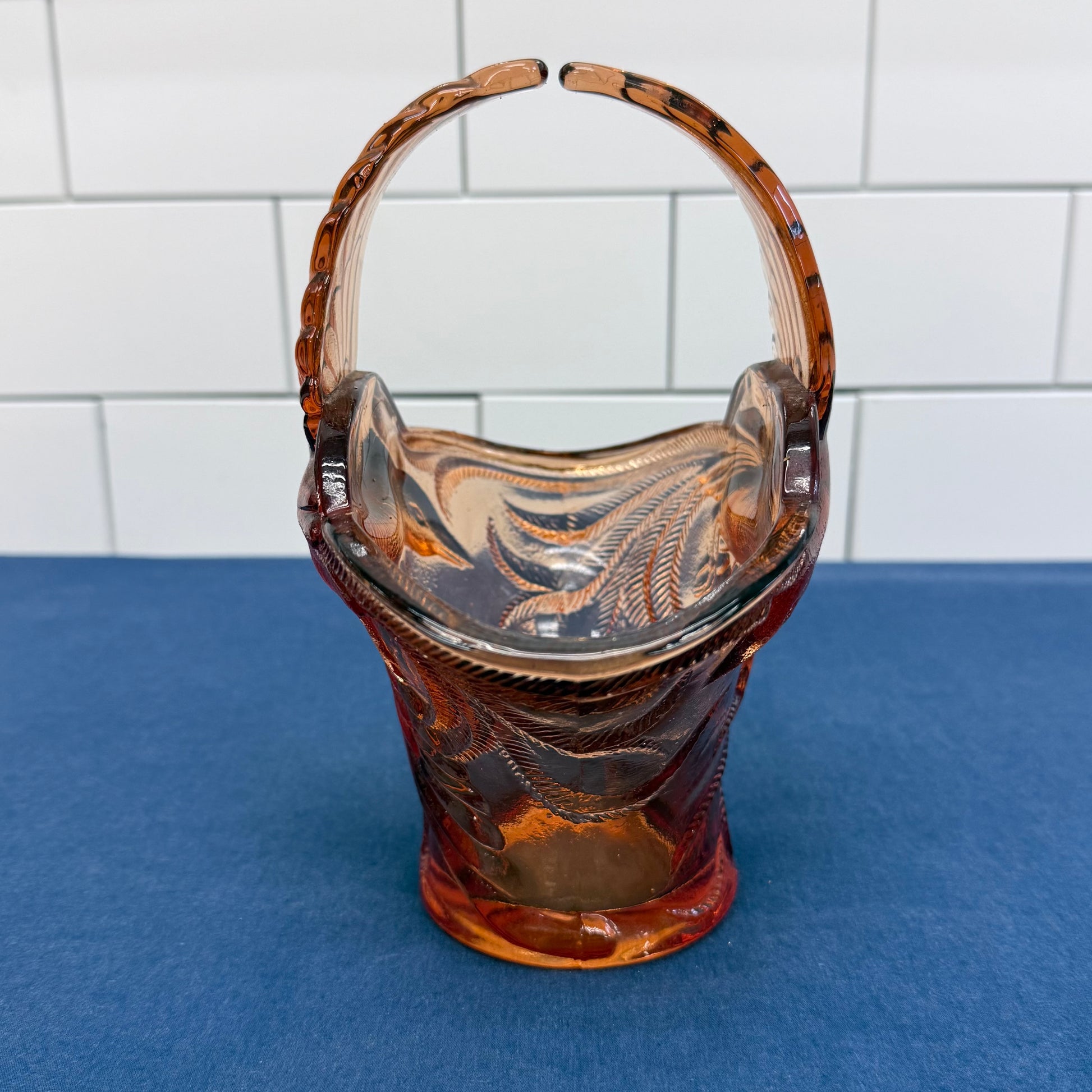 Radiating warm amber brilliance, this Indiana Glass Empress Bird of Paradise basket is a striking example of mid-century pressed glass artistry. The sculptural form features elegantly molded birds in flight, their wings sweeping upward to form the dramatic handle, while intricate feather and foliage detailing wraps the flared body of the basket. The rich amber hue glows beautifully in natural light, enhancing the dimensional relief and lending a vibrant, almost jewel-toned warmth to any display. Measuring approximately 7” x 5” x 8”, this piece is offered in great vintage condition and makes a bold centerpiece for a coffee table, vanity, or curated glass collection. Both decorative and iconic, it captures the romantic, nature-inspired styling that made Indiana Glass a beloved name in American pressed glass.