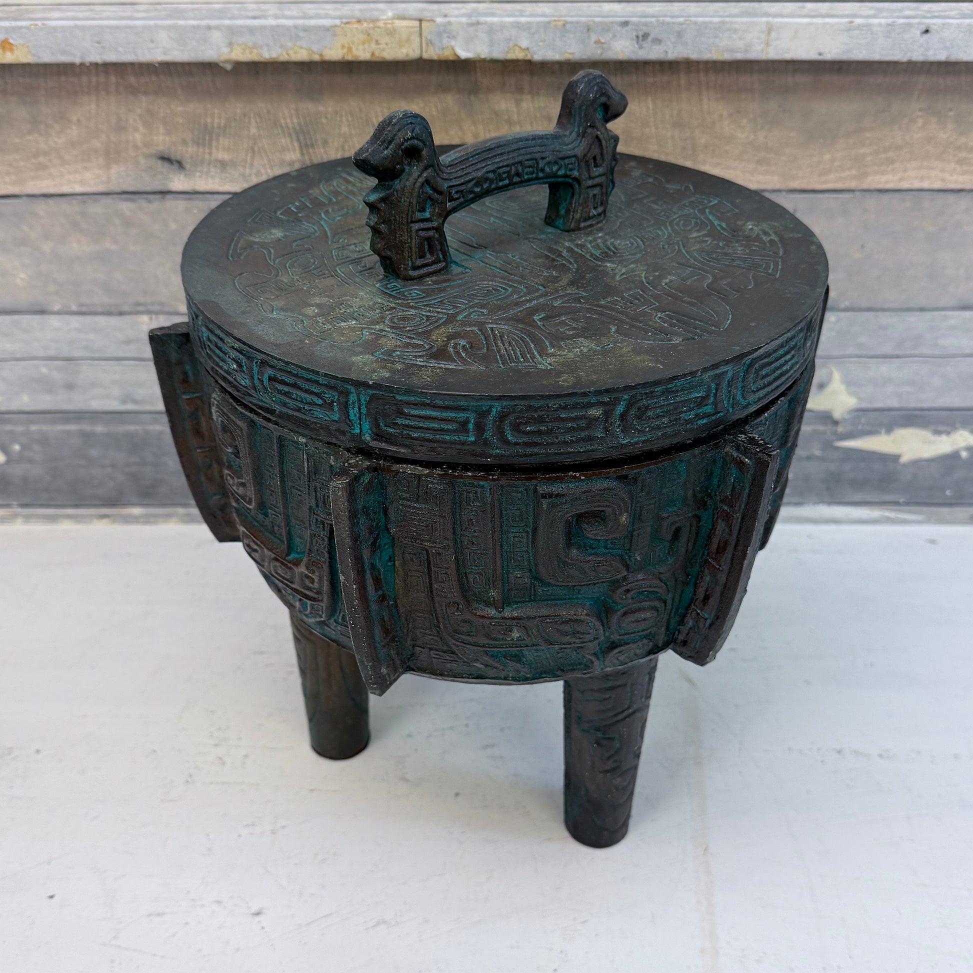 James Mont style, bronze ice bucket, Aztec design, Mayan motif, verdigris patina, vintage barware, mid-century Hollywood Regency, sculptural ice bucket, decorative bronze, retro cocktail decor