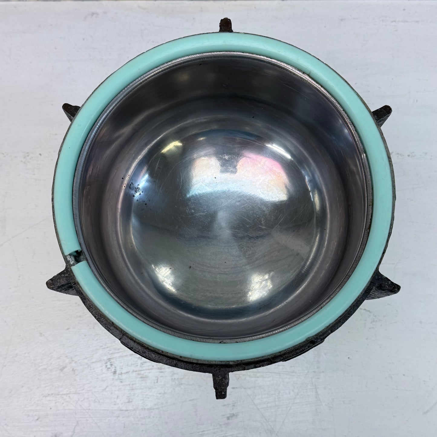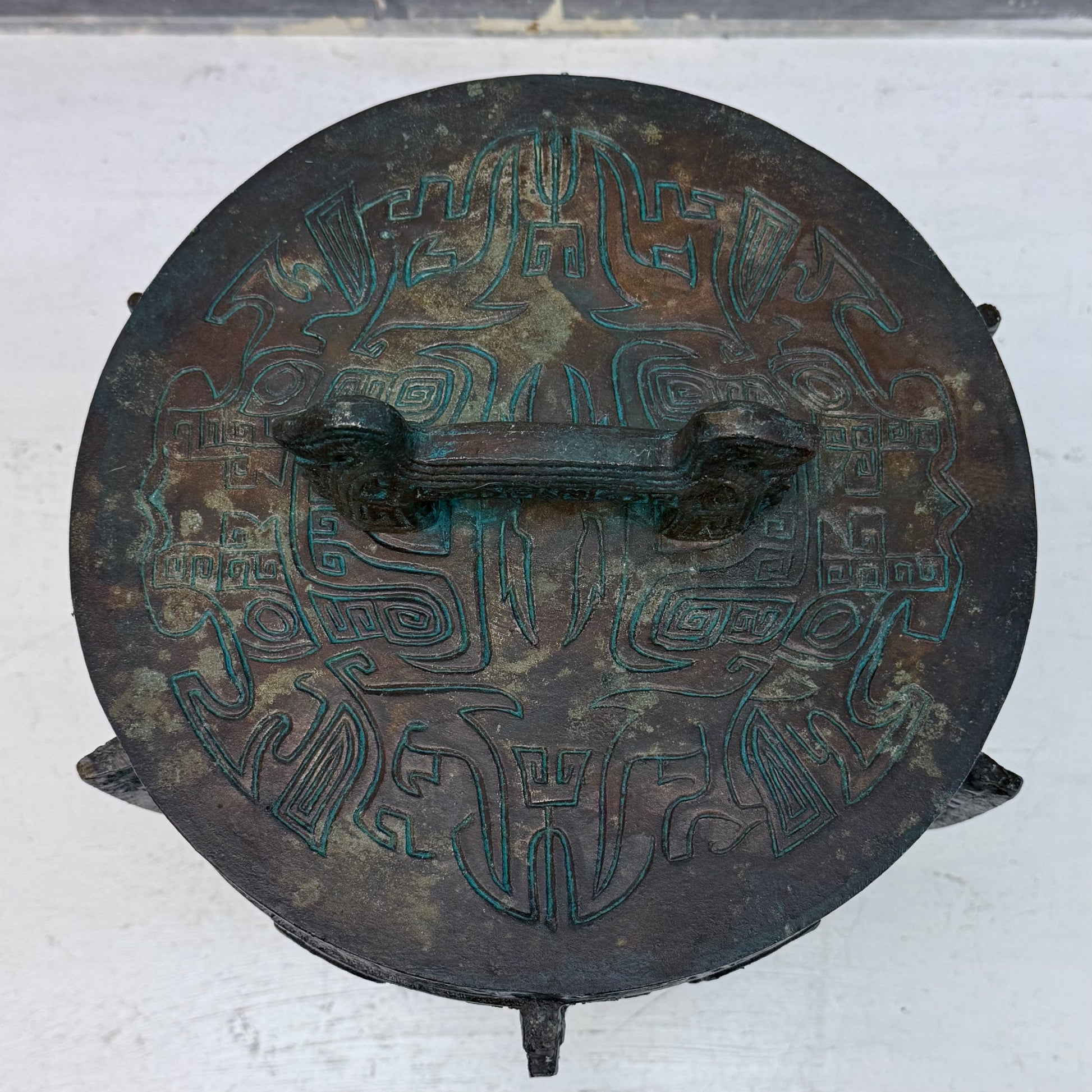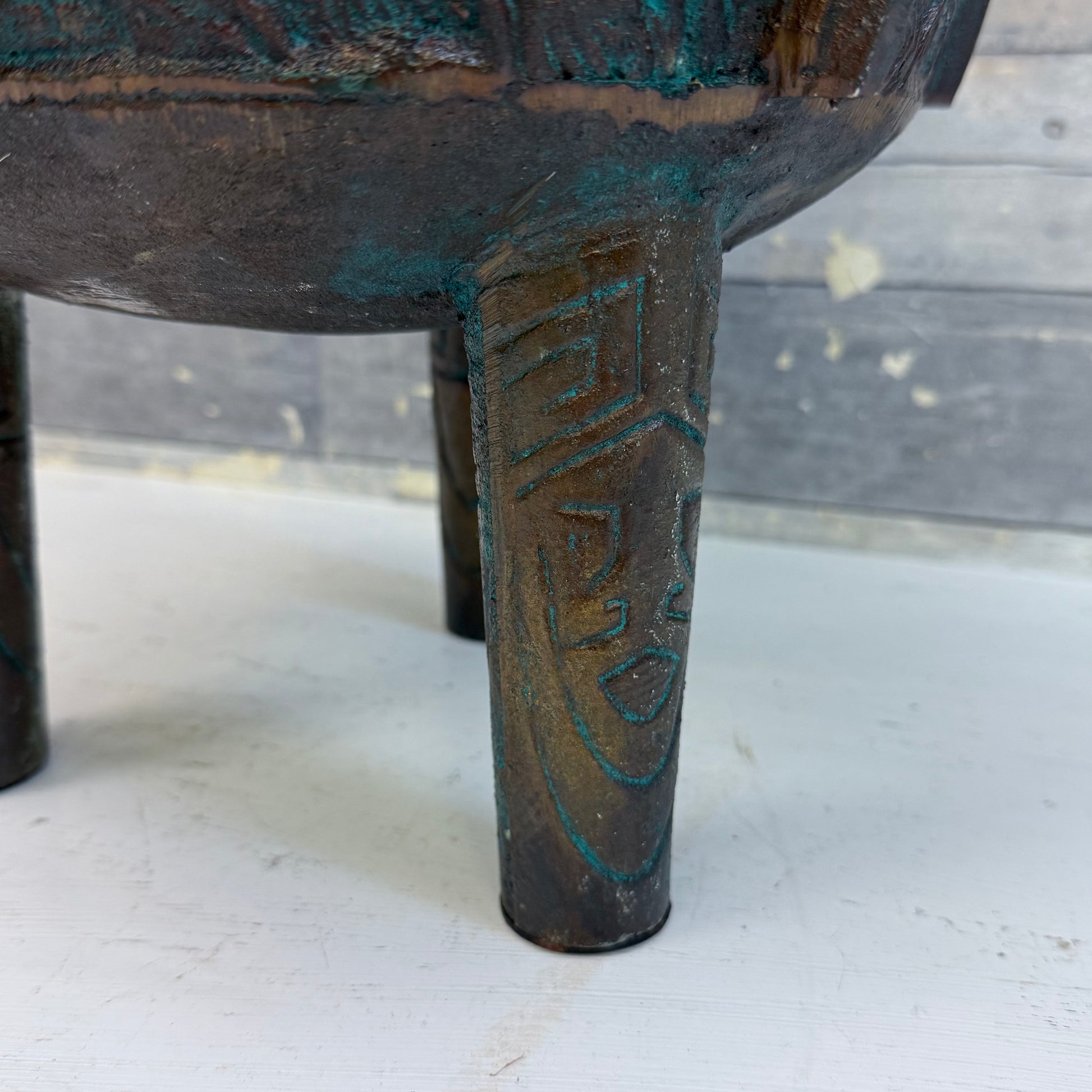 Make a bold statement with this James Mont Style Bronze Ice Bucket, featuring striking Aztec/Mayan-inspired relief designs and a rich verdigris patina that highlights its sculptural form. Measuring 12”x14”, this substantial piece blends mid-century Hollywood Regency flair with ancient motifs, reflecting the dramatic and eclectic aesthetic associated with Mont’s legendary designs. In good vintage condition with minor wear from age and use, it’s both functional and decorative—perfect for barware collectors or those seeking a standout accent piece.