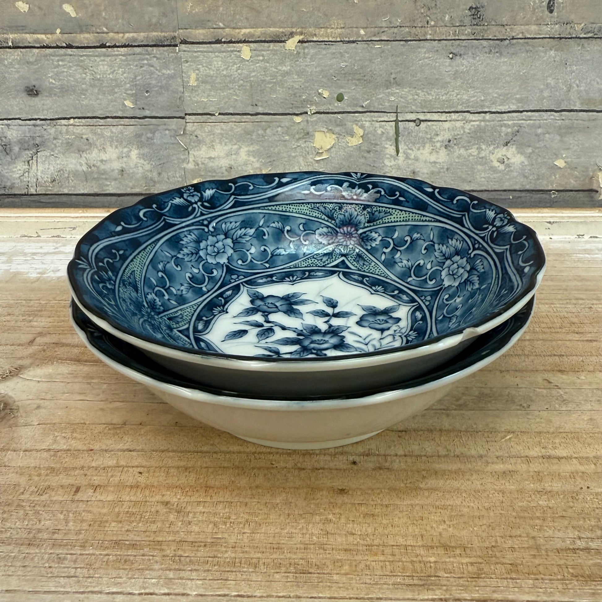 Japanese blue and white bowls, vintage pottery, floral fruit bowls, collectible Japanese ceramics, hand-painted tableware, traditional Japanese design, vintage kitchenware, decorative serving bowls, maker’s mark, functional pottery set