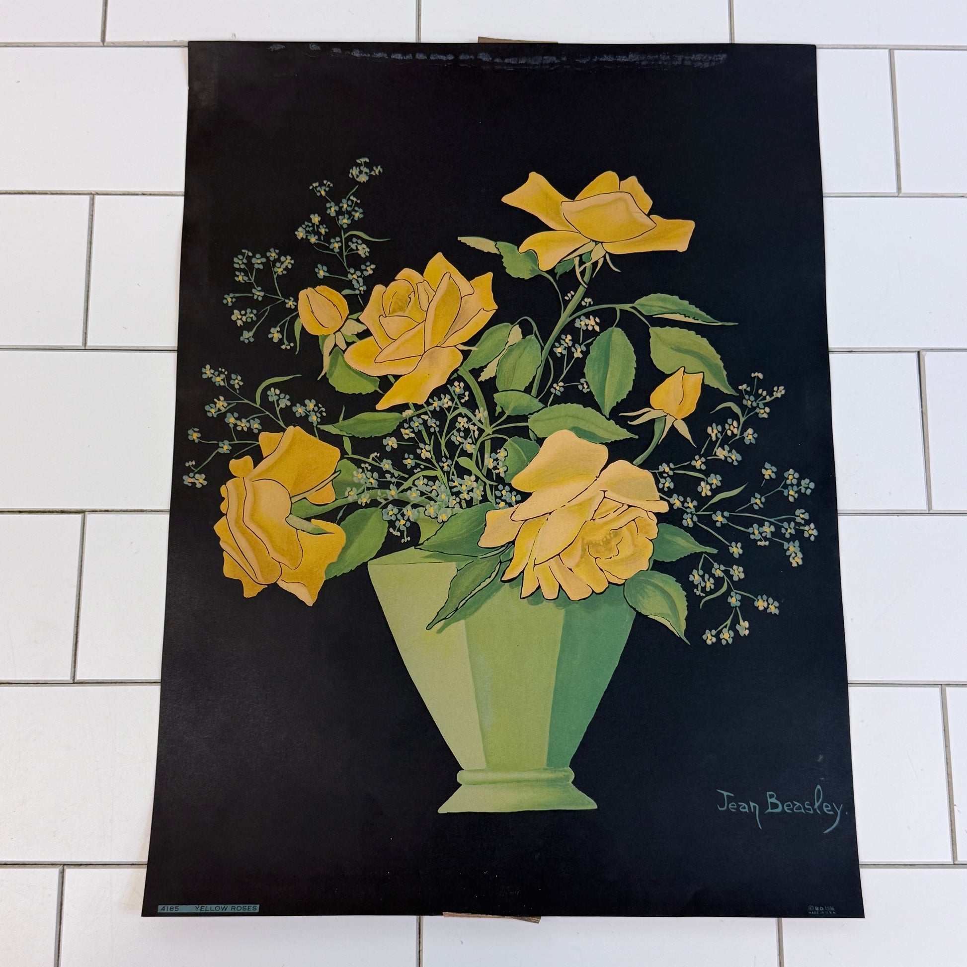 Jean Beasley lithograph, Yellow Roses print 1936, vintage floral wall art, 1930s American print, antique rose artwork, BD published print USA, romantic cottage decor, pre war floral lithograph, collectible 1936 art print, vintage botanical illustration