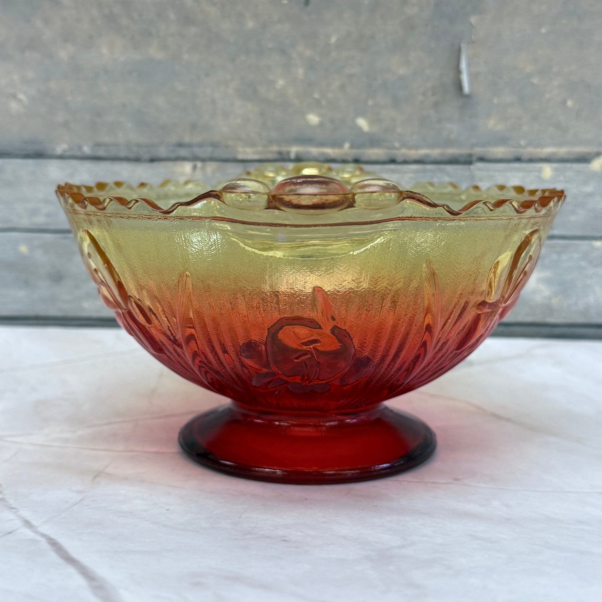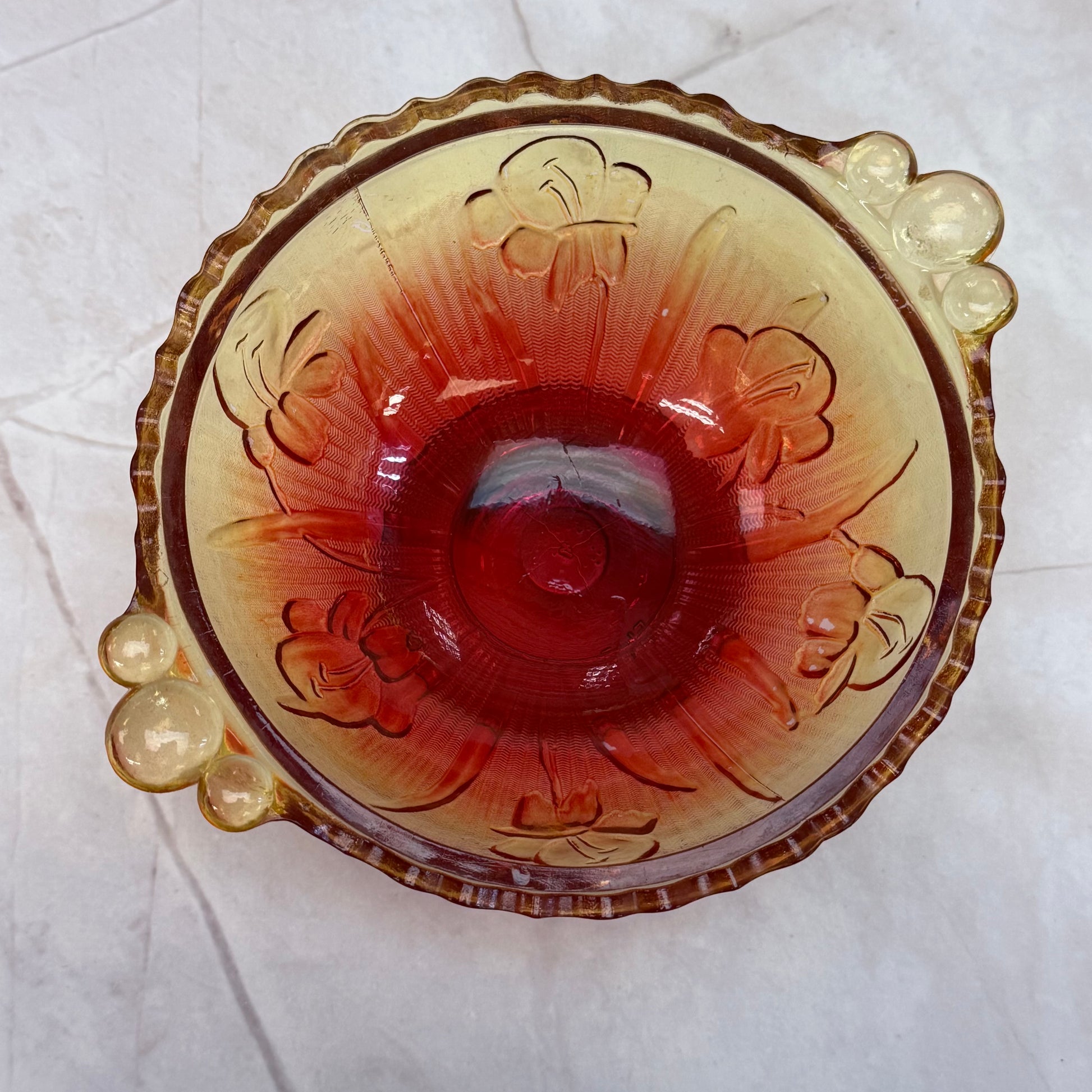amberina glass, Jeannette Glass, Iris and Herringbone, vintage compote, collectible glassware, Depression glass style, pedestal compote, floral pattern glass, amberina centerpiece, vintage décor
