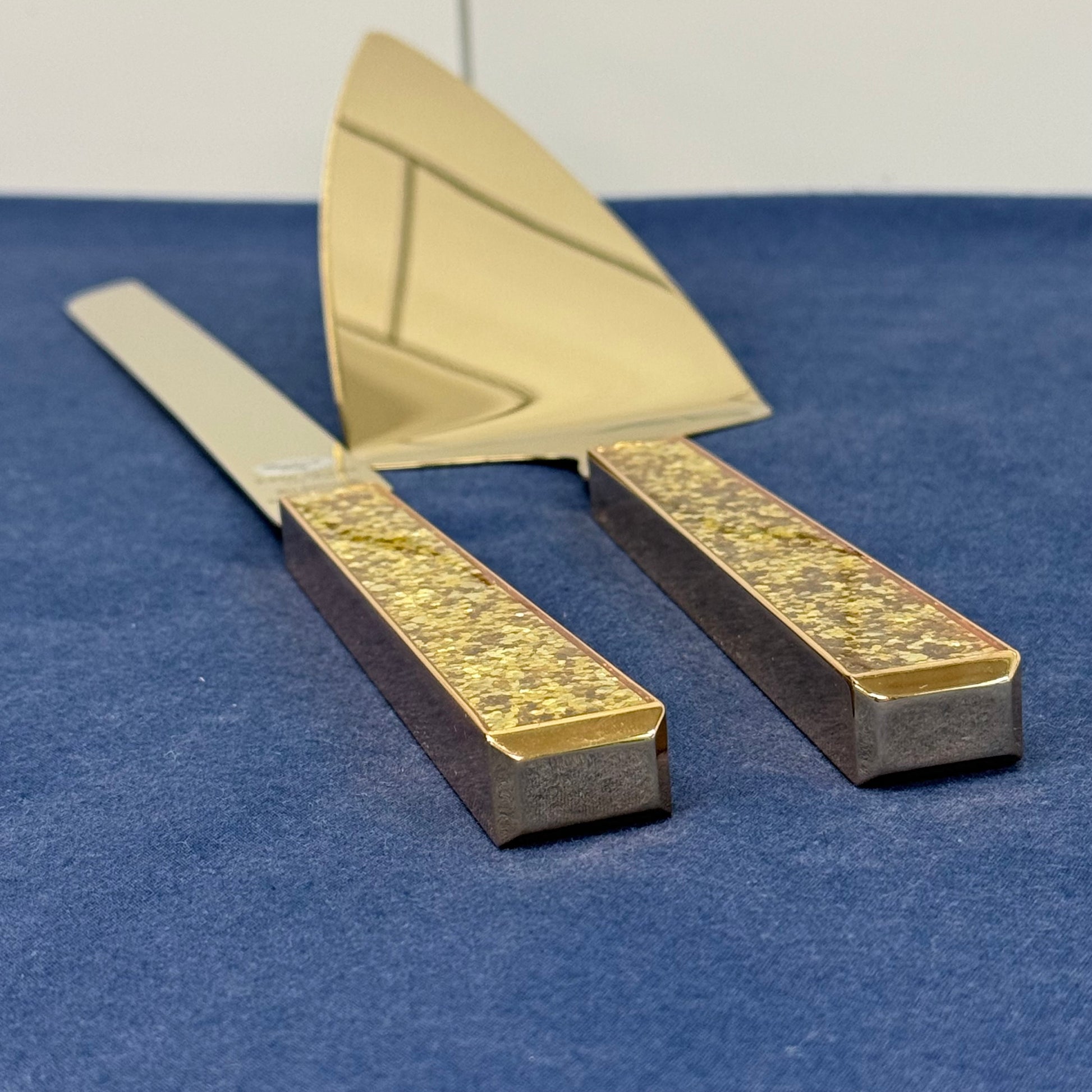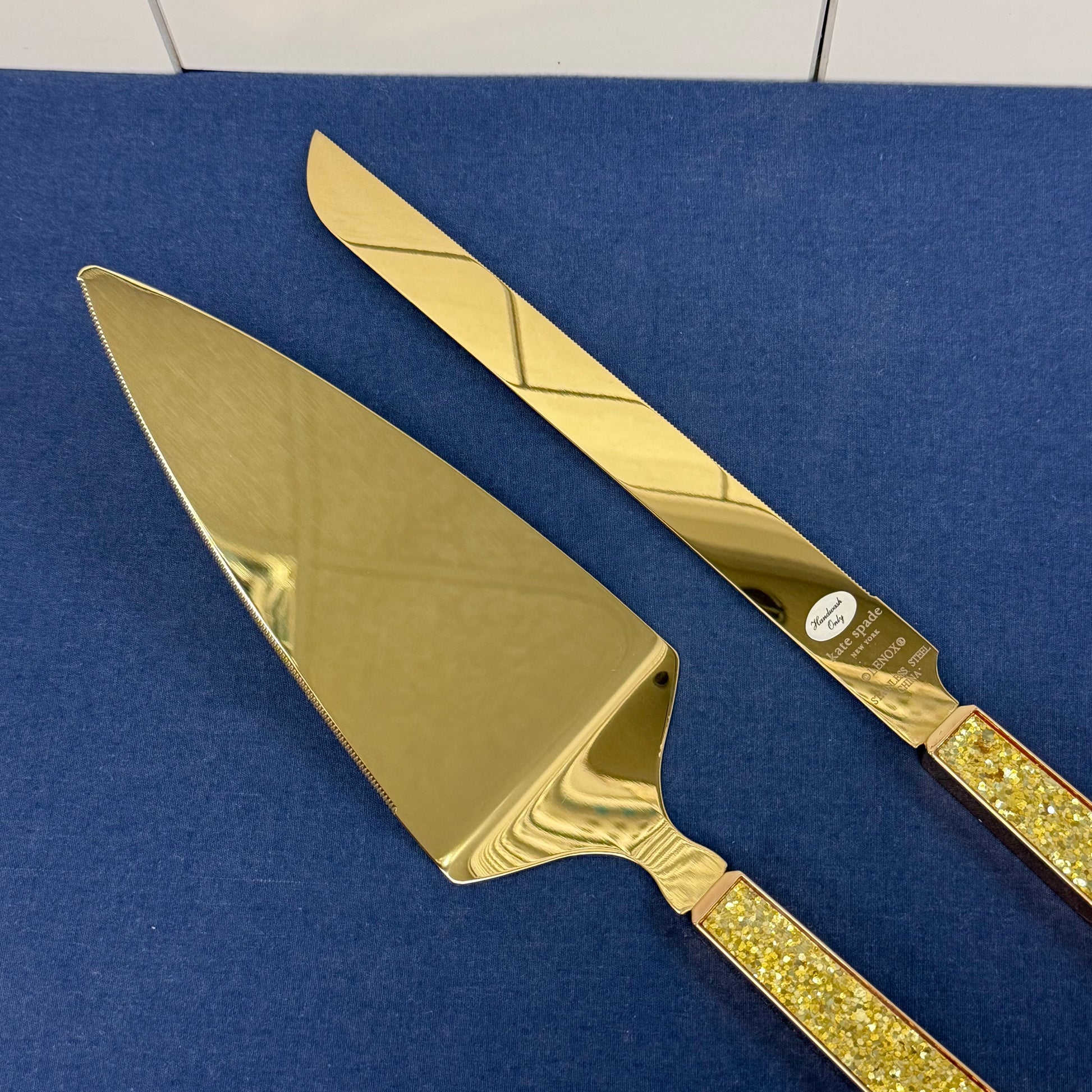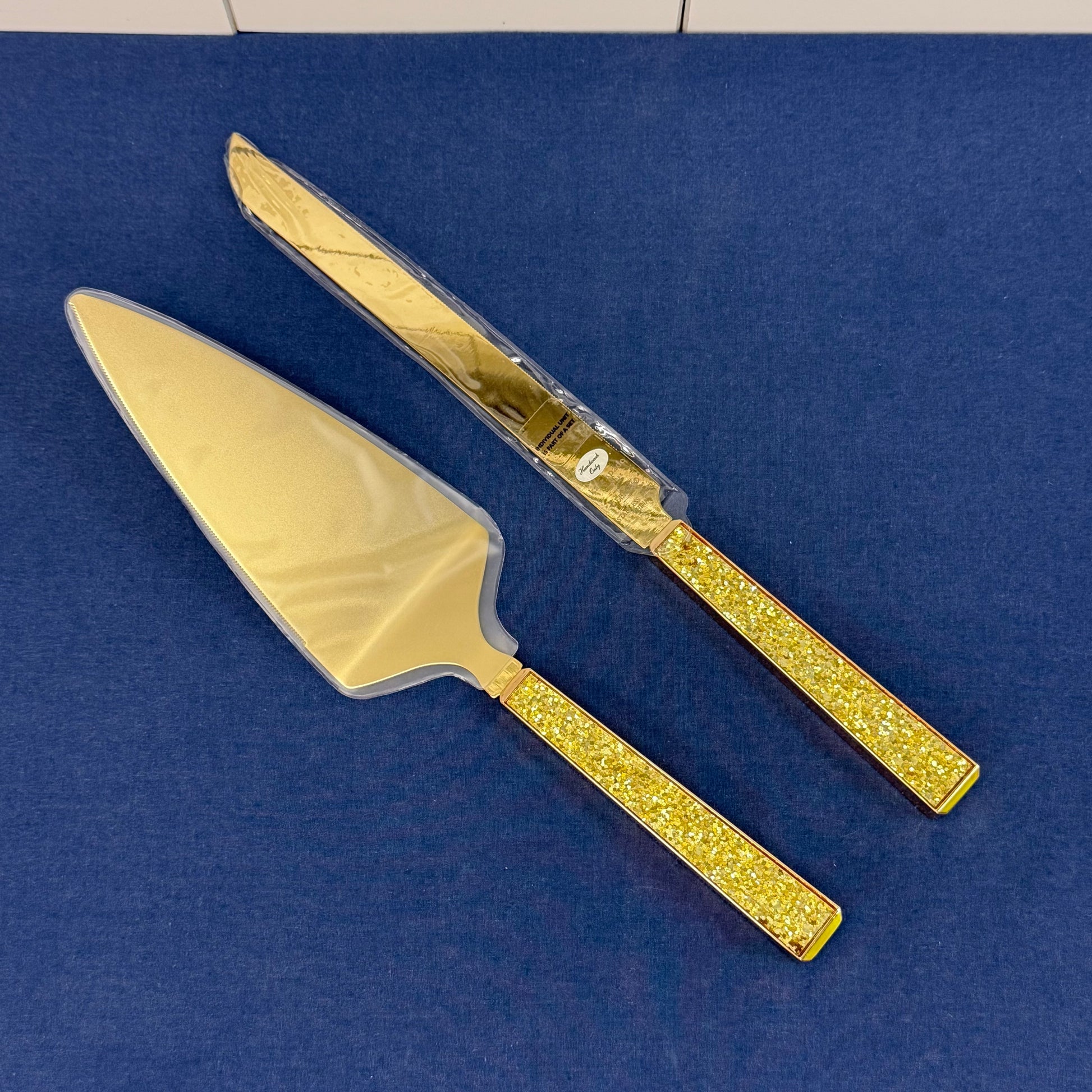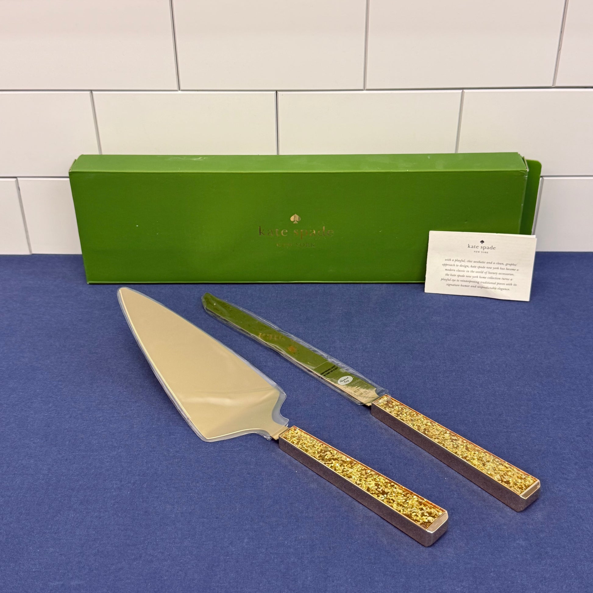 Elevate your entertaining with this Kate Spade Lenox Simply Sparkling Gold Dessert Serving Set, a sophisticated stainless steel cake knife and pie server duo designed to bring modern glamour to weddings, anniversaries, holiday gatherings, and everyday celebrations. Crafted by Lenox for Kate Spade New York, the Simply Sparkling Gold pattern features sleek, contemporary lines accented with refined gold-tone detailing that adds a subtle yet eye-catching shimmer to your dessert presentation. This like-new set comes in its original presentation box (box shows minor wear), making it ideal for gift-giving, bridal showers, engagement parties, or as an elegant addition to your own serveware collection. Durable stainless steel construction ensures lasting performance, while the elongated knife and generously sized server are perfectly proportioned for slicing and serving cakes, pies, and pastries with ease. A timeless blend of modern luxury and functional design, this boxed Kate Spade Lenox dessert serving set is a sought-after choice for stylish hosts and collectors of designer tabletop accessories.