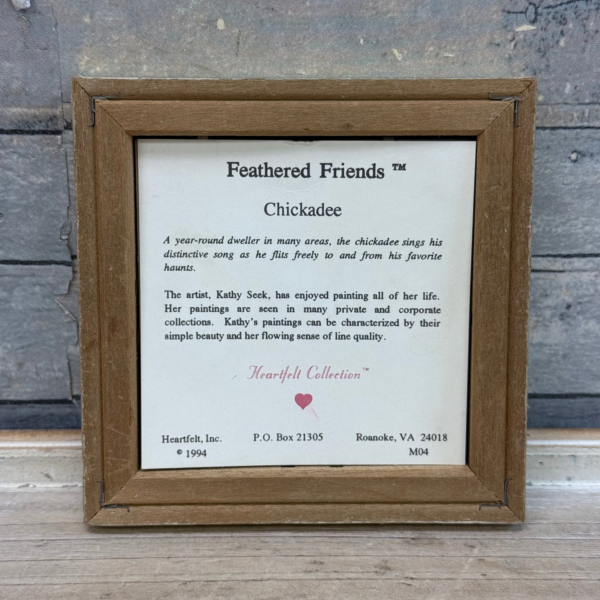 keywords: Kathy Seek art, chickadee print 1994, framed bird artwork, vintage wildlife print, nature wall décor, collectible art print, avian illustration, retro framed print, bird lover gift, vintage framed artwork
