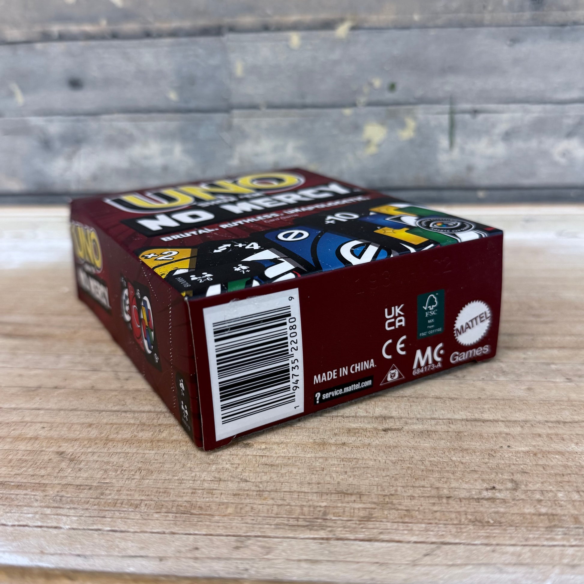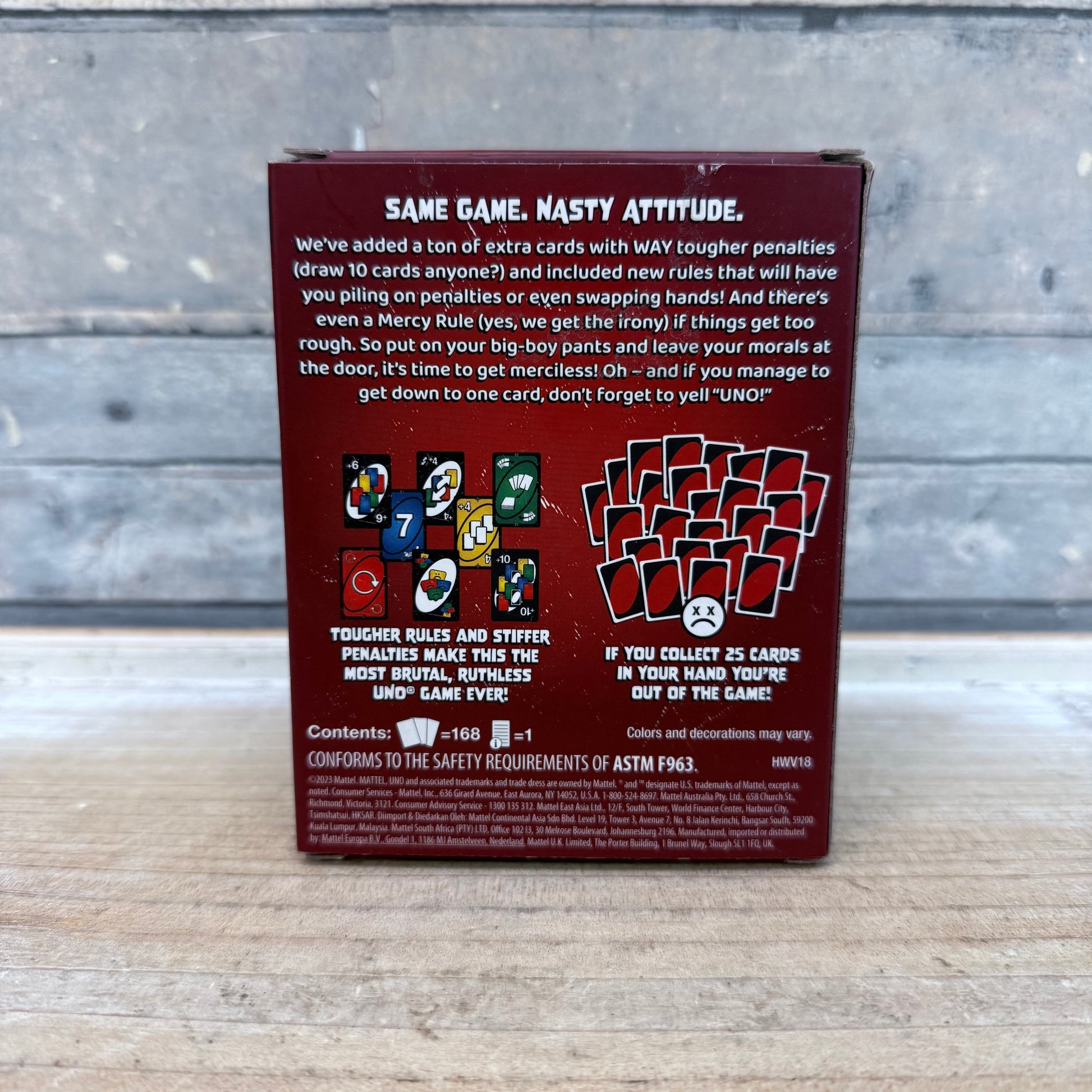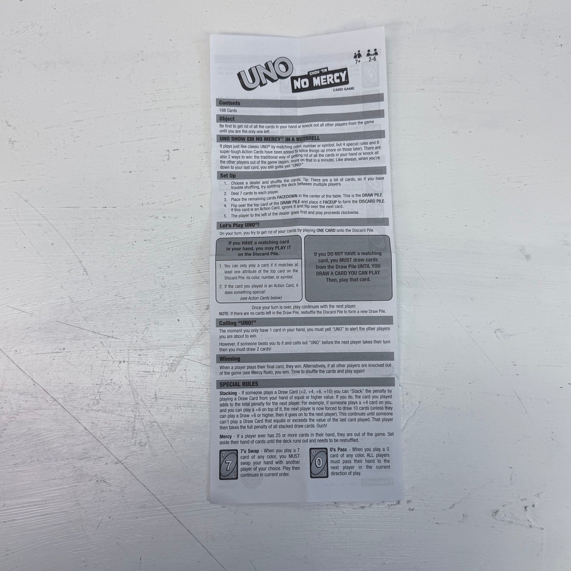 Bring the heat to game night with this Mattel Uno Show ‘Em No Mercy Card Game, a thrilling twist on the classic Uno that pushes competition to the next level. Verified complete with all cards and instructions, this set is in like new condition with only minor wear to the box. The cards are designed with a distressed, scratched-up look for extra attitude and edge, making gameplay feel even more intense. A must-have for Uno fans, collectors, or anyone who loves high-energy party games.