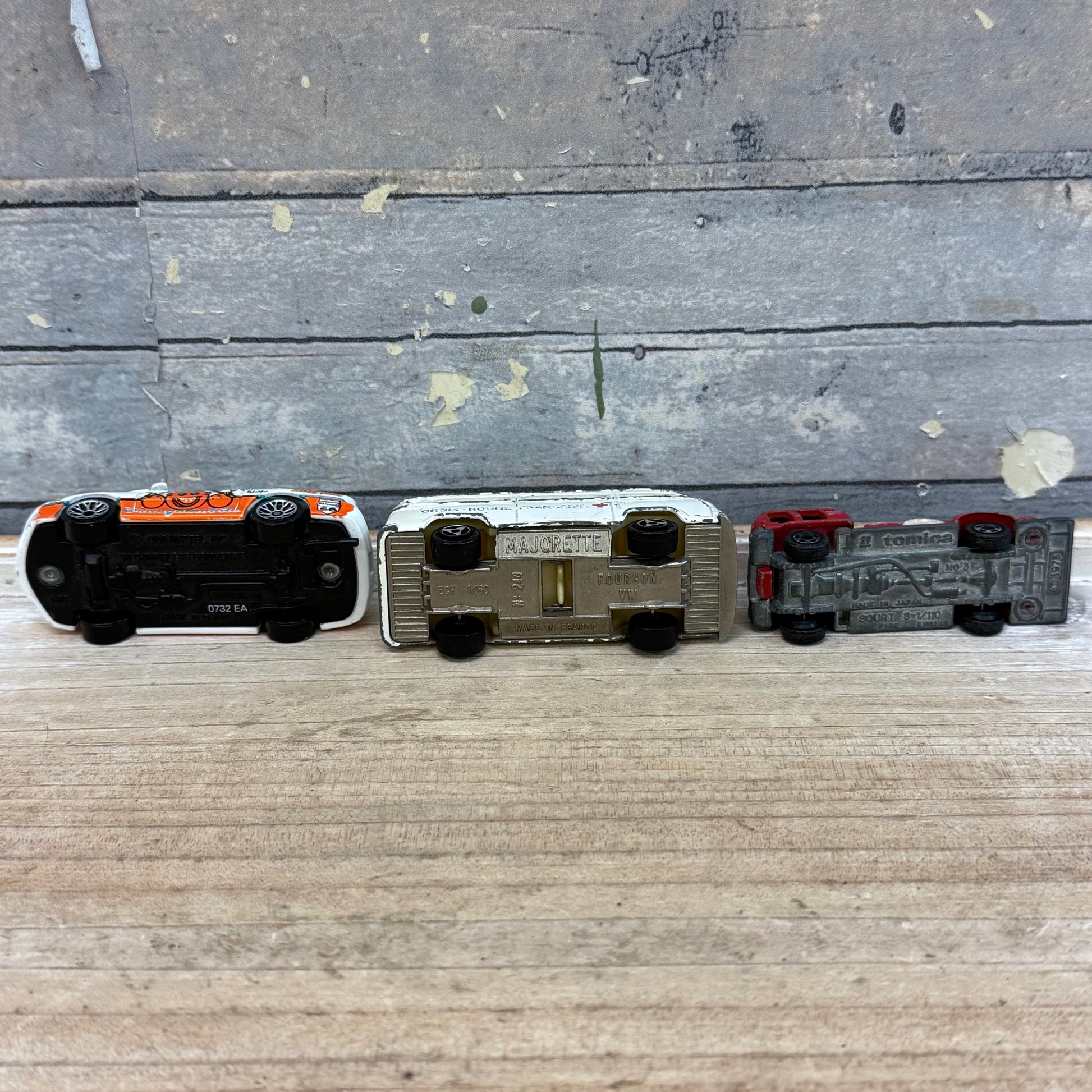 A fun and nostalgic collection of 17 vintage metal toy cars and trucks, featuring assorted brands including Matchbox, TootsieToy, Hot Wheels, Tomica, Revell, and more. Produced between 1975 and 1998, each vehicle shows minor wear consistent with age and play, adding to their authentic vintage charm. Perfect for collectors, enthusiasts, or as a playful display of classic miniature automobiles.