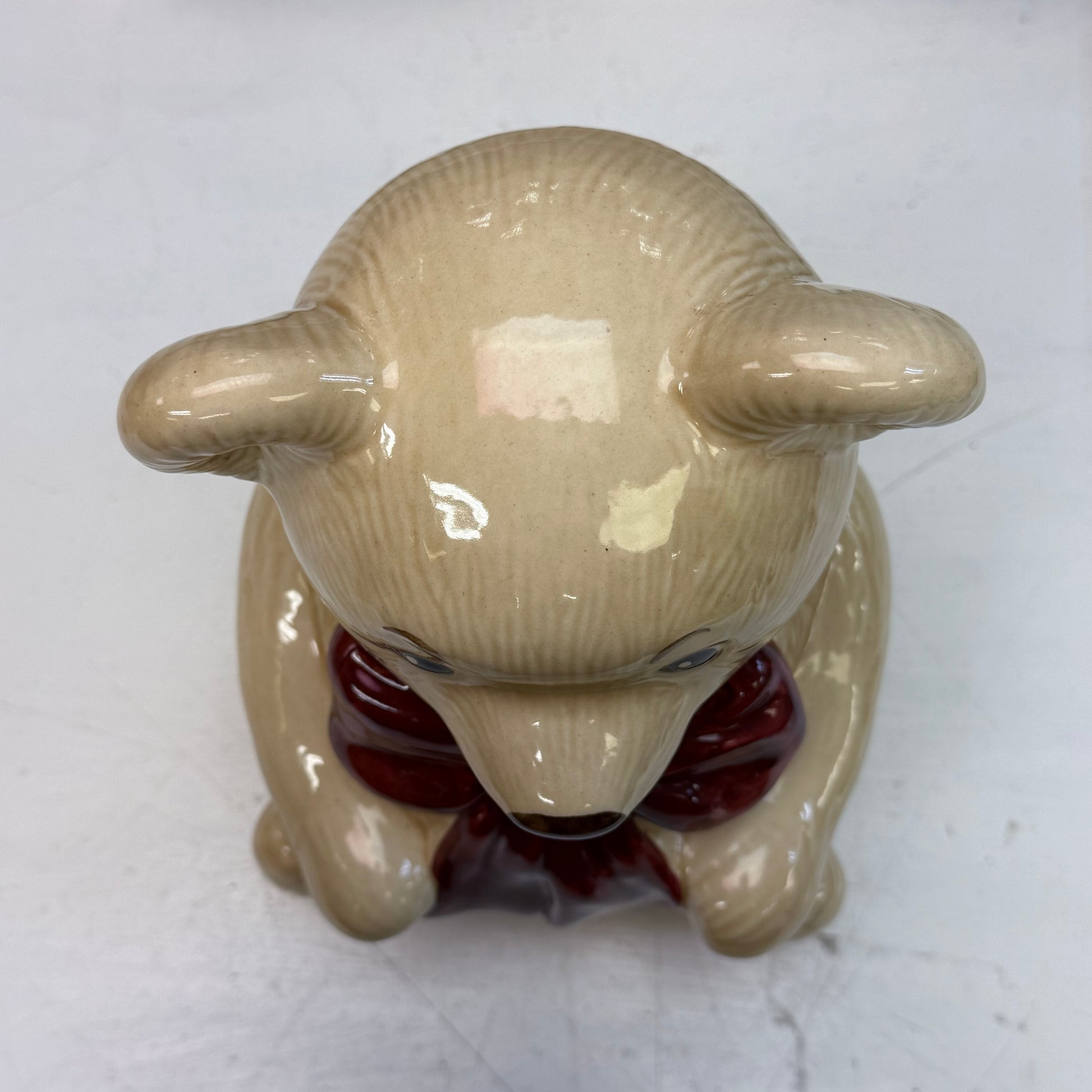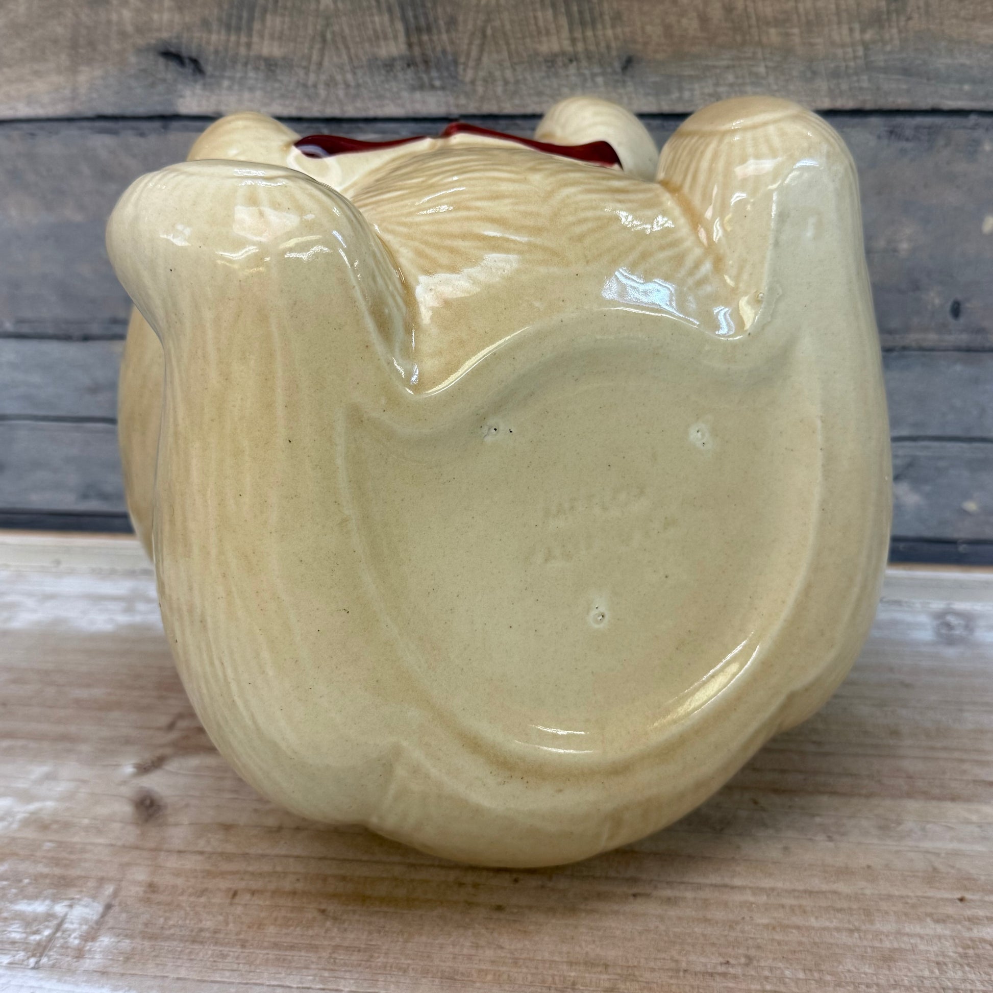 Keywords: Metlox, 1950s cookie jar, vintage teddy bear, ceramic cookie jar, California pottery, mid-century kitchen, collectible bear jar, retro decor, Metlox Poppytrail, red bow tie bear