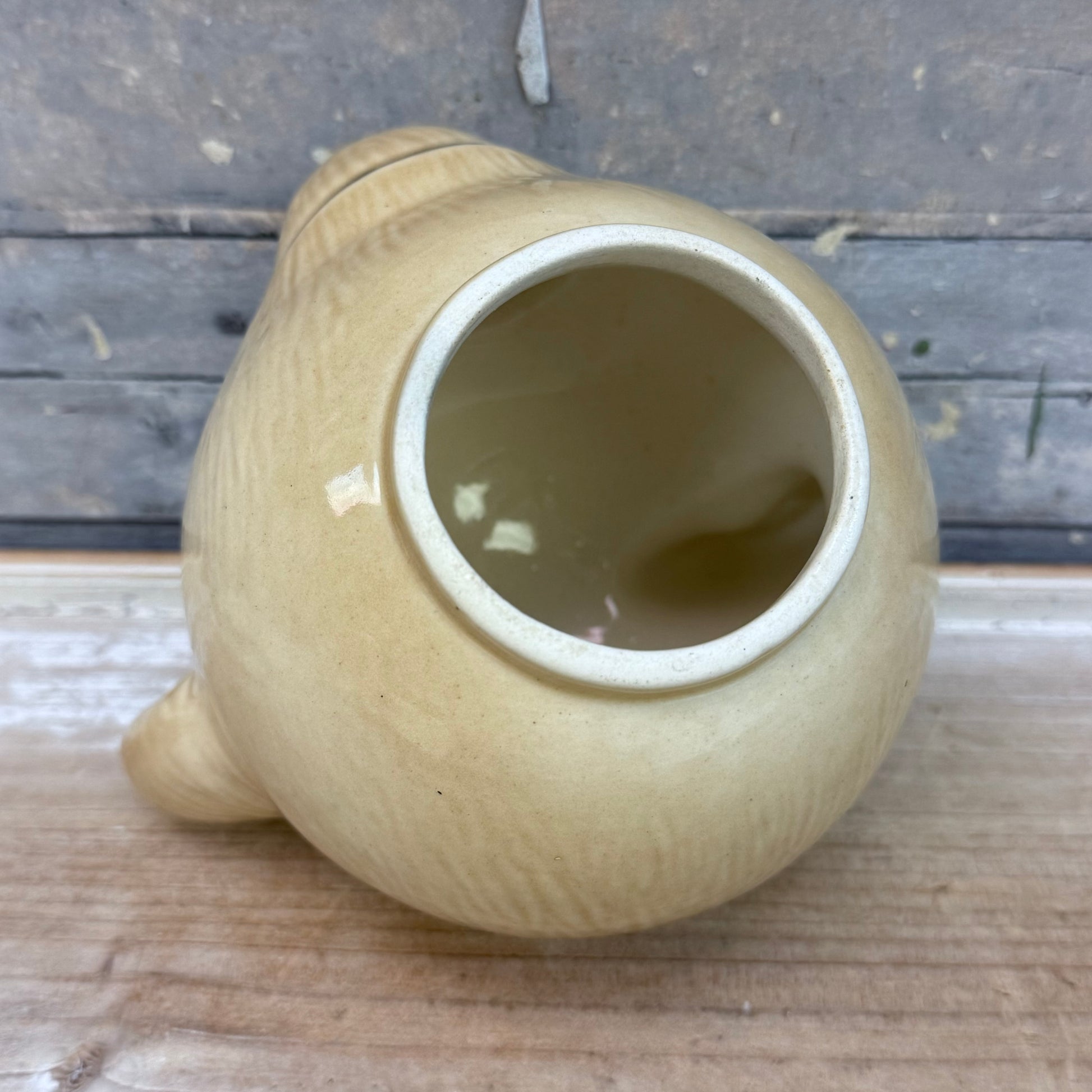 Add a dash of vintage charm to your home with this 1950s Metlox California Teddy Bear Ceramic Cookie Jar—a delightful example of mid-century American pottery. This tan ceramic bear, complete with a cheerful red bow tie and friendly expression, was lovingly crafted during the golden era of Metlox’s production. Measuring 8”x7”x11”, it’s both functional and decorative, perfect for storing sweet treats or simply adding character to your kitchen. In good vintage condition with only minor wear consistent with age and use, it bears the original maker’s mark on the underside, confirming its authenticity. A nostalgic treasure for collectors and lovers of retro style alike.