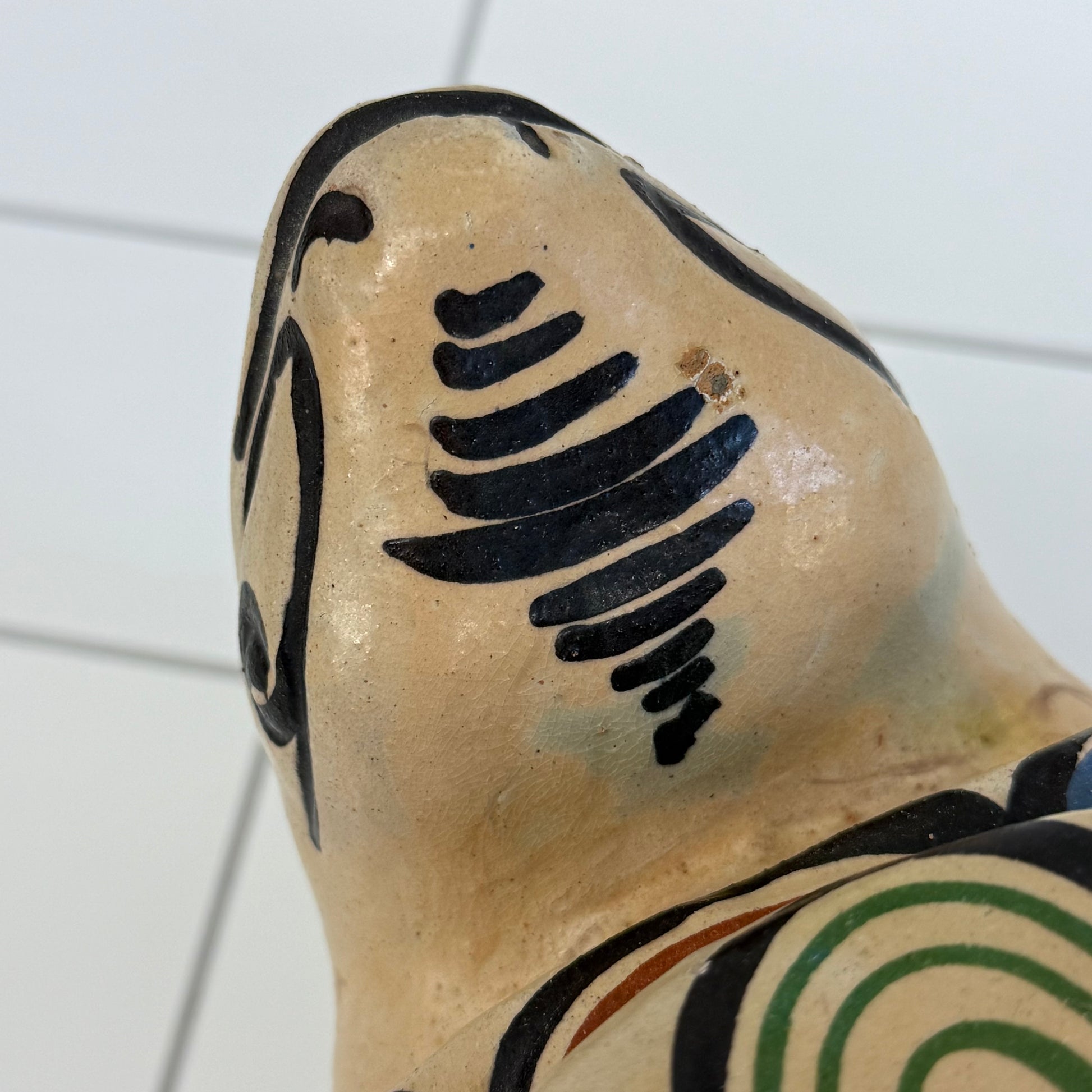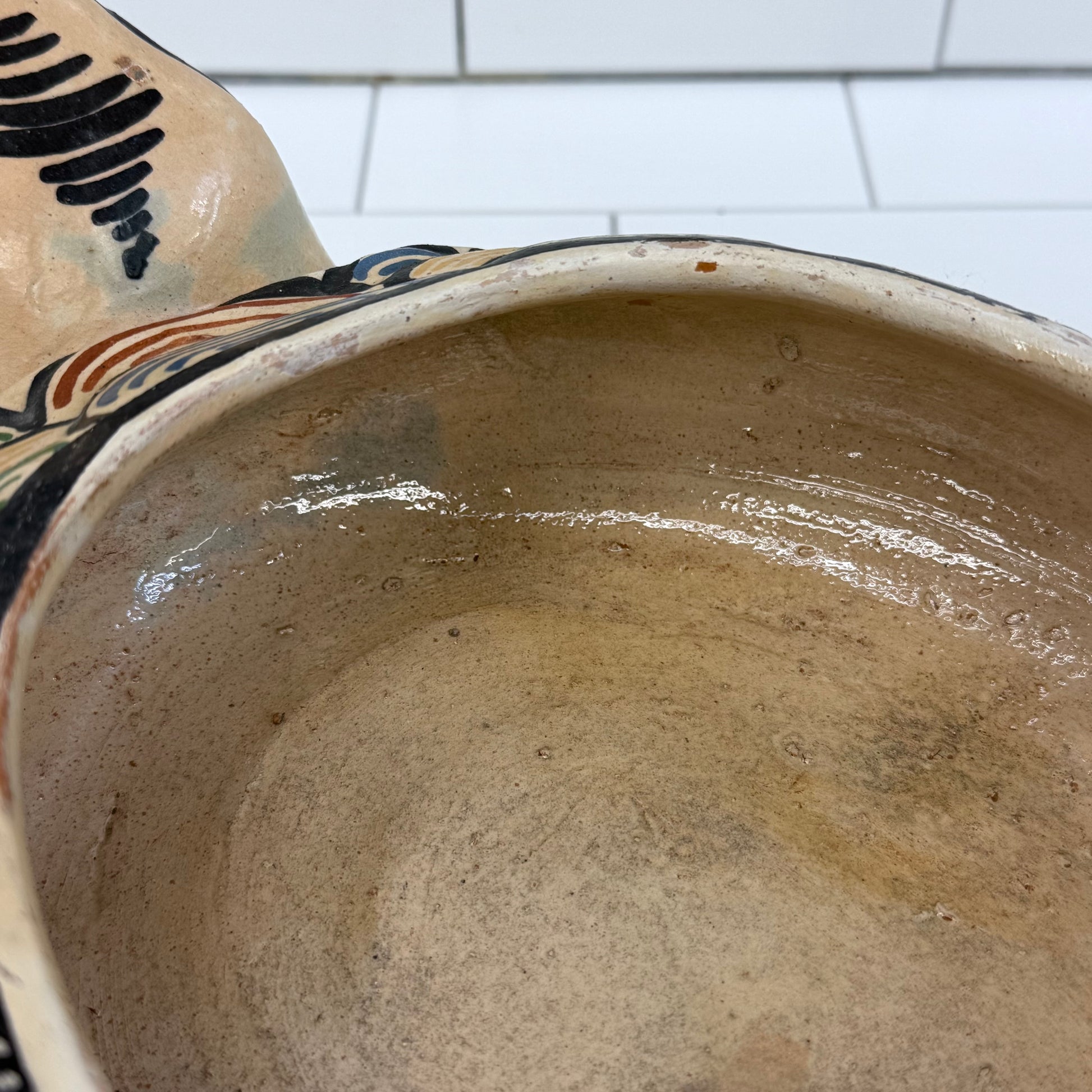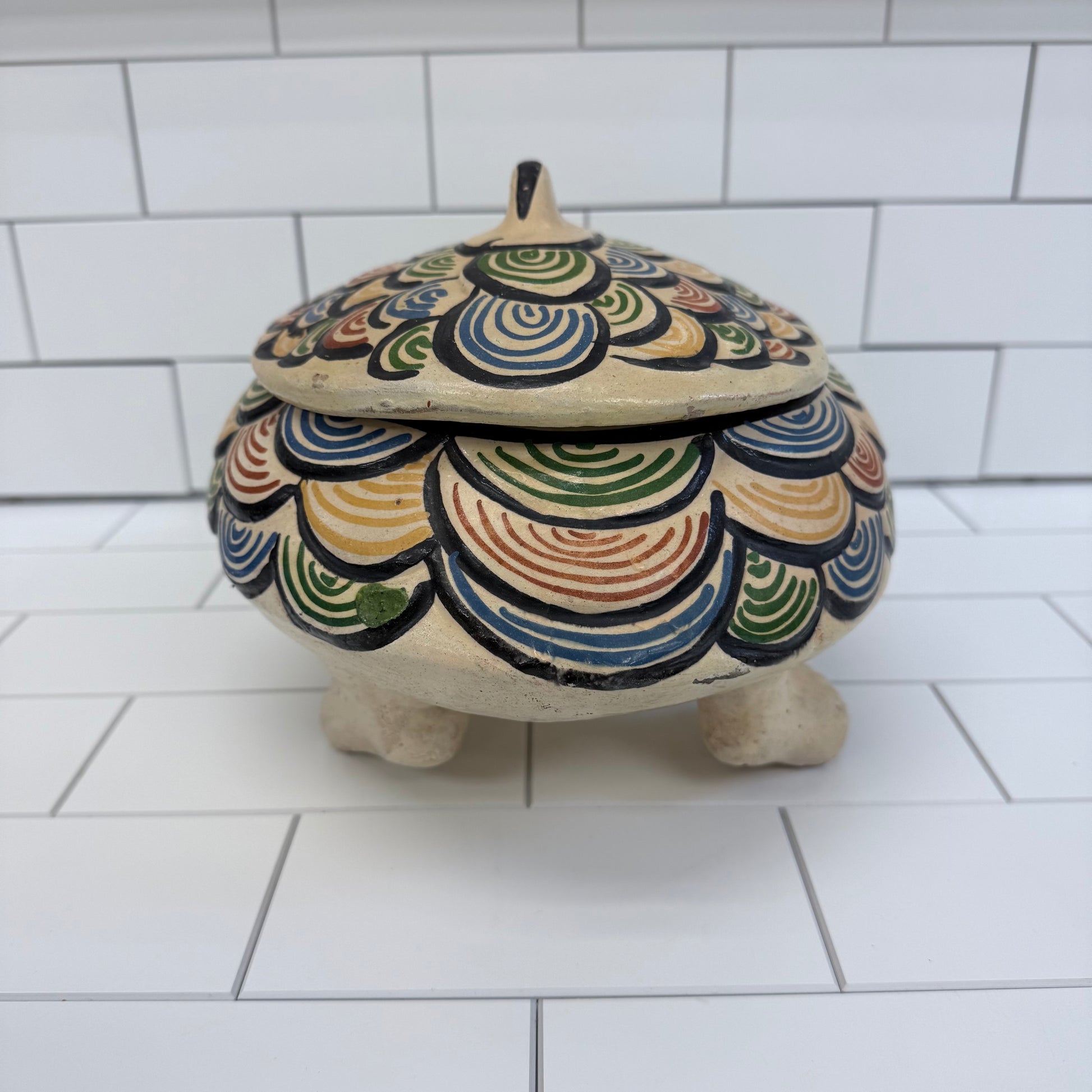 Bring vibrant folk art flair to your table with this whimsical Mexican Tlaquepaque Ceramic Turtle-Shaped Lidded Tureen. Hand-painted in bold, earthy tones with charming detail, this 6 lb ceramic piece is both functional and full of personality. Measuring 14”x9”x8”, it’s a standout example of traditional Tlaquepaque craftsmanship, blending playful design with rich cultural artistry. In good vintage condition with minor wear from age and use, it’s perfect as a serving piece, centerpiece, or unique collectible for lovers of Mexican folk art.
