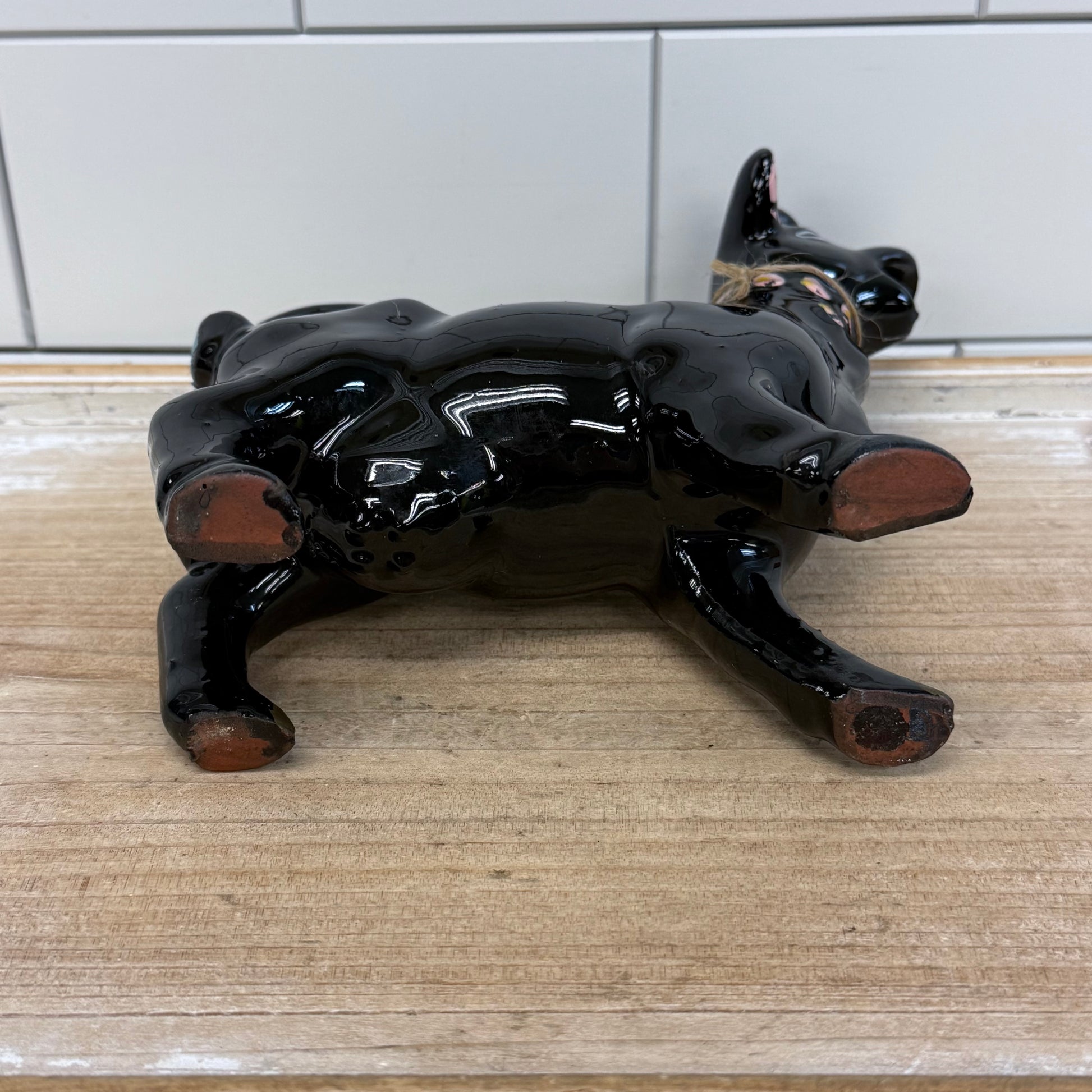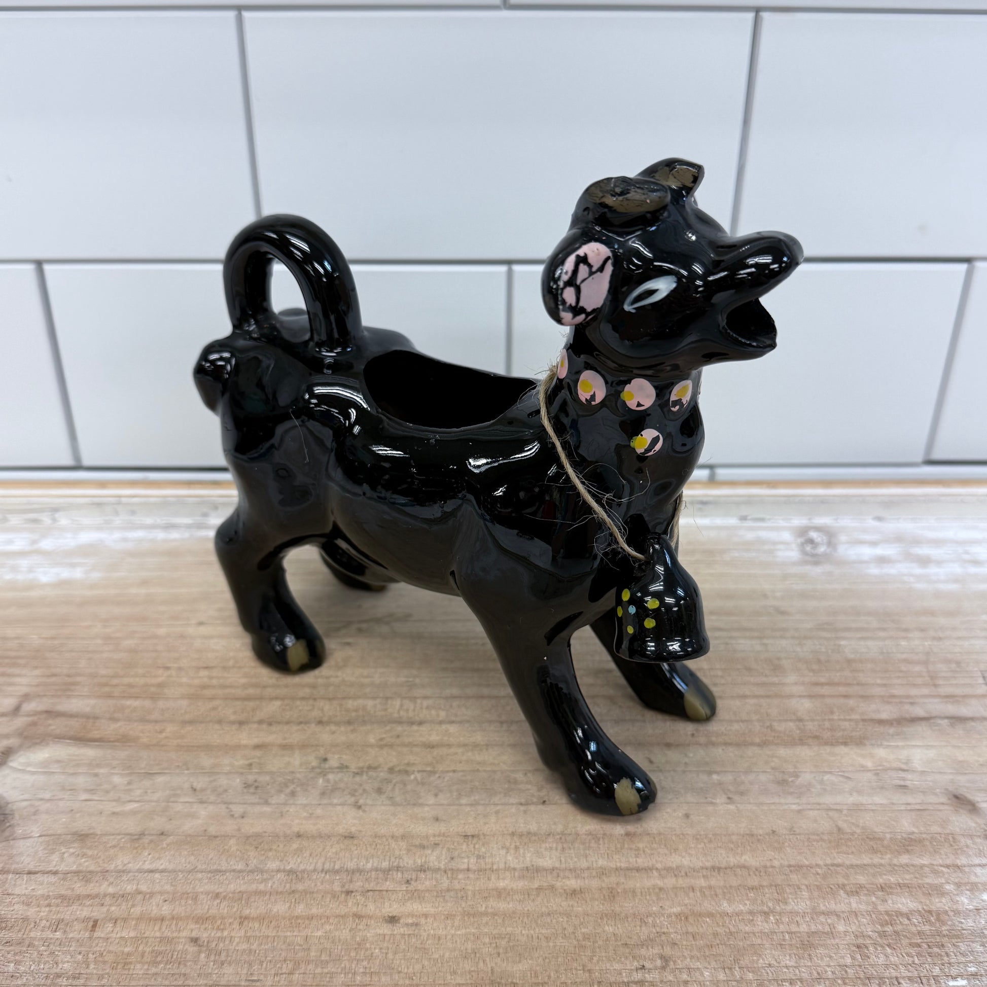 Add rustic charm to your kitchen with this Cow with Bell Redware Pottery Creamer Pitcher. Measuring 6″×3″×6″, this hand-painted black pottery creamer features a delightful cow design complete with a tiny bell around its neck. The slightly worn paint and subtle chipping only enhance its vintage appeal, giving it that authentic farmhouse character collectors love. In good vintage condition with minor wear consistent with age and use, it’s a perfect decorative accent or functional piece for serving with style.