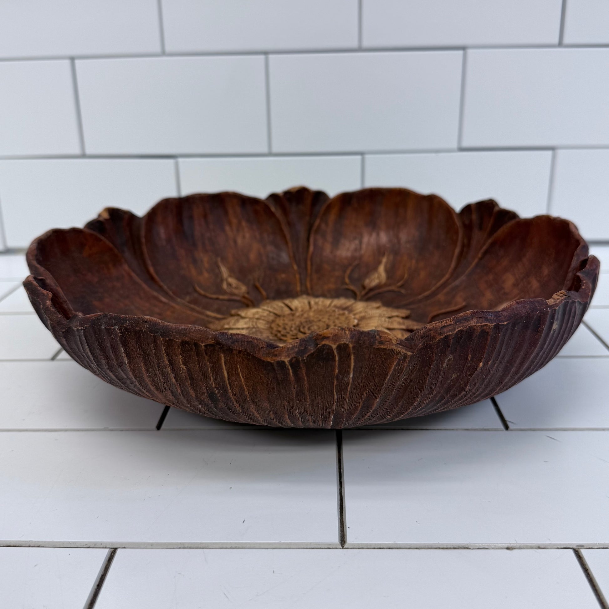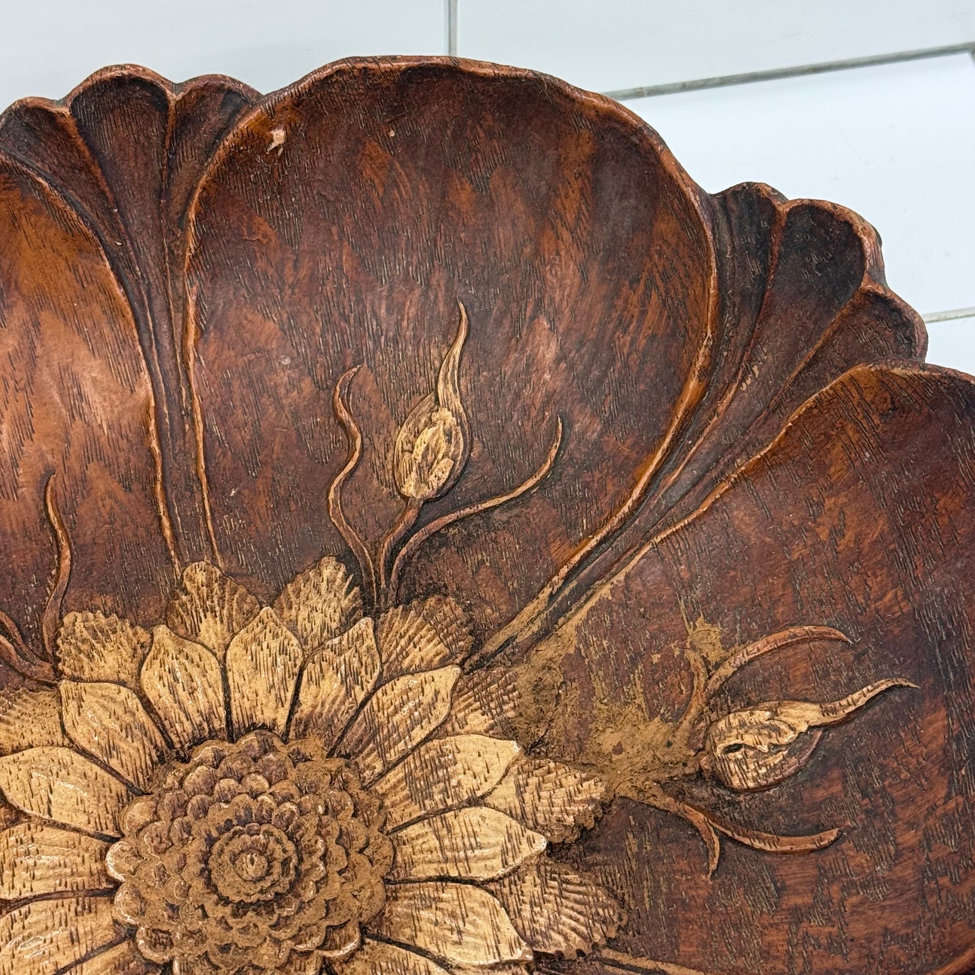 Bring classic mid-century decorative style into your home with this vintage flower motif bowl by Multi Products Inc., crafted in 1946 using Syroco wood composite. Known for producing intricately molded decorative pieces that mimic hand-carved wood, Syroco (Syracuse Ornamental Company) designs were widely popular in American homes for their rich detail and durability. This bowl features a beautifully sculpted floral center with radiating petals and organic leaf forms, all finished in a warm wood-tone patina that enhances its carved appearance. Ideal as a decorative centerpiece, catchall, or wall display, this piece reflects the craftsmanship and design sensibilities of the post-war era. Offered in good vintage condition with minor wear consistent with age and use.