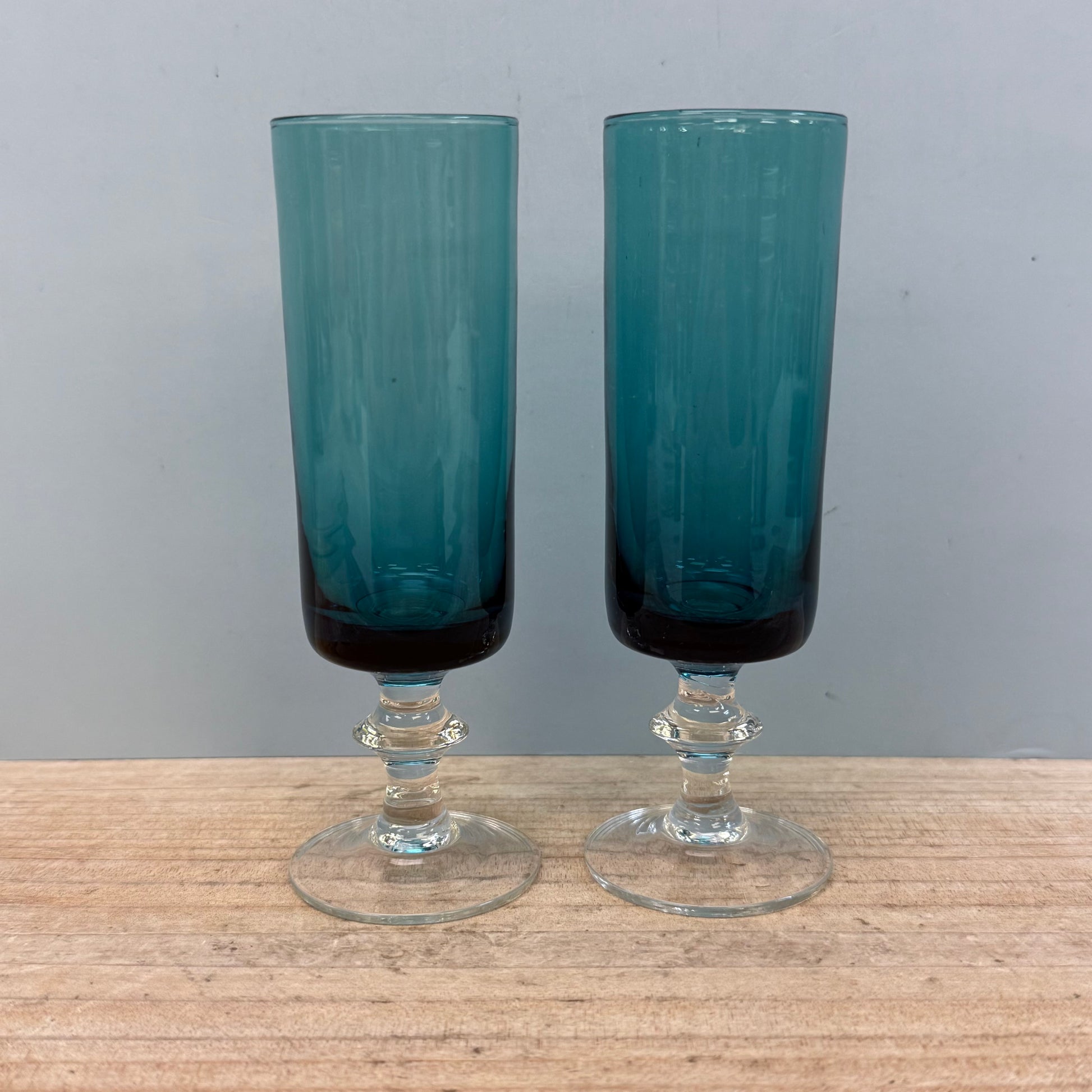 Keywords: blue glassware, champagne flutes, vintage glasses, peacock blue, Sasaki style, clear stem, elegant barware, cocktail glasses, colored glass, glass flute set