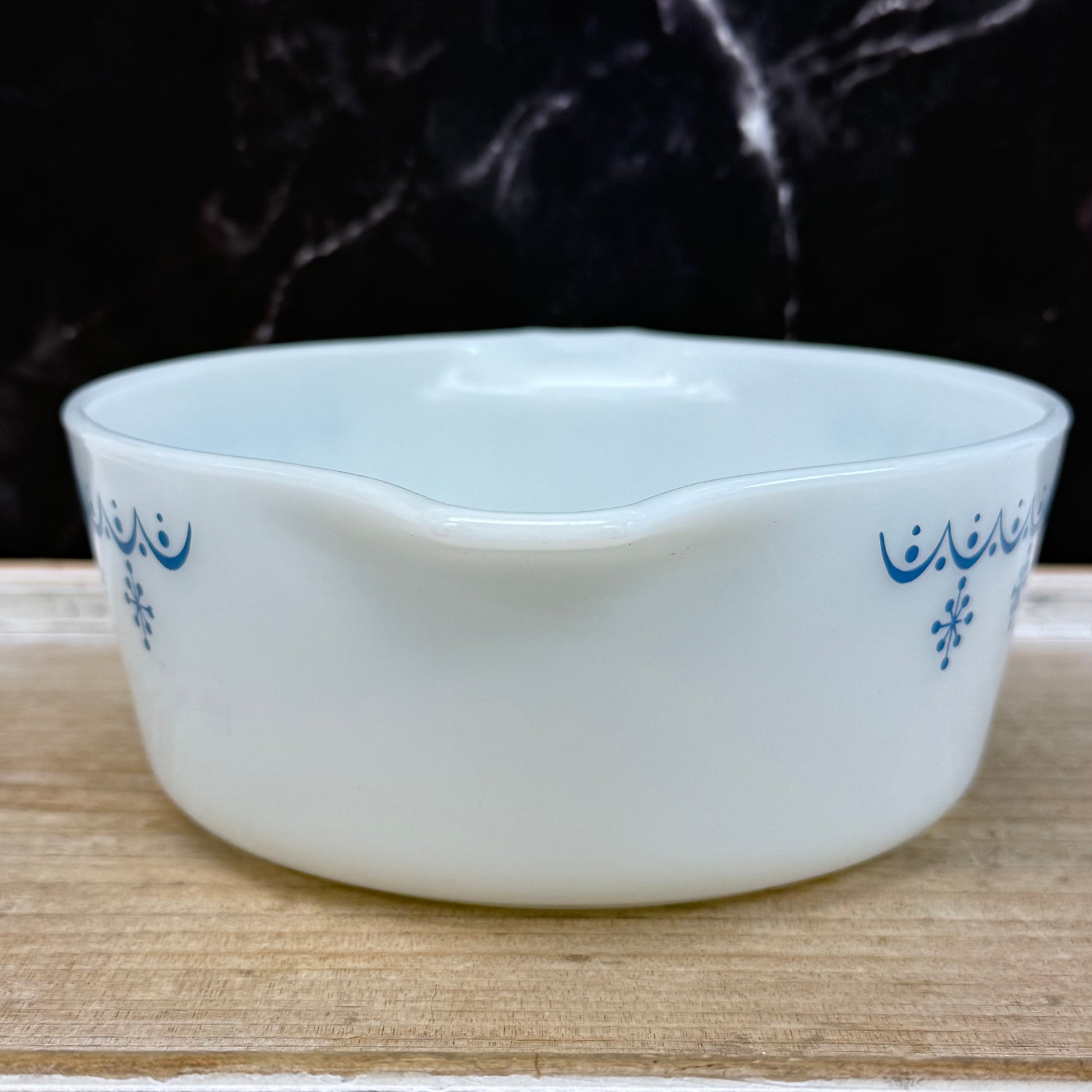 Charming and instantly recognizable, this Pyrex Snowflake Blue casserole dish is a classic example of mid-century American kitchenware. Featuring the beloved white snowflake motif against a soft robin’s-egg blue ground, this 1.5-pint #472 casserole reflects the optimistic, practical design sensibility of the late 1950s–early 1960s. Made of durable oven-safe glass and marked on the underside, it was designed to move seamlessly from oven to table, blending everyday utility with iconic style. Offered in good vintage condition with minor wear consistent with age and use. Measures approximately 8” x 6” x 3”, making it ideal for small bakes, side dishes, or display within a curated Pyrex collection.