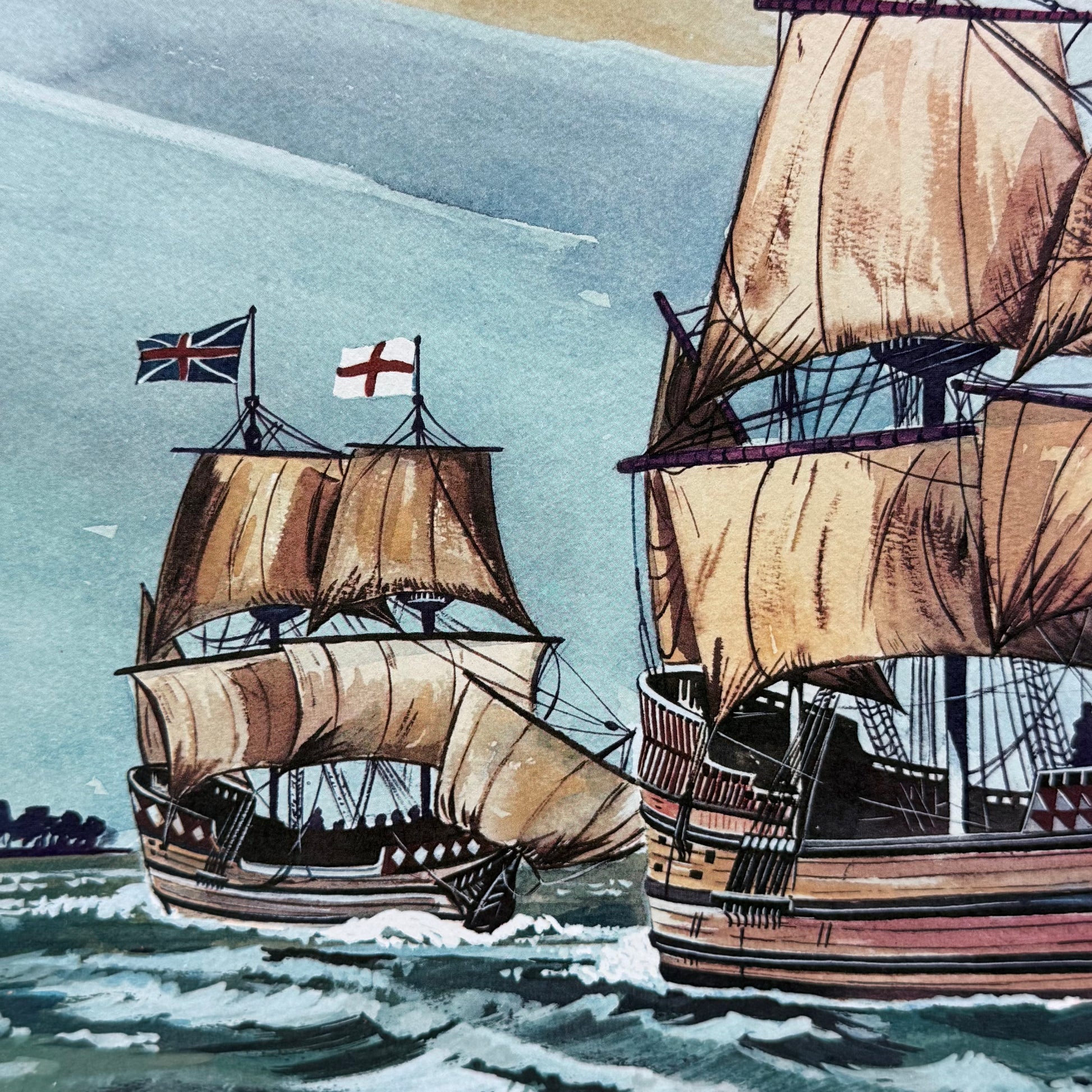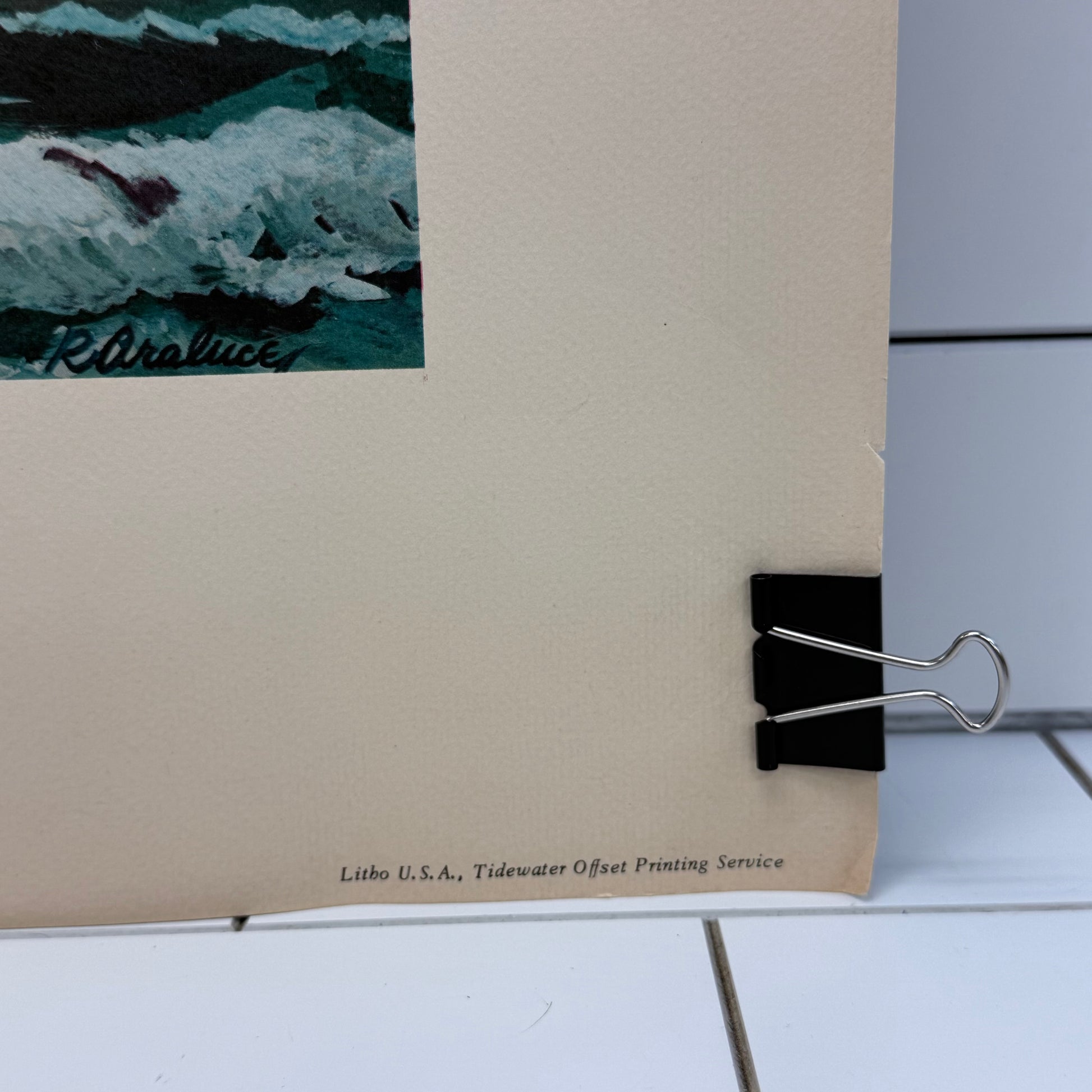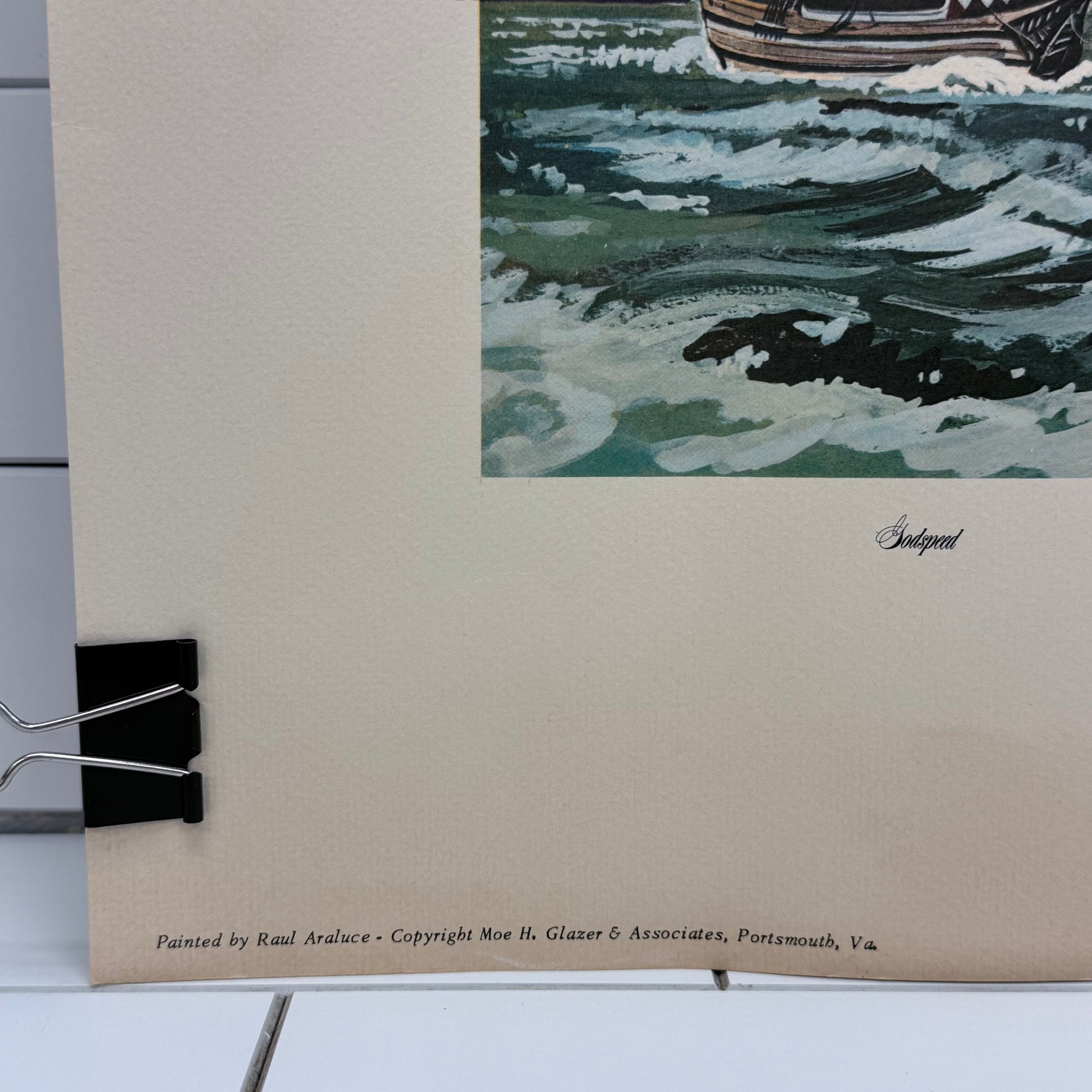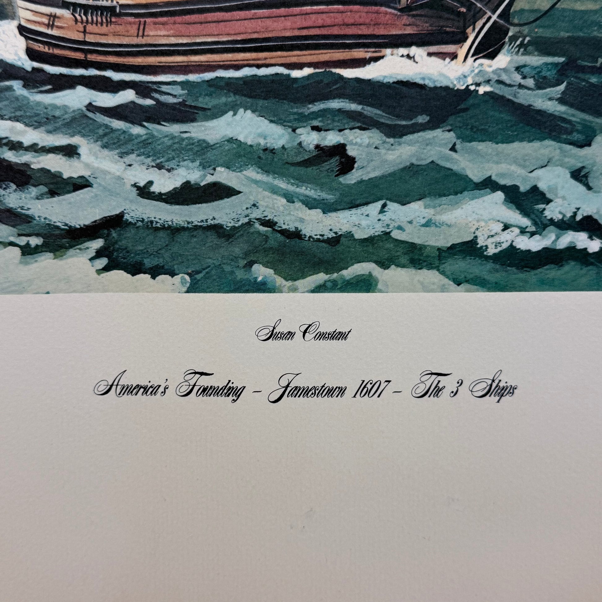 This Raul Araluce “The Three Ships – Jamestown 1607” art lithograph captures one of the most pivotal moments in early American history, depicting the Susan Constant, Godspeed, and Discovery as they arrive in Virginia in 1607. Known for his detailed maritime and historical scenes, Raul Araluce brings dramatic movement and period authenticity to this richly composed print, making it especially meaningful for collectors of Jamestown, Colonial Williamsburg, and early American historical artwork. This vintage lithograph features an offset printed signature, maintaining the artist’s recognizable mark while offering an accessible and display-ready piece. Ideal for history enthusiasts, nautical art collectors, Virginia heritage décor, or those drawn to maritime exploration themes, this framed-size print delivers strong visual impact in a manageable format. Good vintage condition with minor wear consistent with age and use, preserving its collectible appeal.
