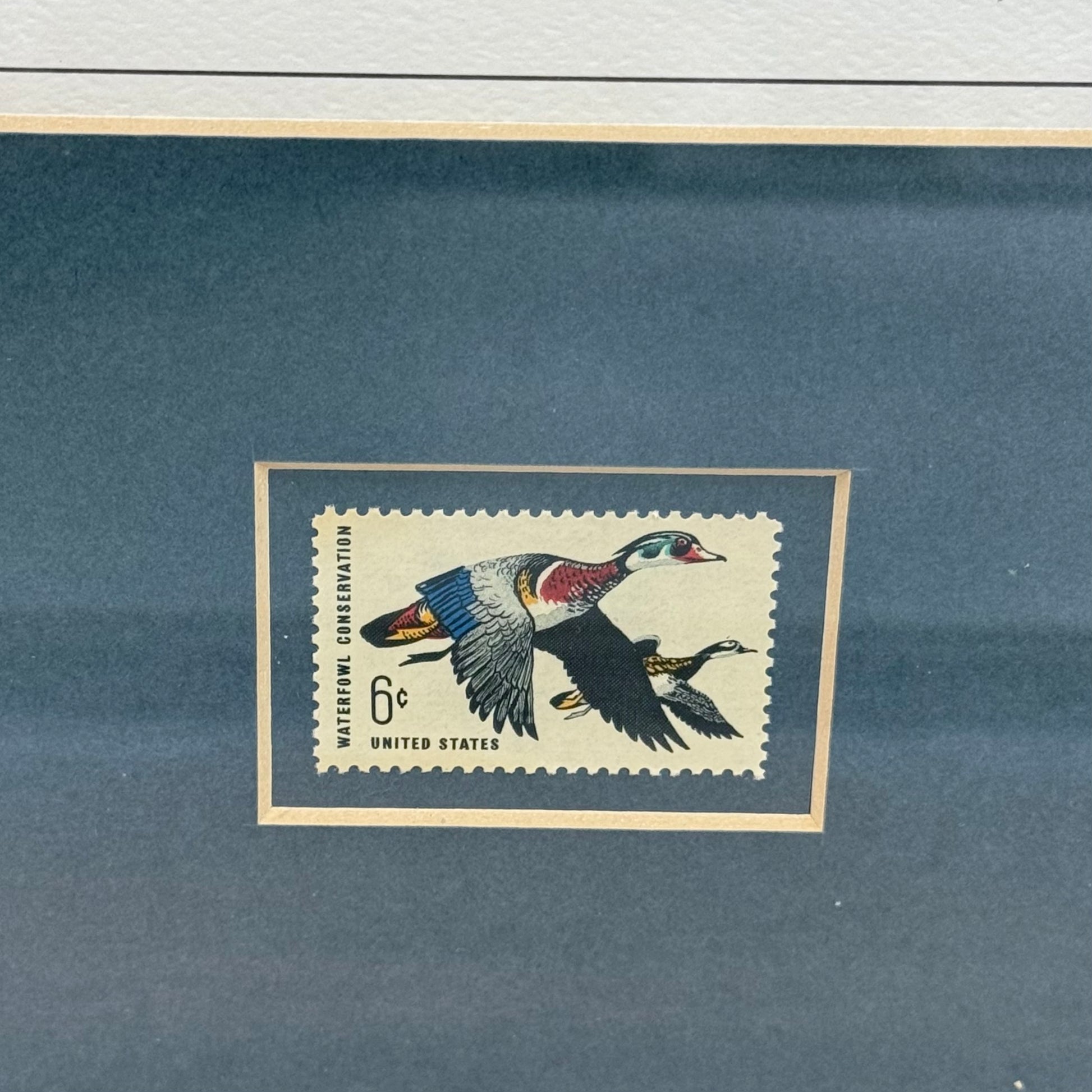 Celebrate the beauty of North American wildlife with this Richard Sloan Framed Duck Art Print with Stamp, Signed 1981. Featuring a masterful depiction of waterfowl, this print includes an offset signature by Richard Sloan in the bottom right corner, dated 1981, and is paired with a 1968 Wood Duck Waterfowl Conservation Stamp. In great vintage condition, this framed piece is perfect for collectors of wildlife art, conservation memorabilia, or signed prints by renowned artists.