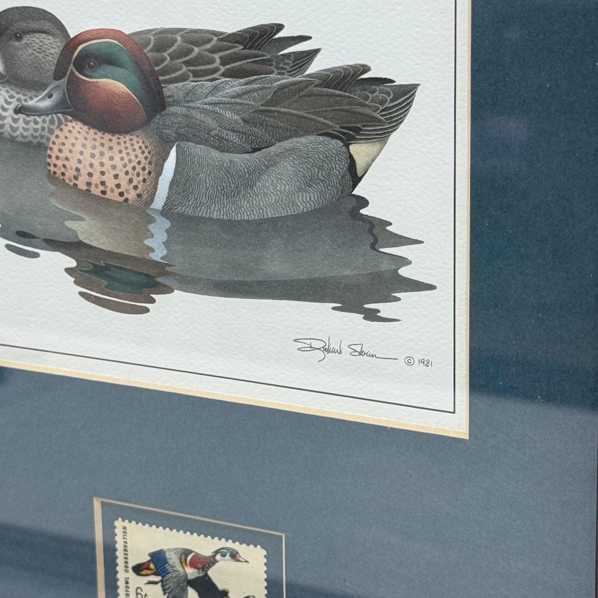 keywords: Richard Sloan, signed art print, duck artwork, wildlife print, 1981, waterfowl conservation stamp, vintage framed art, bird illustration, collectible wildlife art, nature decor